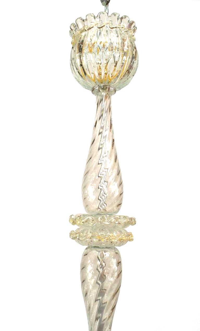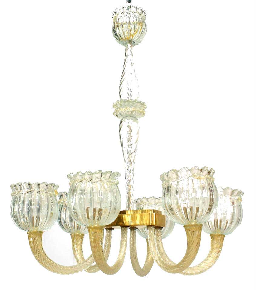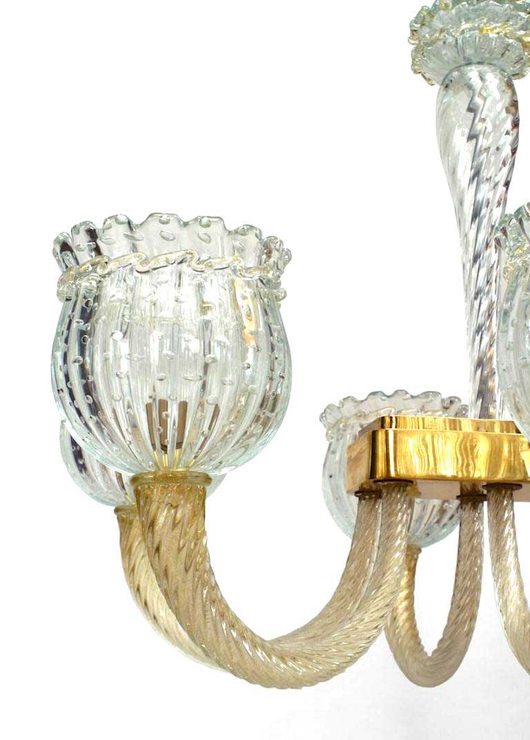 Italian (1940's) Murano chandelier with 6 swirl design gold dusted glass arms holding a large fluted clear bubble glass shade with scalloped top. (att: BAROVIER E TOSO).
