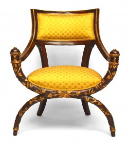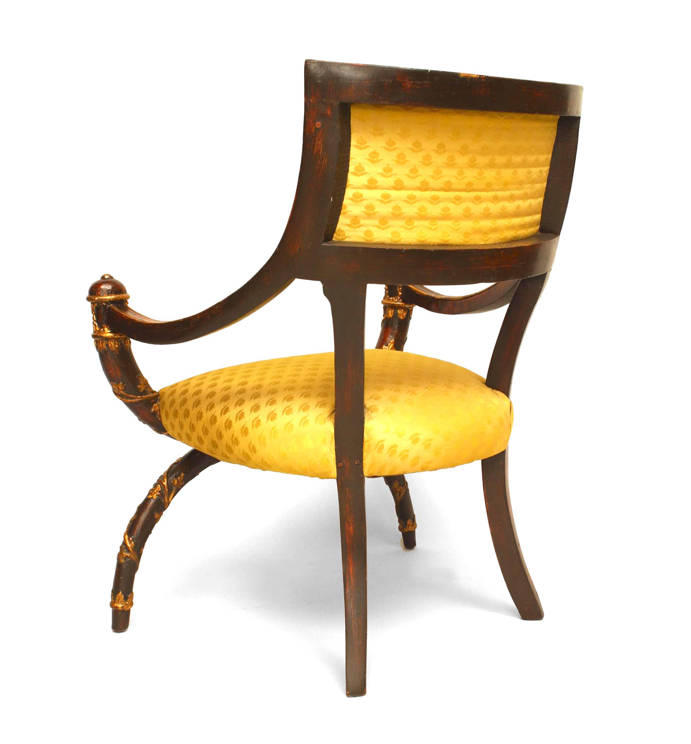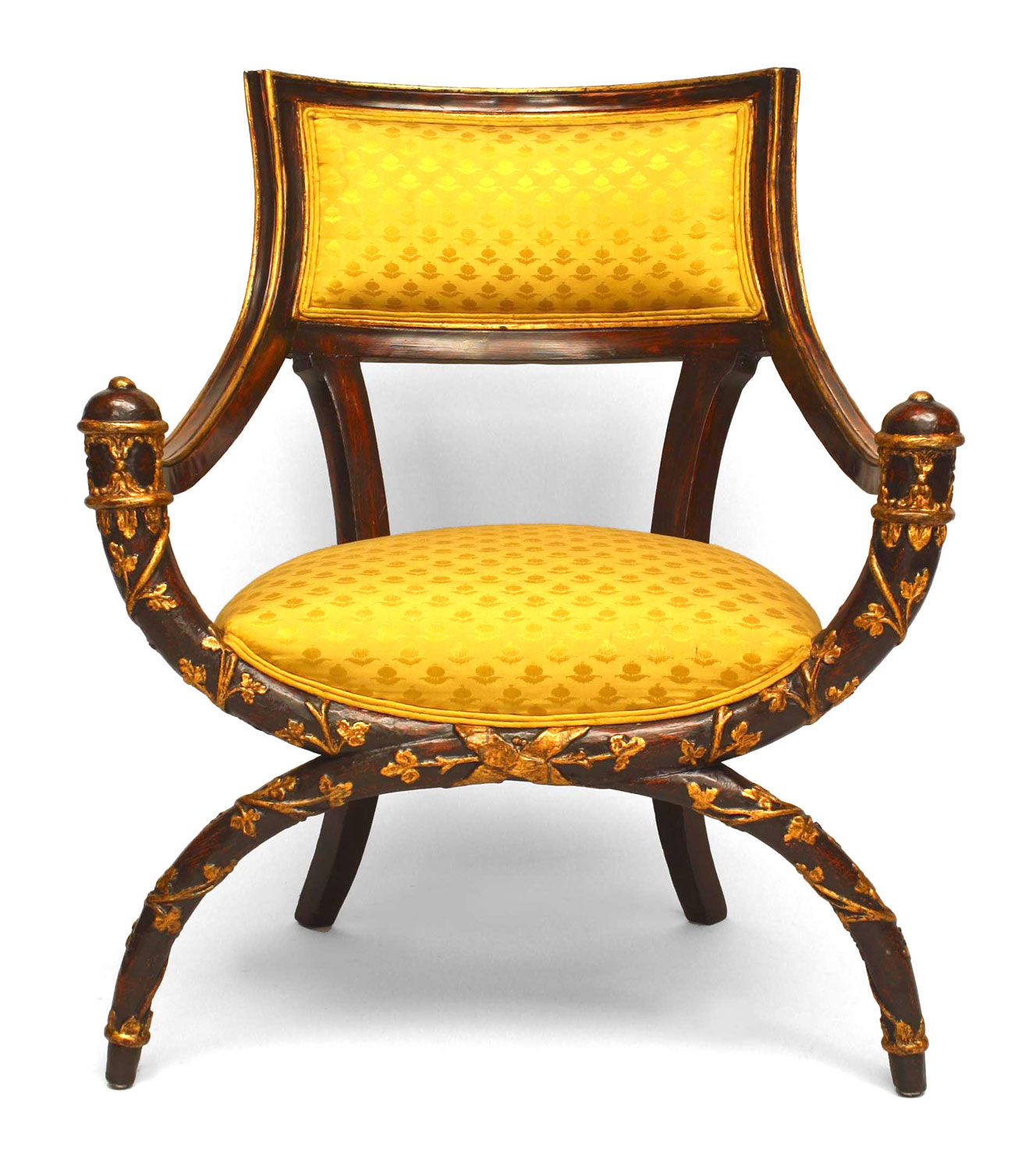 Italian Neoclassic-style (19th Century) X design maroon lacquered armchair with gilt floral trim and gold damask upholstery..