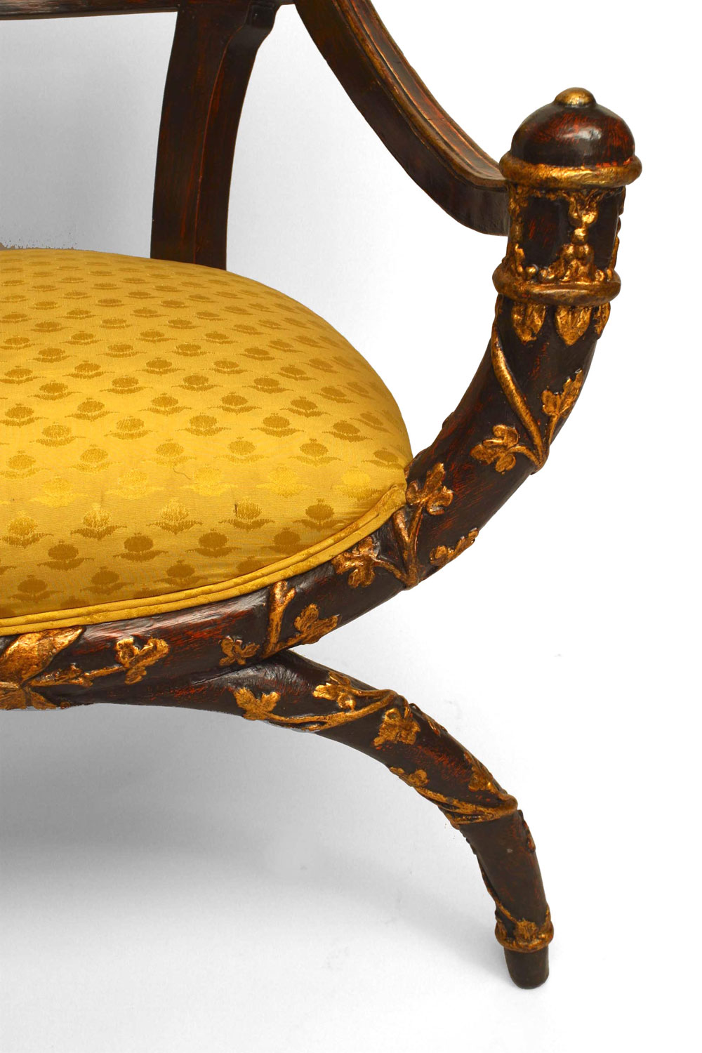 Italian Neoclassic-style (19th Century) X design maroon lacquered armchair with gilt floral trim and gold damask upholstery.