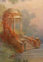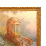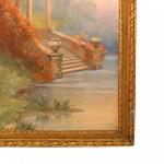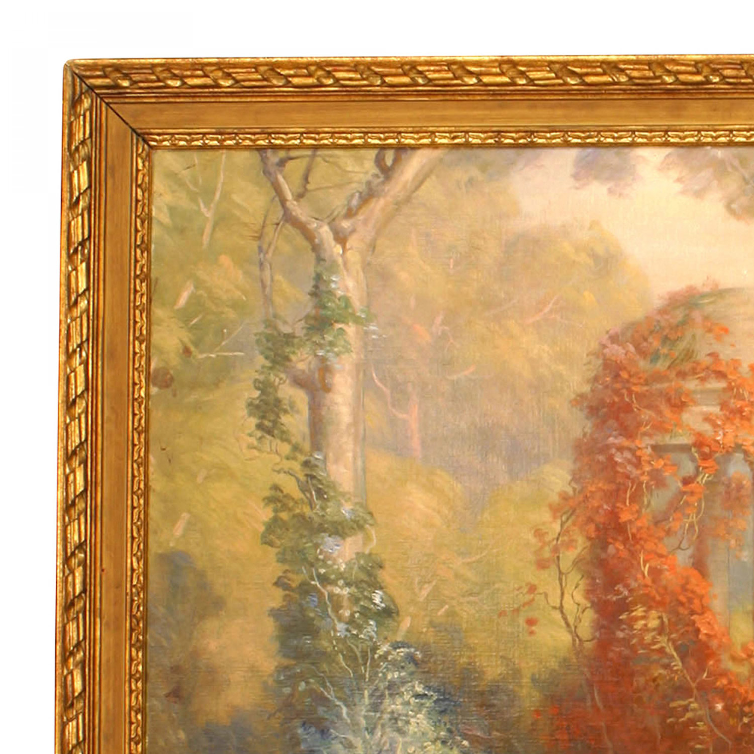 Italian Neo-classic (19/20th Cent) style gilt framed square oil vertical landscape painting of garden with gazebo.