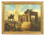 Italian Neo-Classic Hubert Robert-style (20th Century) landscape oil painting with figures and an equestrian statue of Marcus Aurelius near the Temple of Vespia in a rectangular carved giltwood frame..