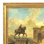Italian Neo-Classic Hubert Robert-style (20th Century) landscape oil painting with figures and an equestrian statue of Marcus Aurelius near the Temple of Vespia in a rectangular carved giltwood frame.