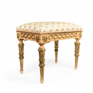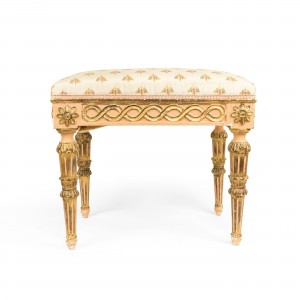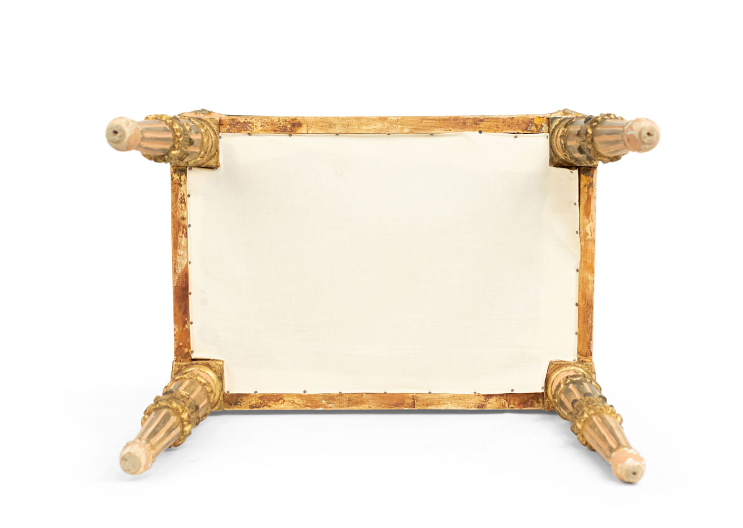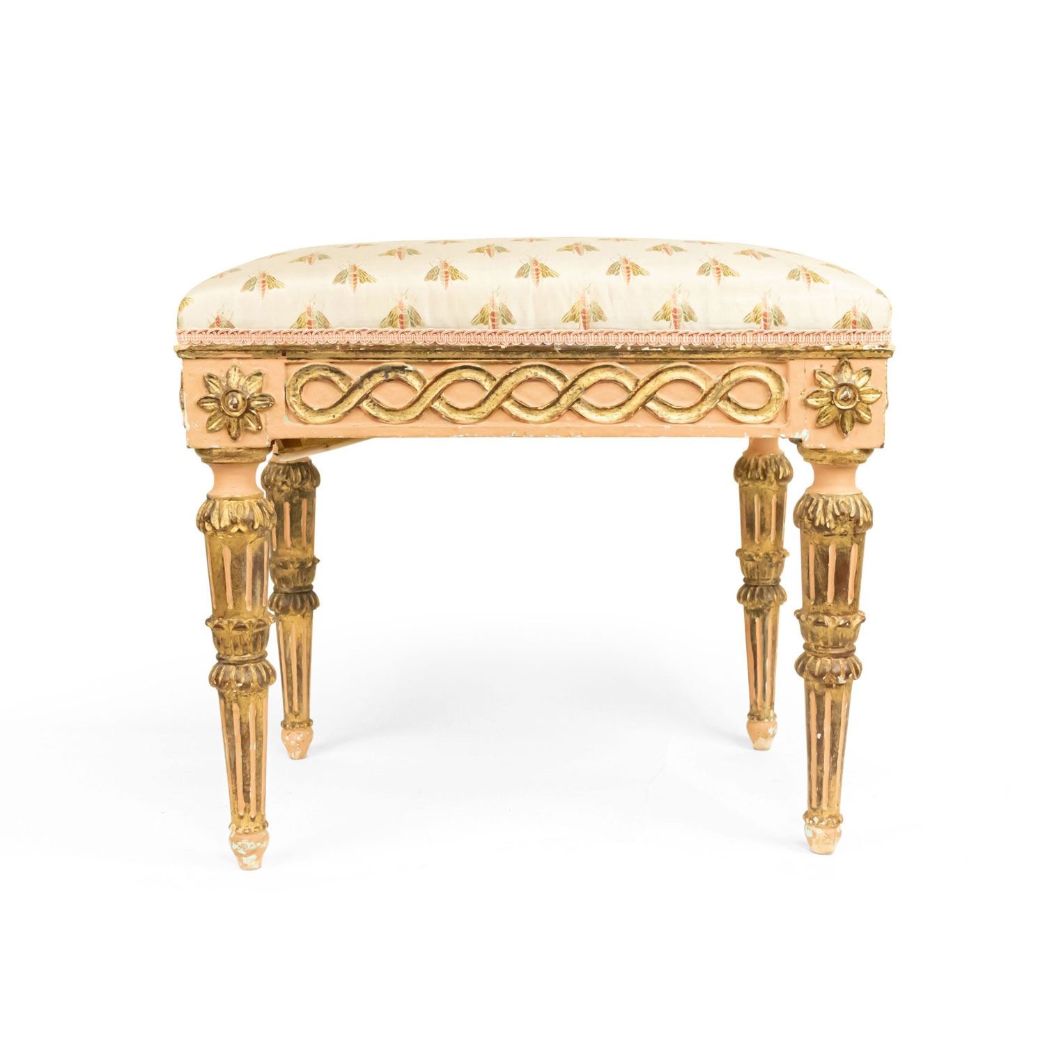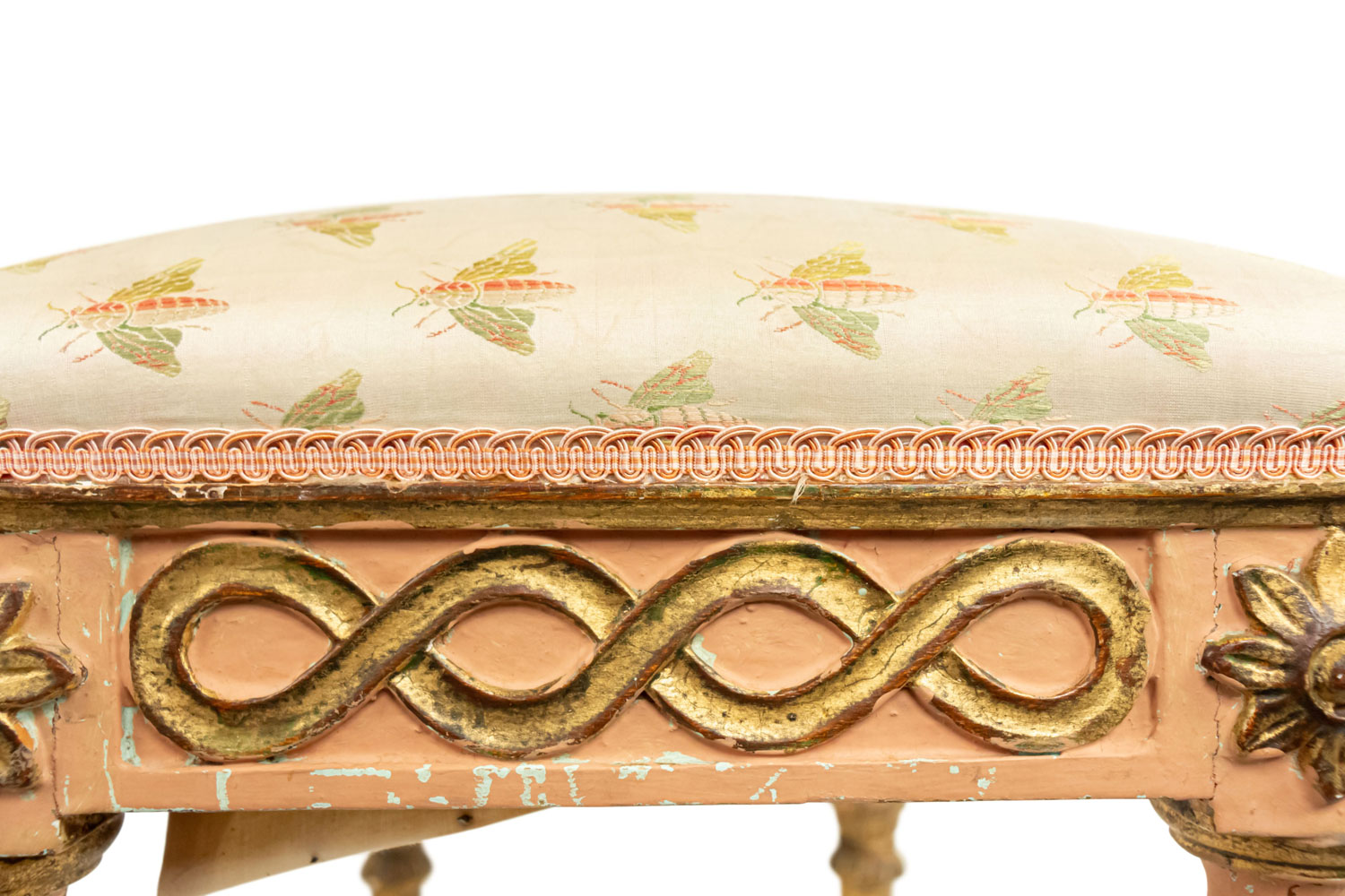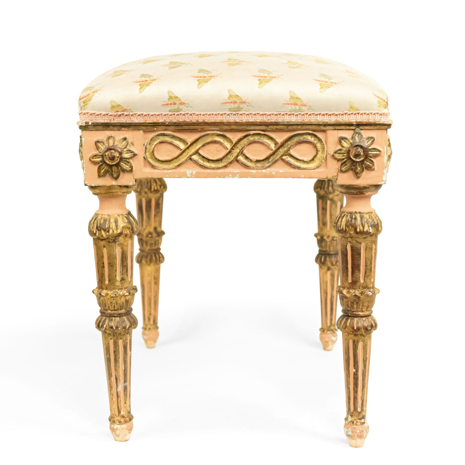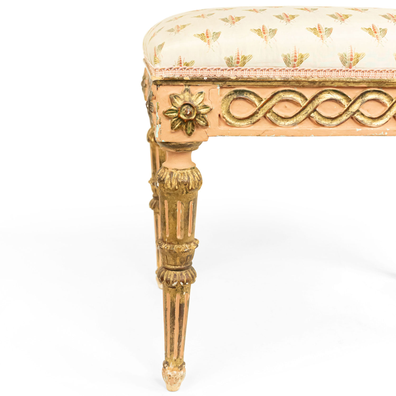 Italian Neo-classic (18th Century) pink painted and gilt trimmed rectangular bench with carved apron and legs and upholstered seat
