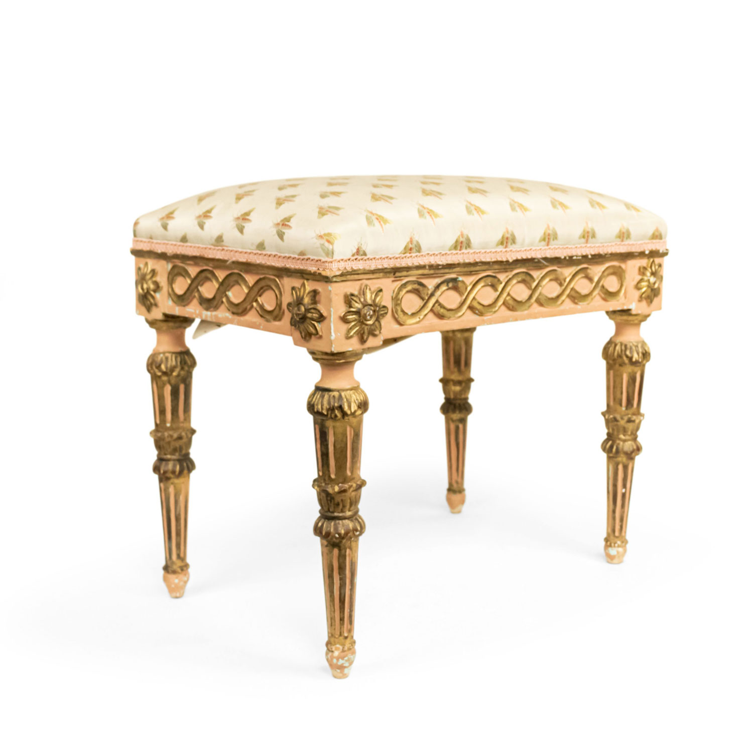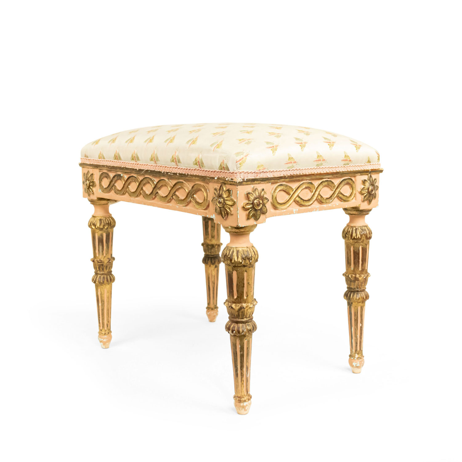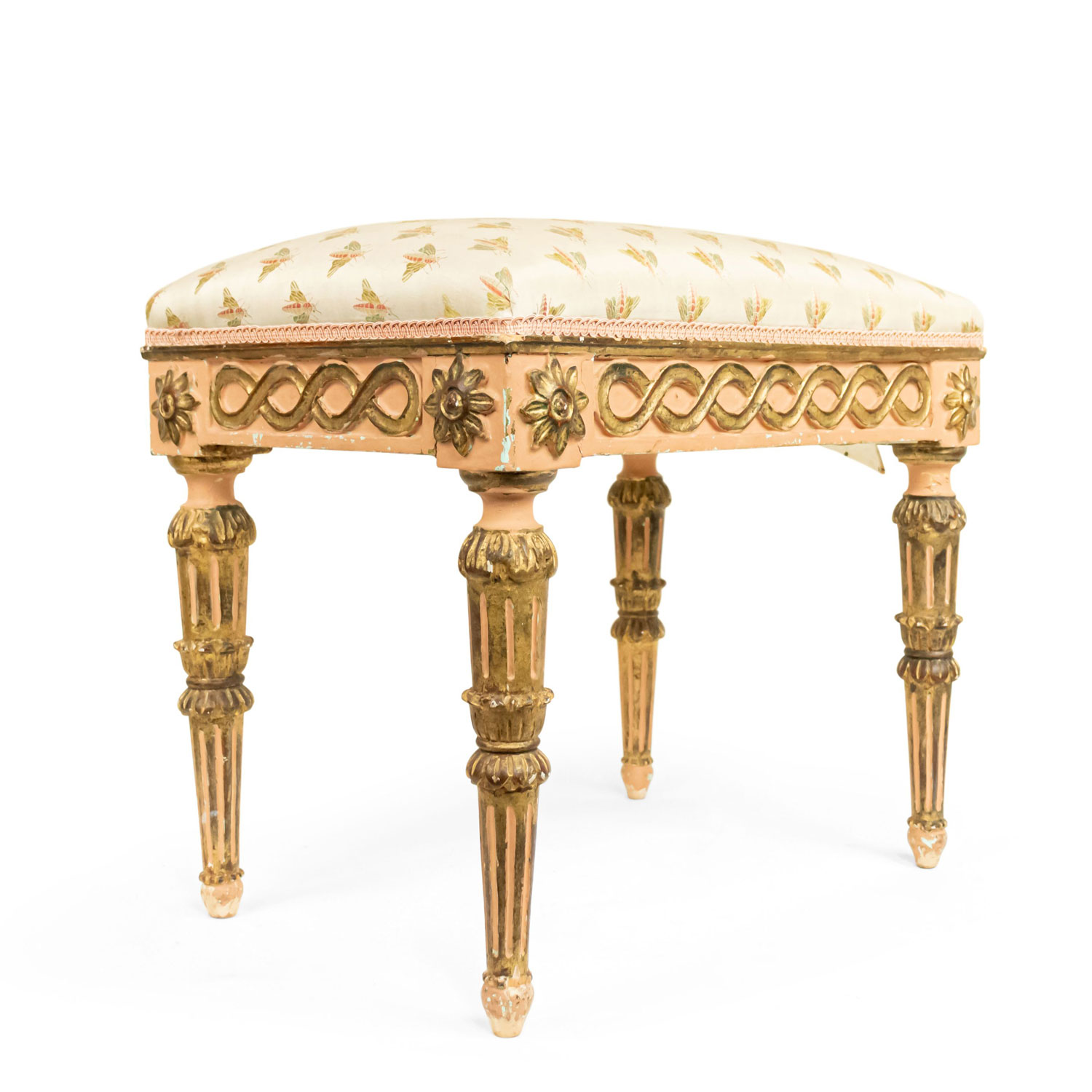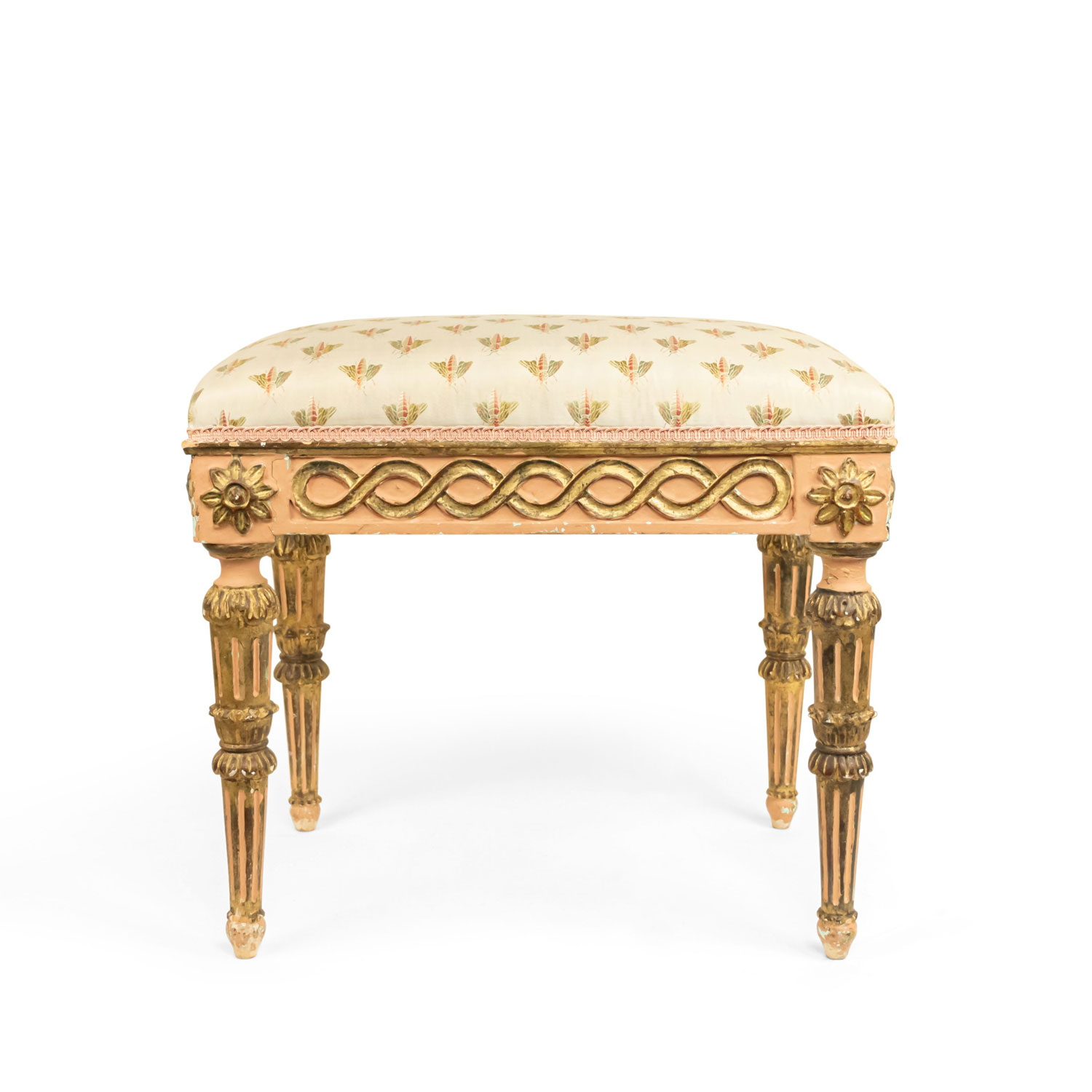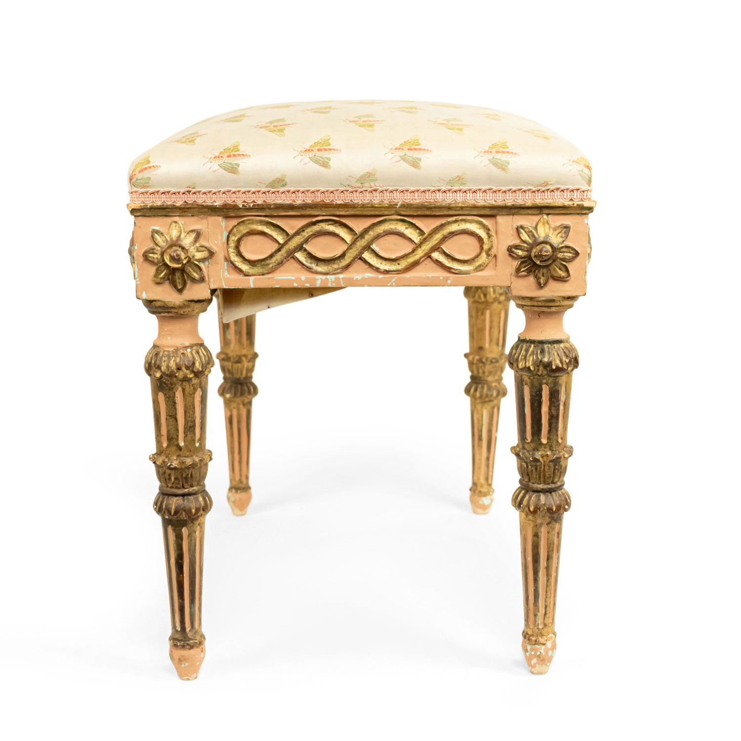 Italian Neo-classic (18th Century) pink painted and gilt trimmed rectangular bench with carved apron and legs and upholstered seat.