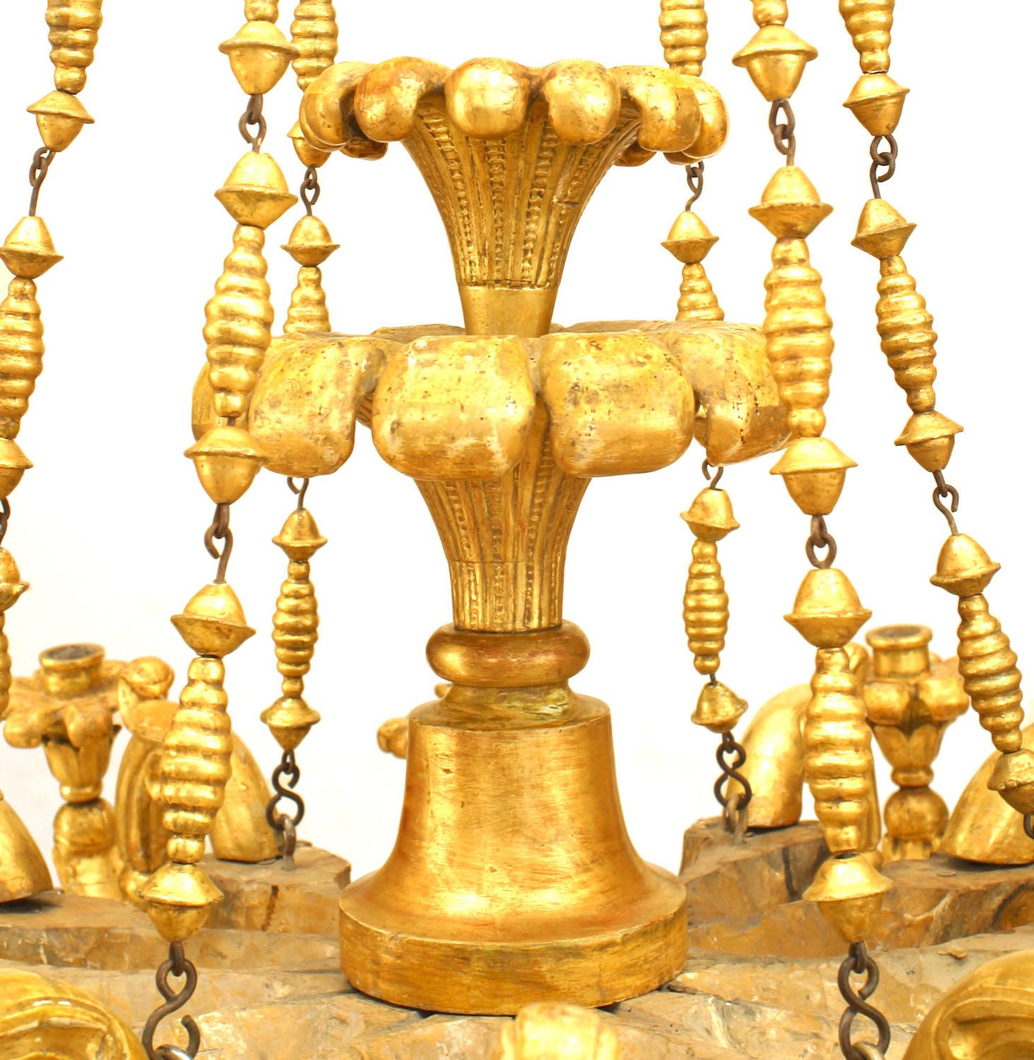 Italian Neo-classic (18/19th Century) gilt wood chandelier with 12 arms emanating from a carved fluted & floral round base with Egyptian heads & supported by 6 spool chains..