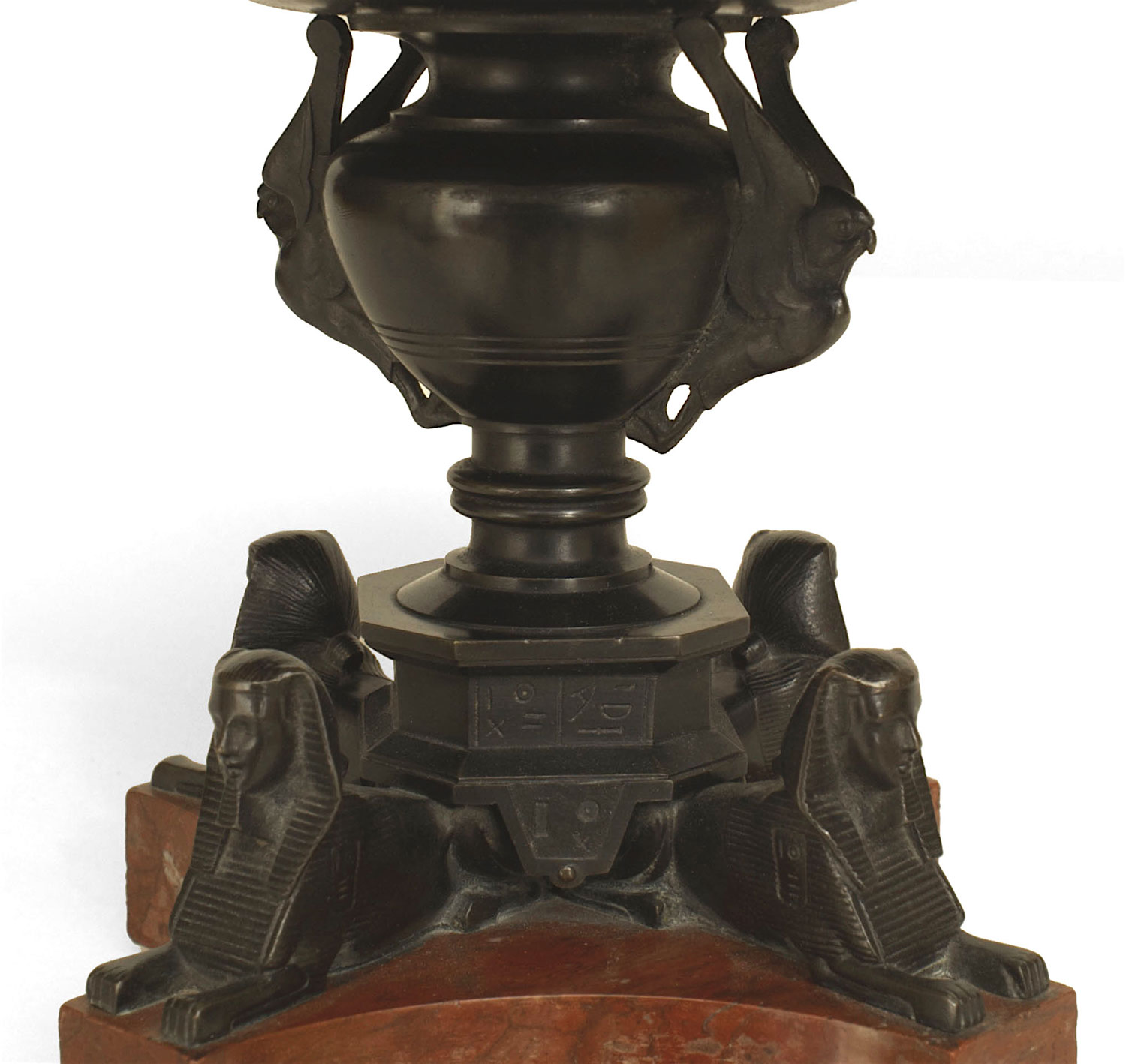 French Empire style (mid-19th Cent) "Grand Tour" bronze tazza resting on 4 sphinx figures over a griotte rouge marble base (possibly made by Henri Picard)