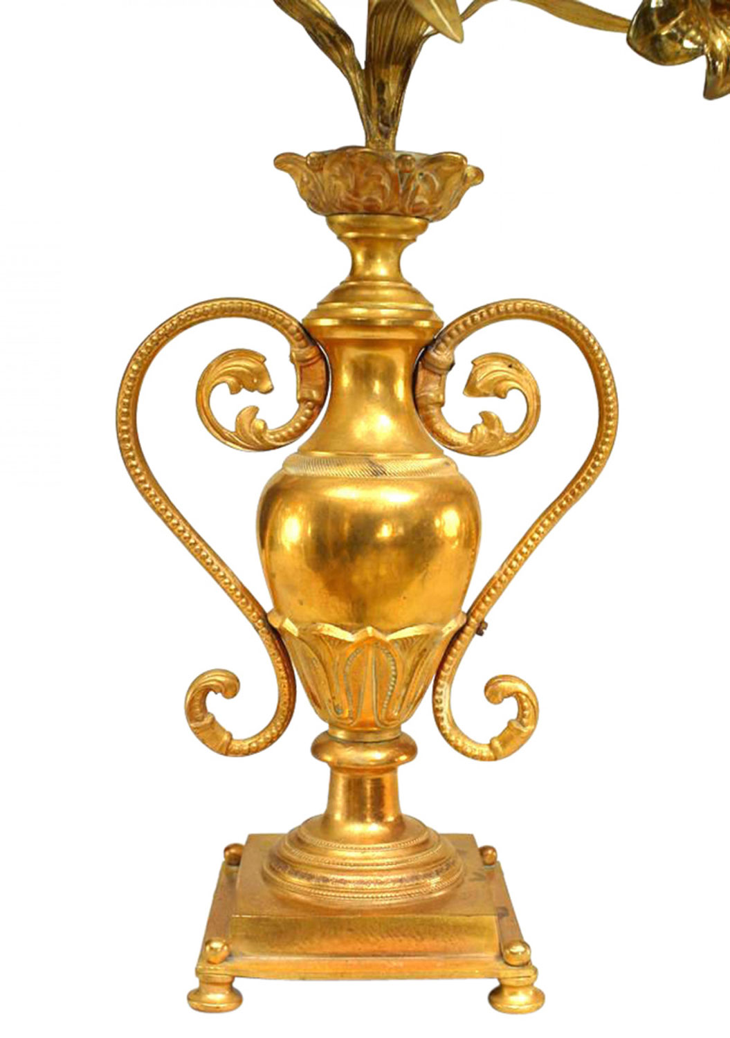 Italian Neo classic-style (19/20th Century) gilt bronze 6 floral light candelabra with multiple flowers supported by an urn with handles resting on a square base.