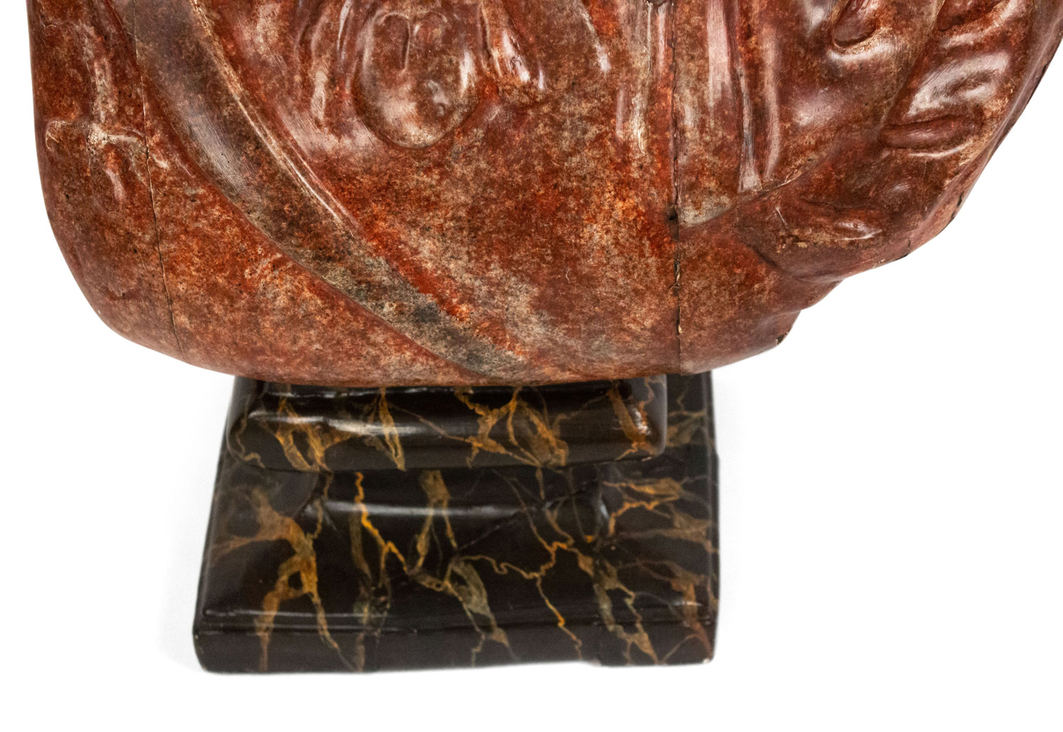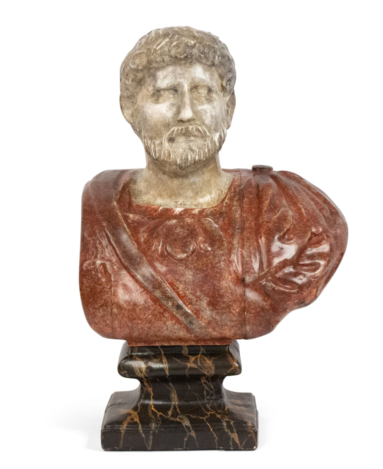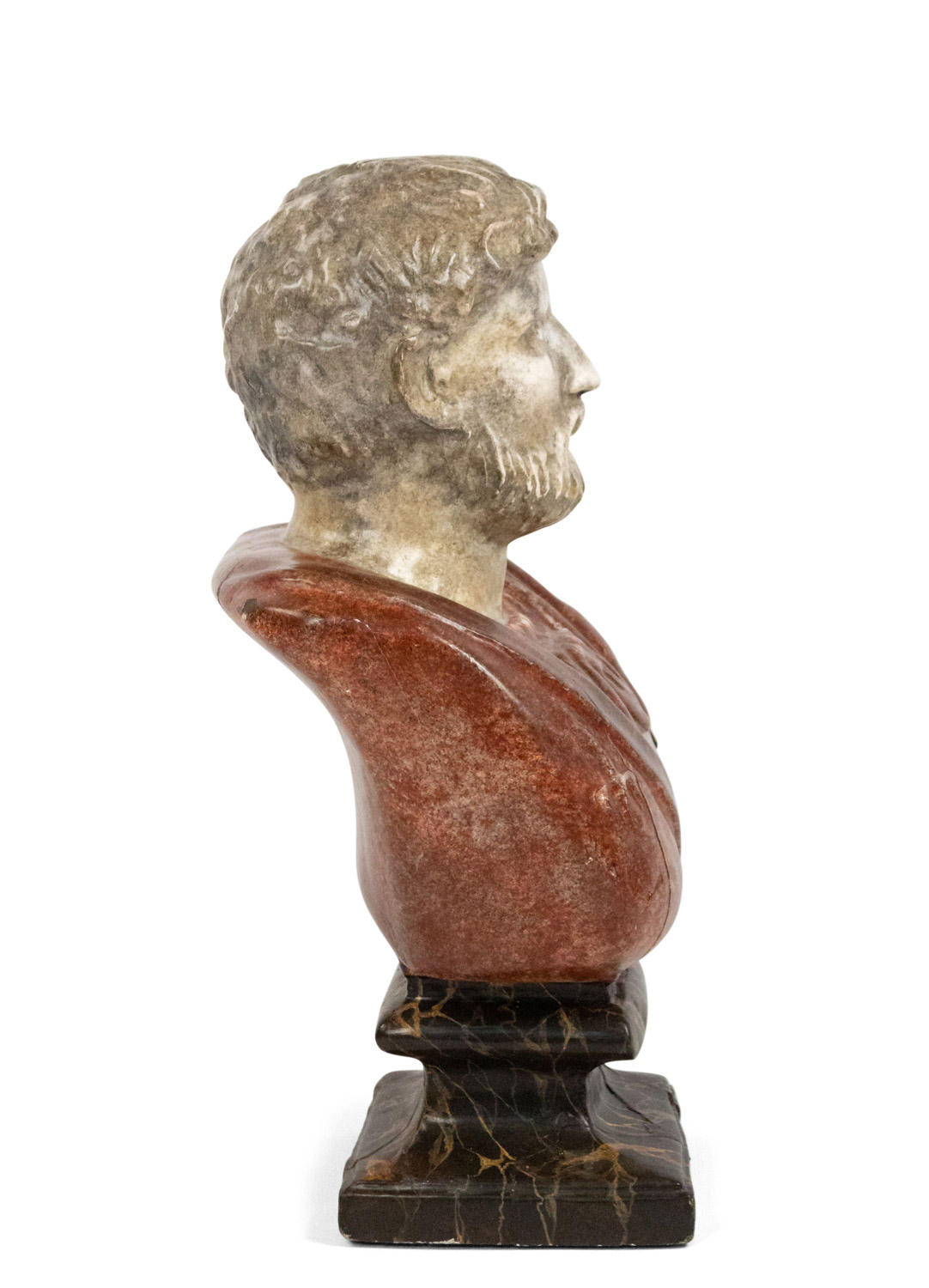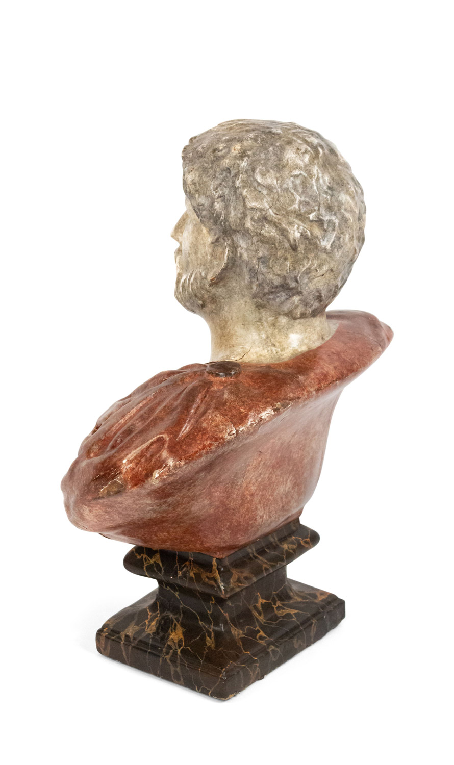 Italian Neo-Classic style (19/20th Cent) faux painted composition bust of a Roman Emperor wearing a red toga and mounted on a black square base.