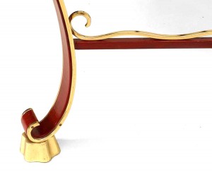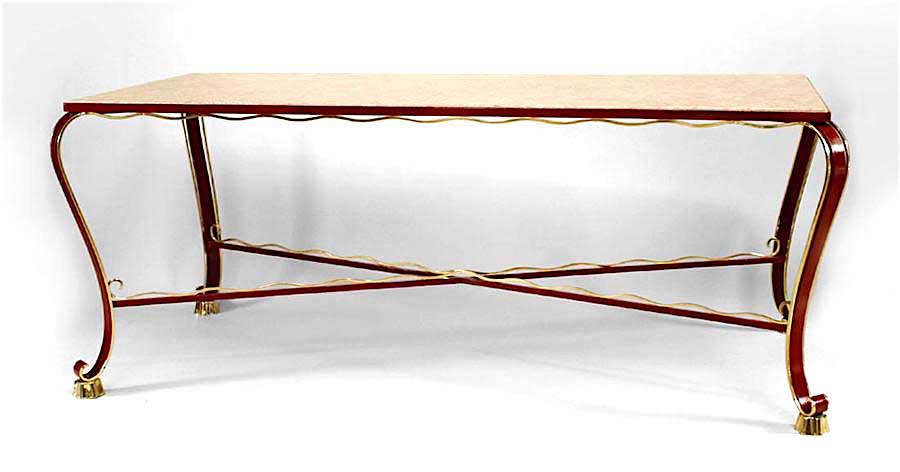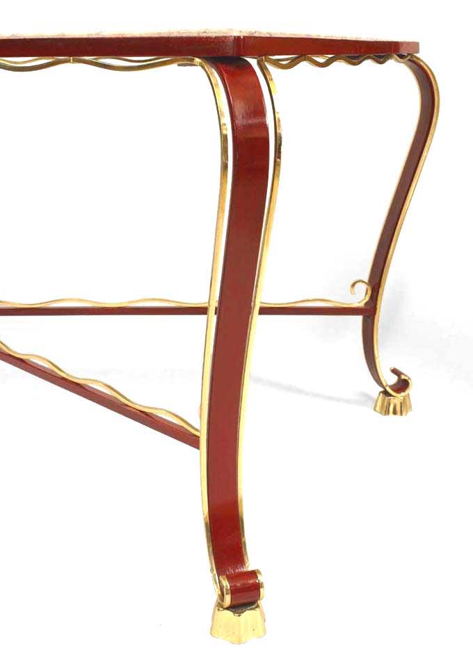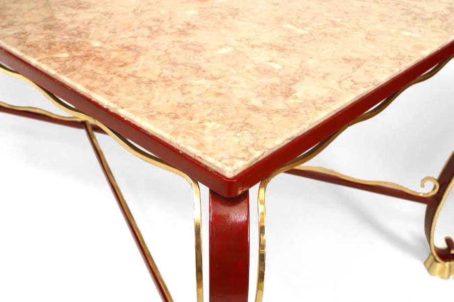 Italian 1930s red lacquered iron dining table with brass trimmed apron, stretcher, and legs with cabriole design and inset marble top (Design attributed to EDOARDO PERSICO).