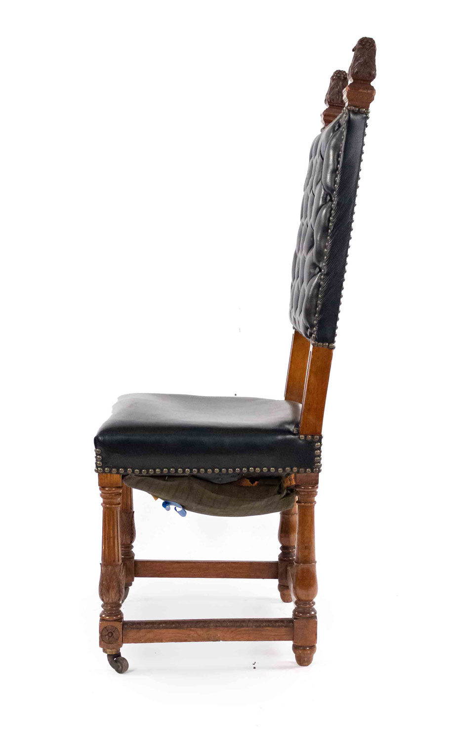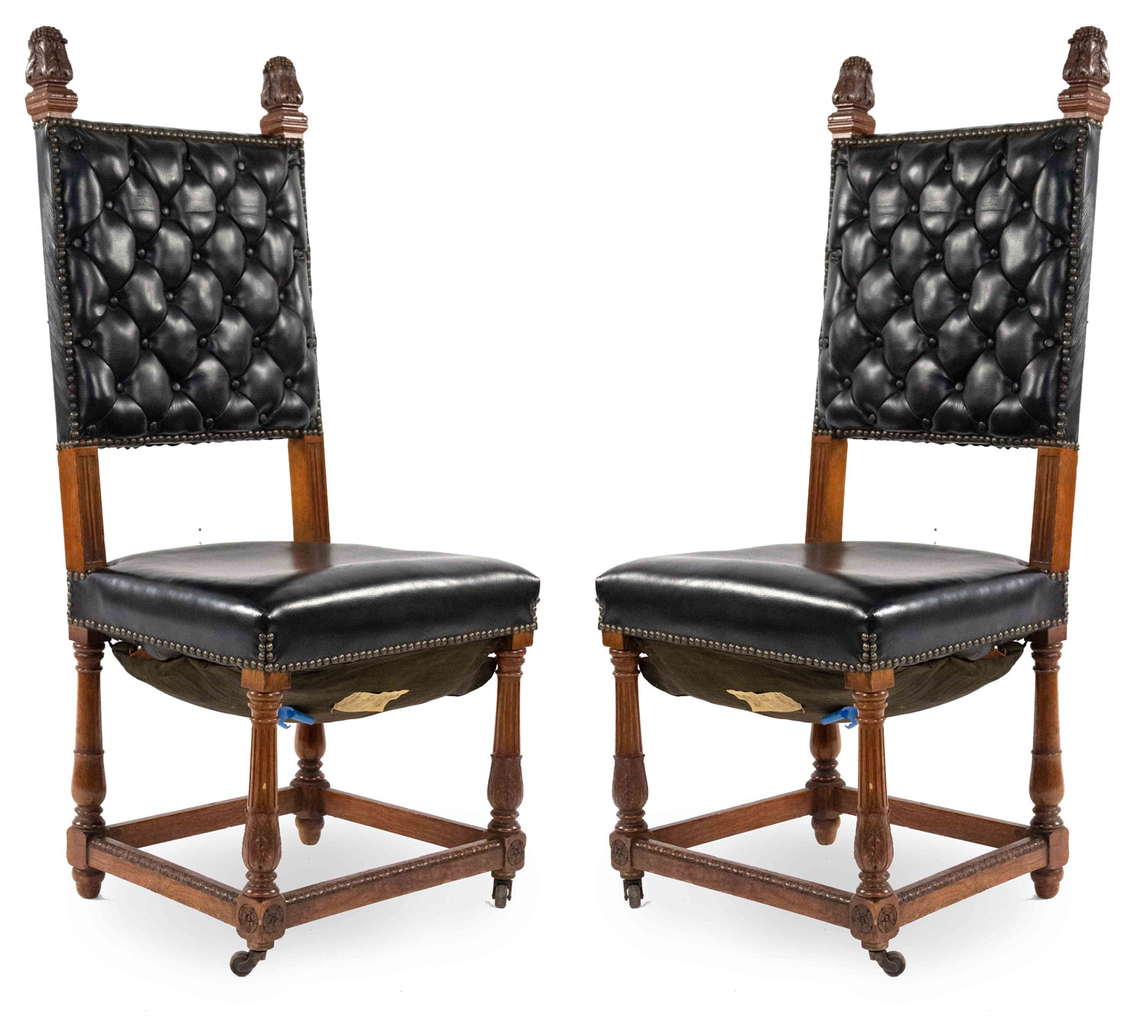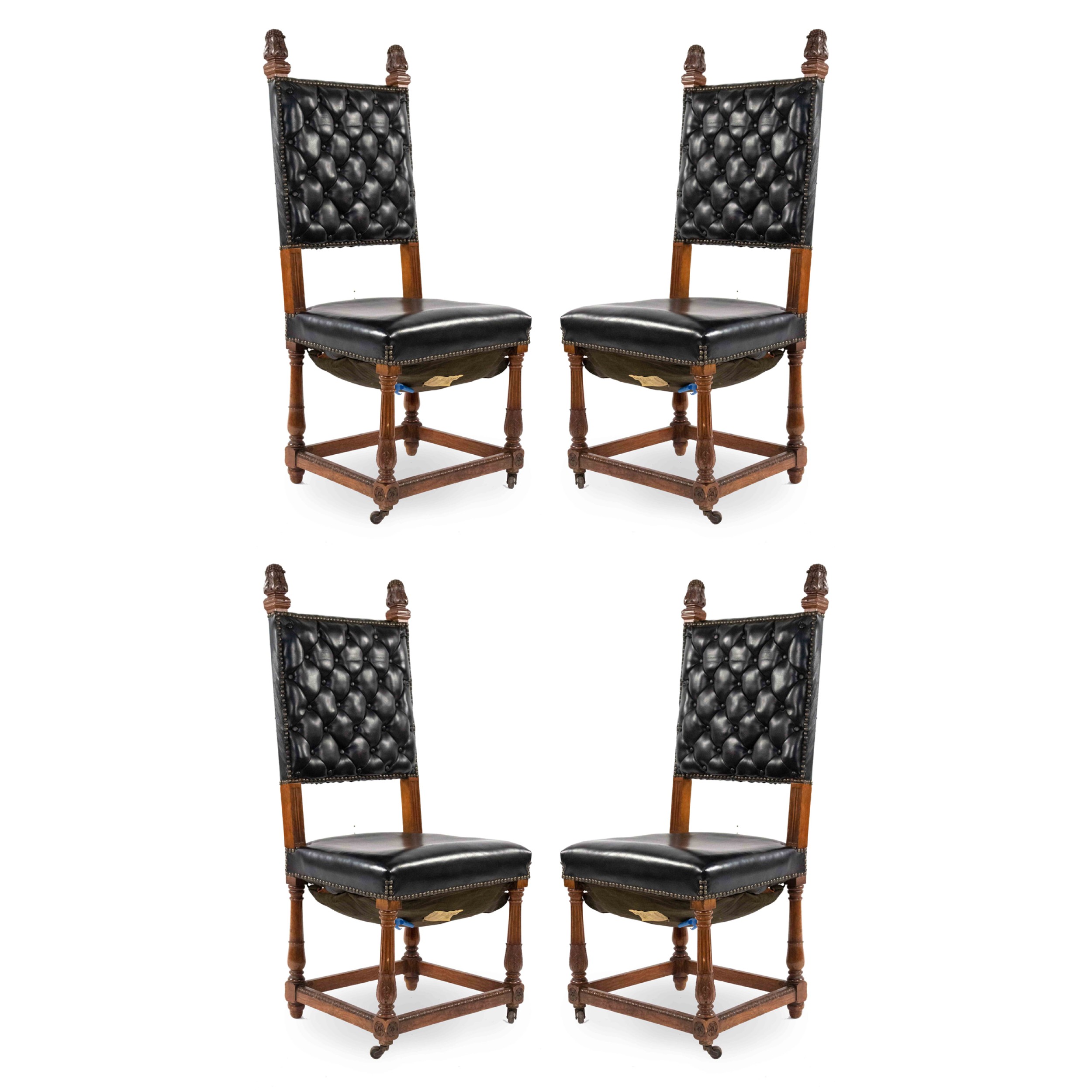 SET of 4 Italian Renaissance style oak high backed side chairs with black tufted leather backs & seats on porcelain casters (casters sgnd: R.Comb/Goodyear/1851)