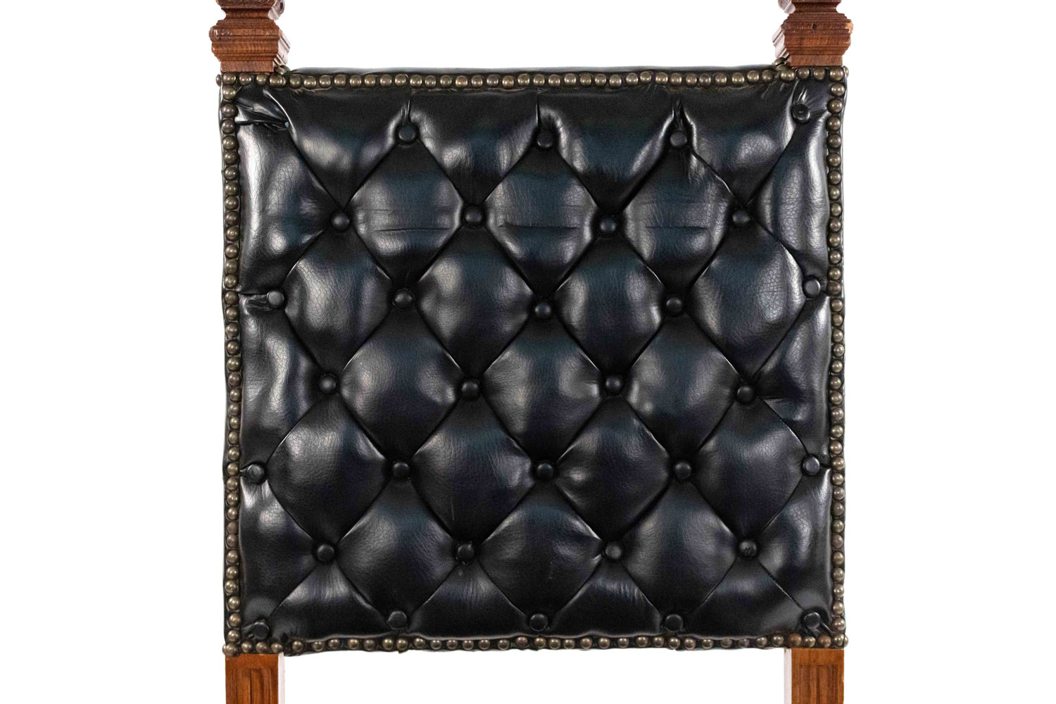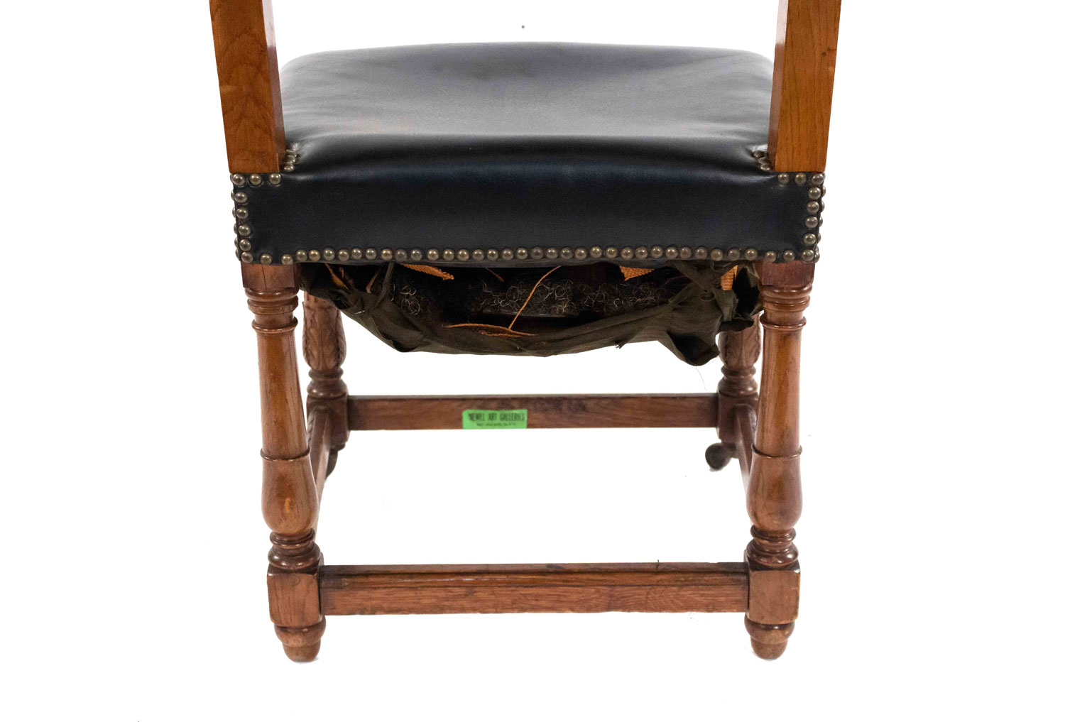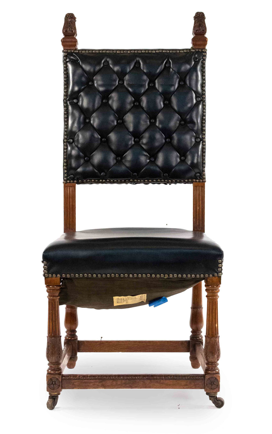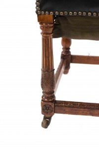 SET of 4 Italian Renaissance style oak high backed side chairs with black tufted leather backs & seats on porcelain casters (casters sgnd: R.Comb/Goodyear/1851)