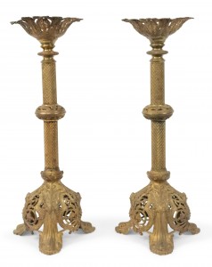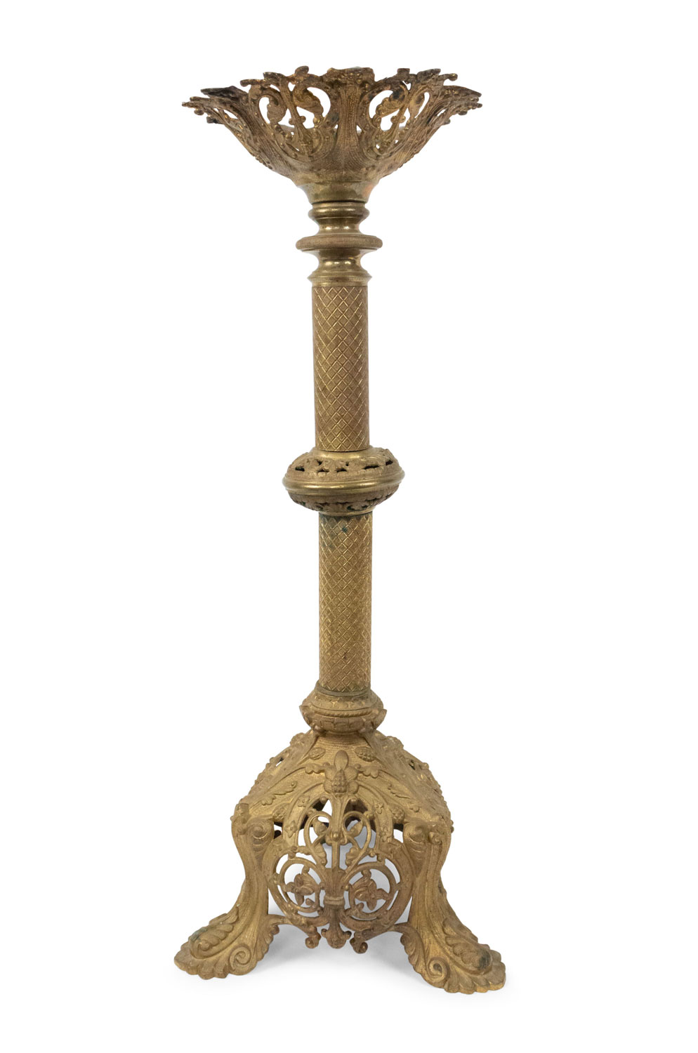 PAIR of Italian Renaissance-style (19th Century) round bronze altar sticks with filigree top and base (PRICED AS PAIR).