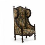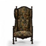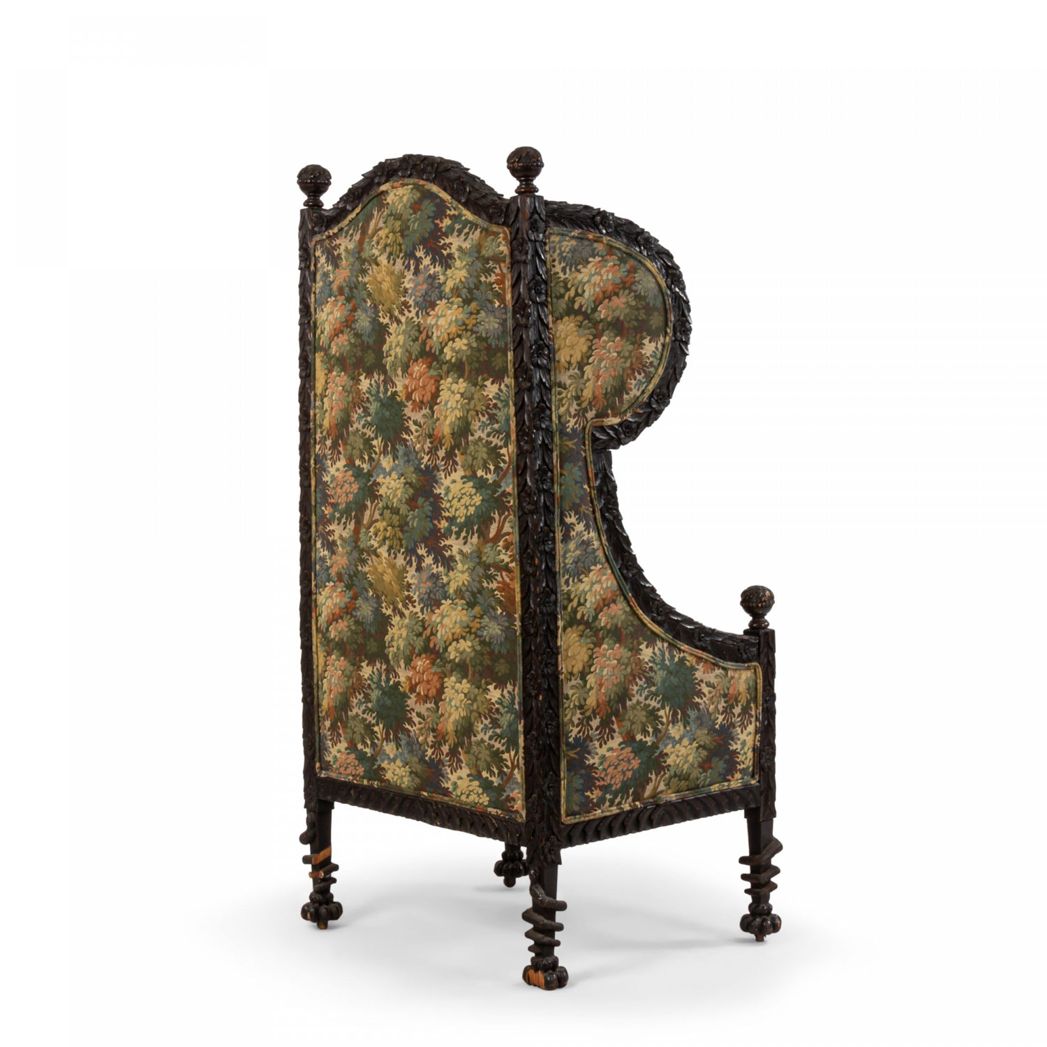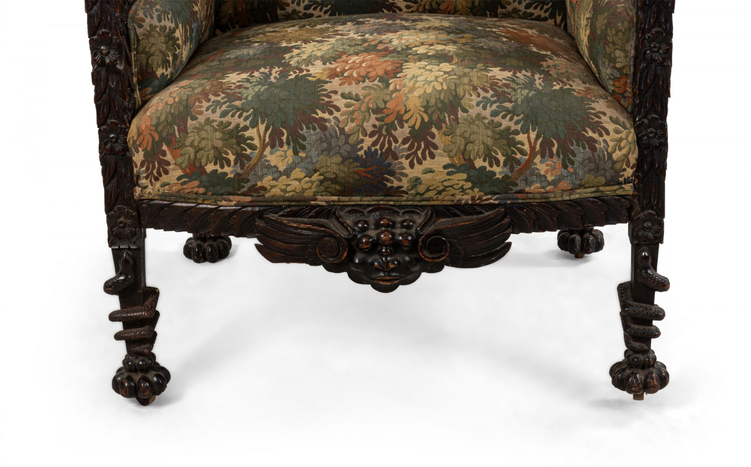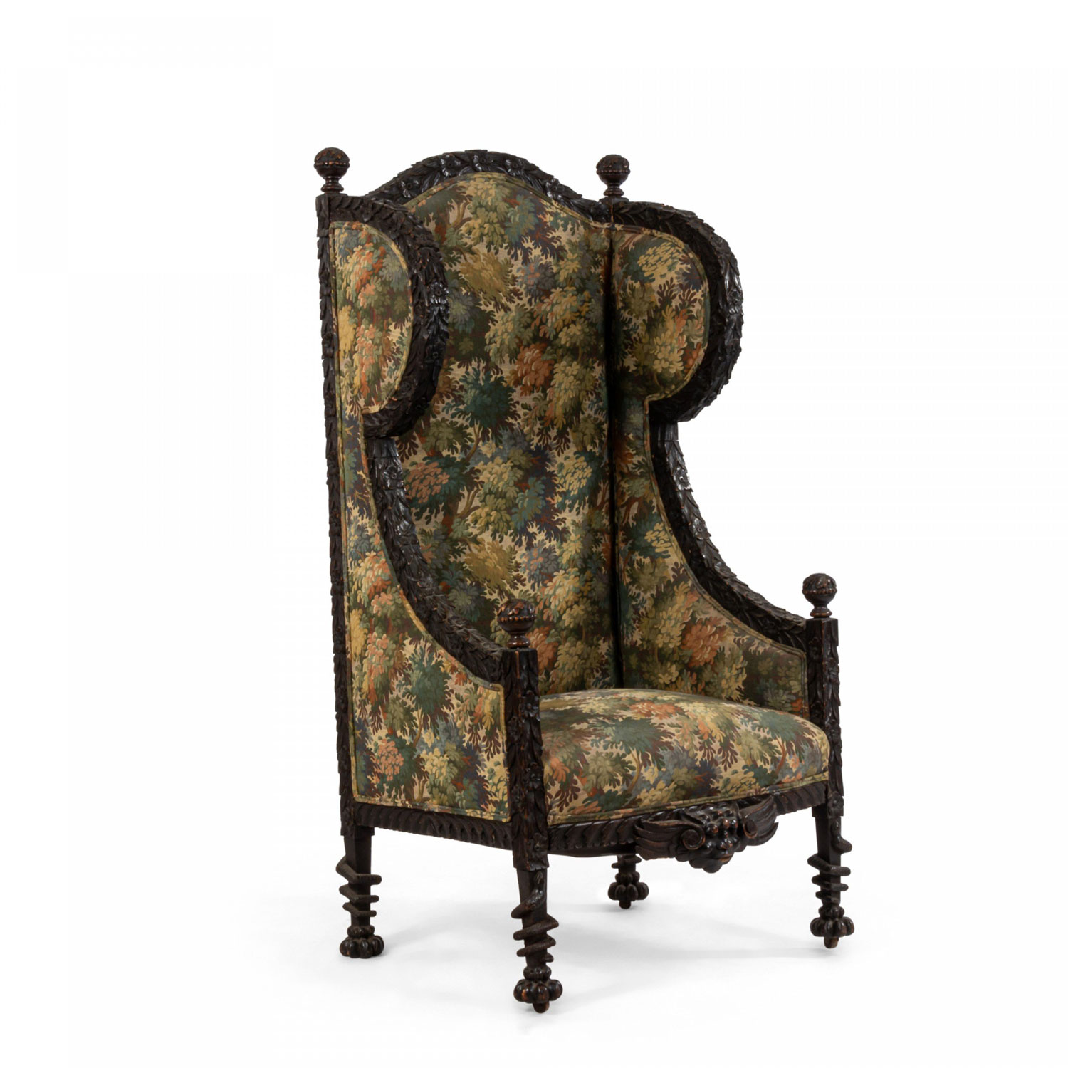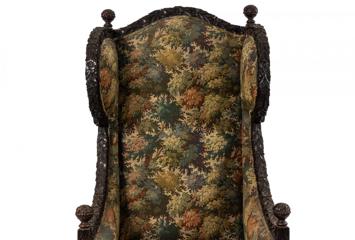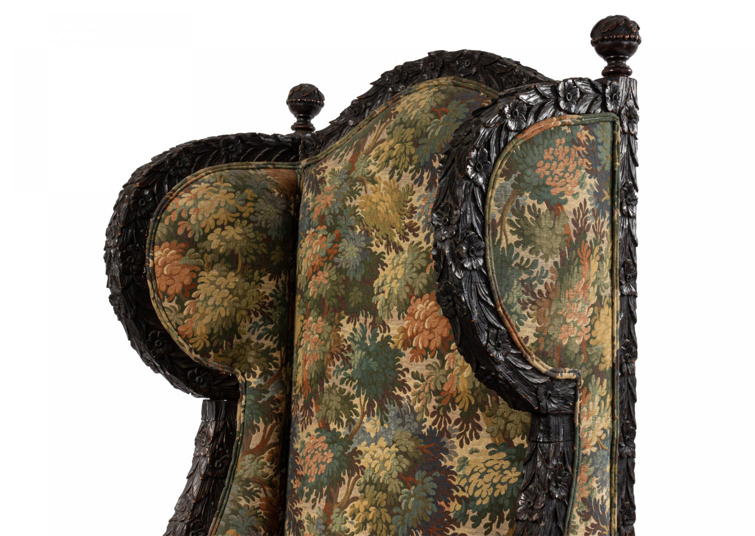 Italian Renaissance style (19th Cent) high back wing chair with floral carving and tapestry upholstery.
