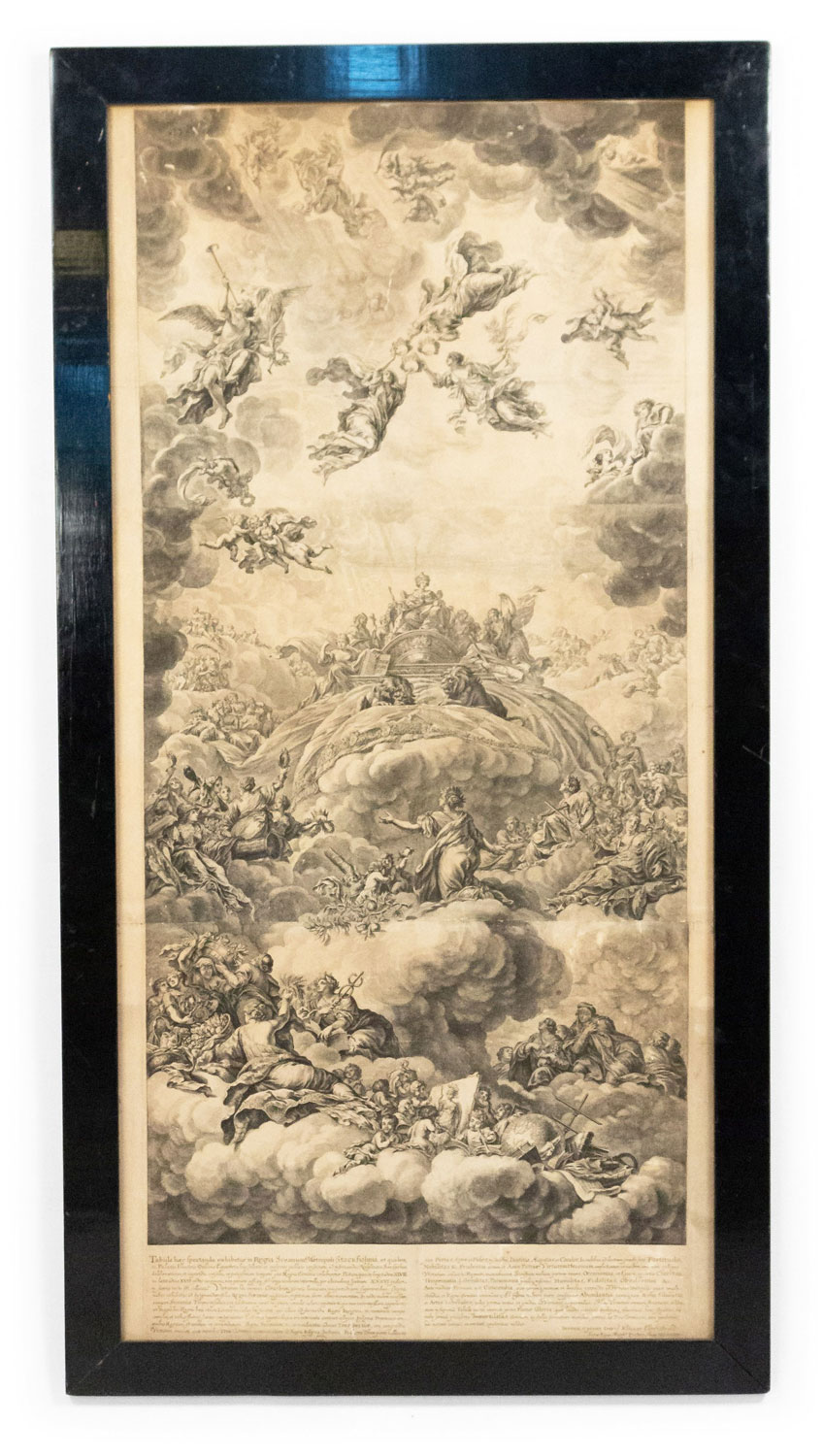 Italian Renaissance style black lacquer framed vertical lithograph of classical scene with angels..