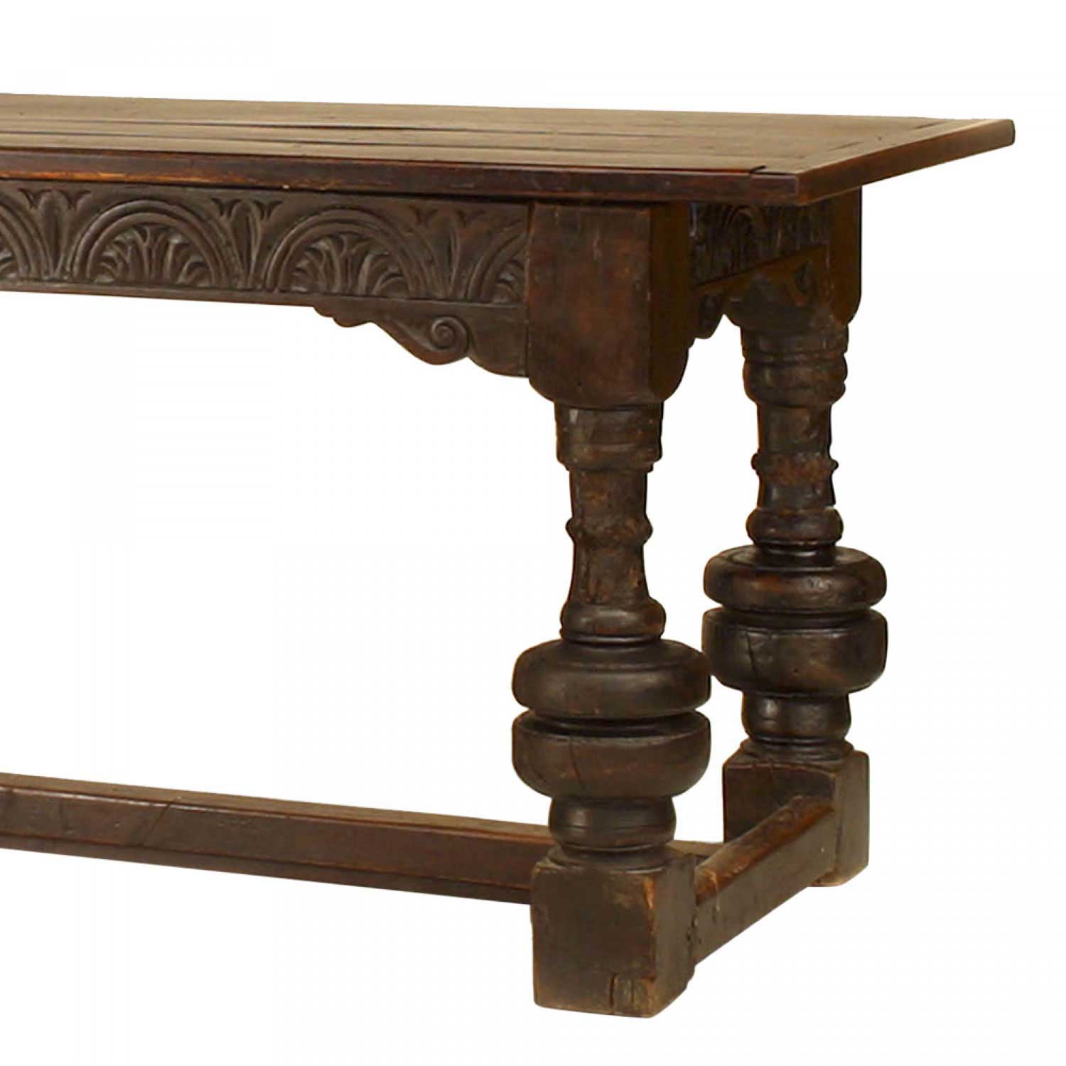 Italian Renaissance style (17th Century elements) oak refectory table with carved apron an bulbous shaped legs with a stretcher at base (plank top 19/20th Century).