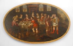 Italian Renaissance-style (possibly 17th Century) oval religious oil painting of group of figures at a dinner table titled, "Wedding of Cana at Galilee-Filling Six Water Pots Turning to Wine".