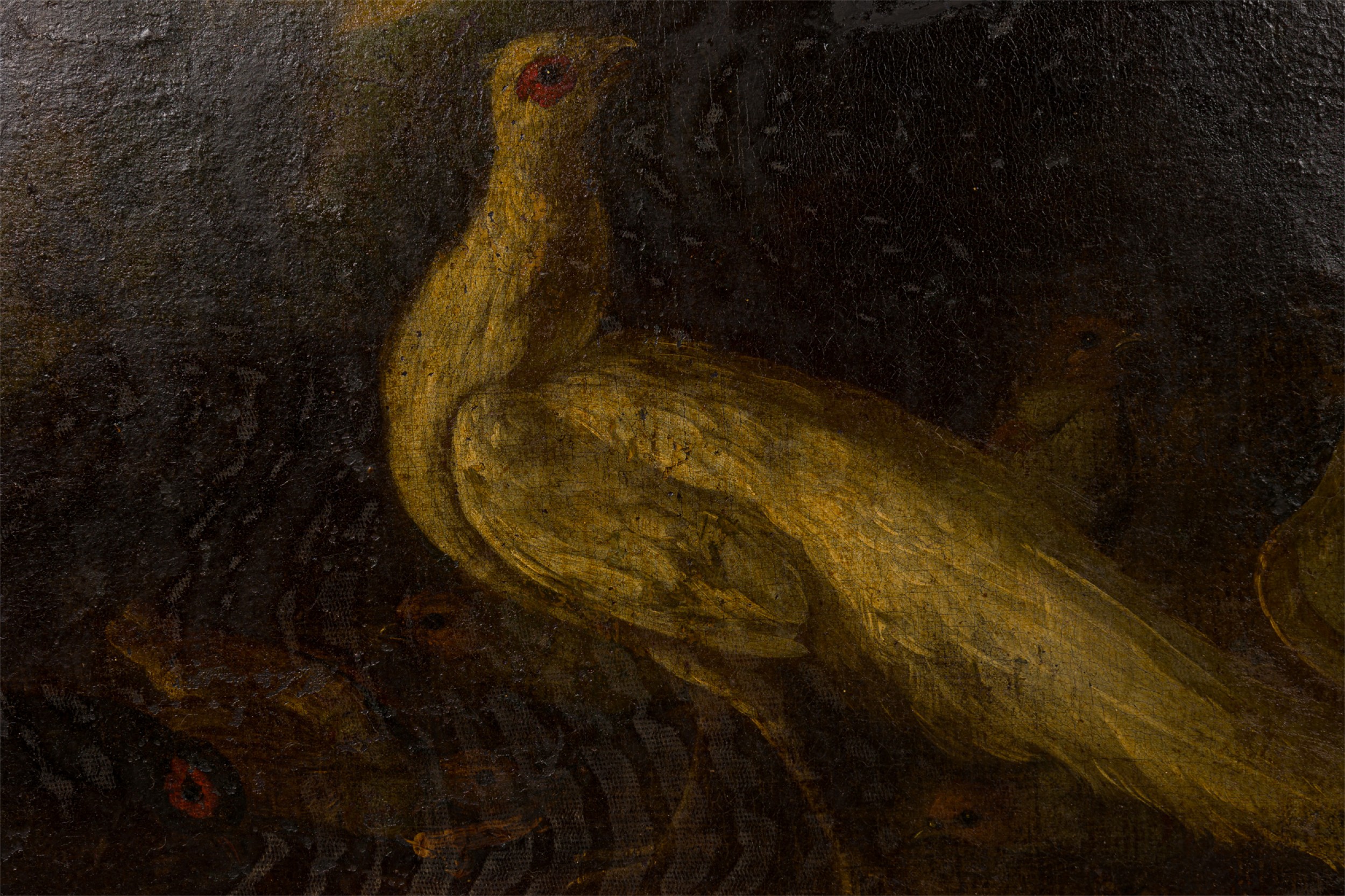 Italian Renaissance-Style Oil Painting of a White Peacock and Other Birds in a Giltwood Frame