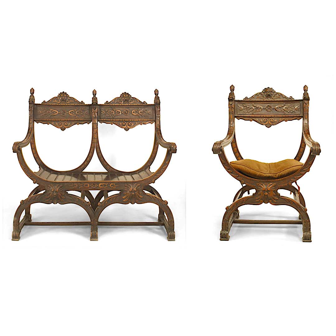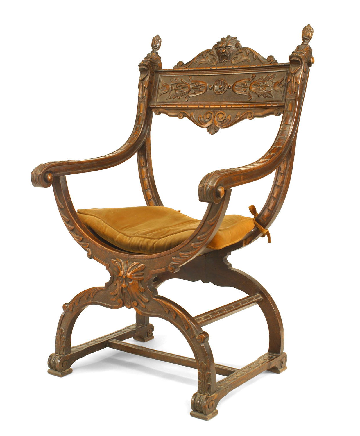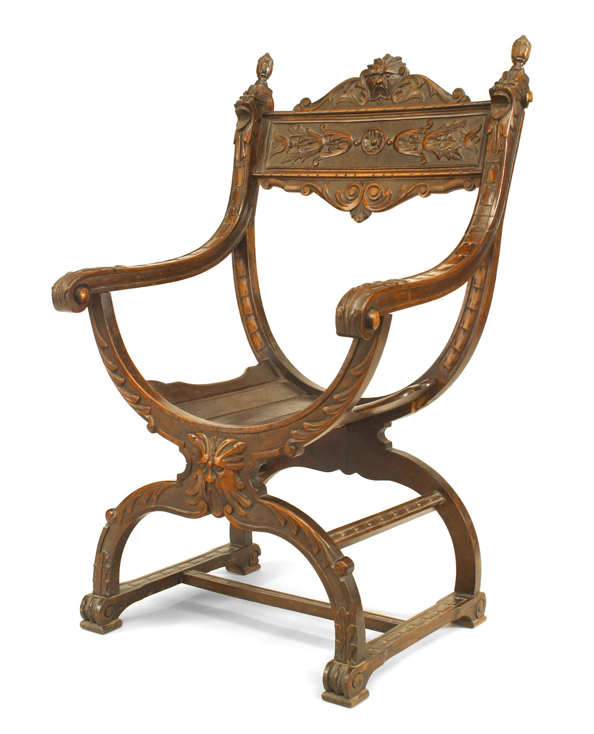 Italian Renaissance-style (19th Century) carved walnut Savonarola style armchair with carved heads. (Matching loveseat: 041408)