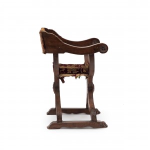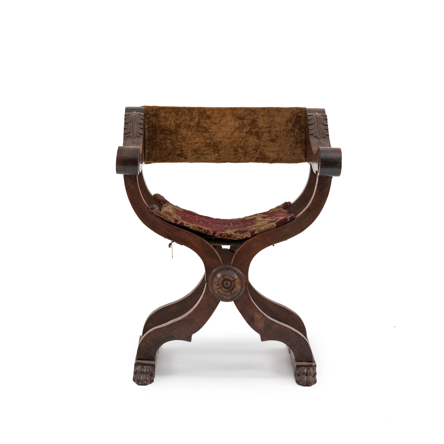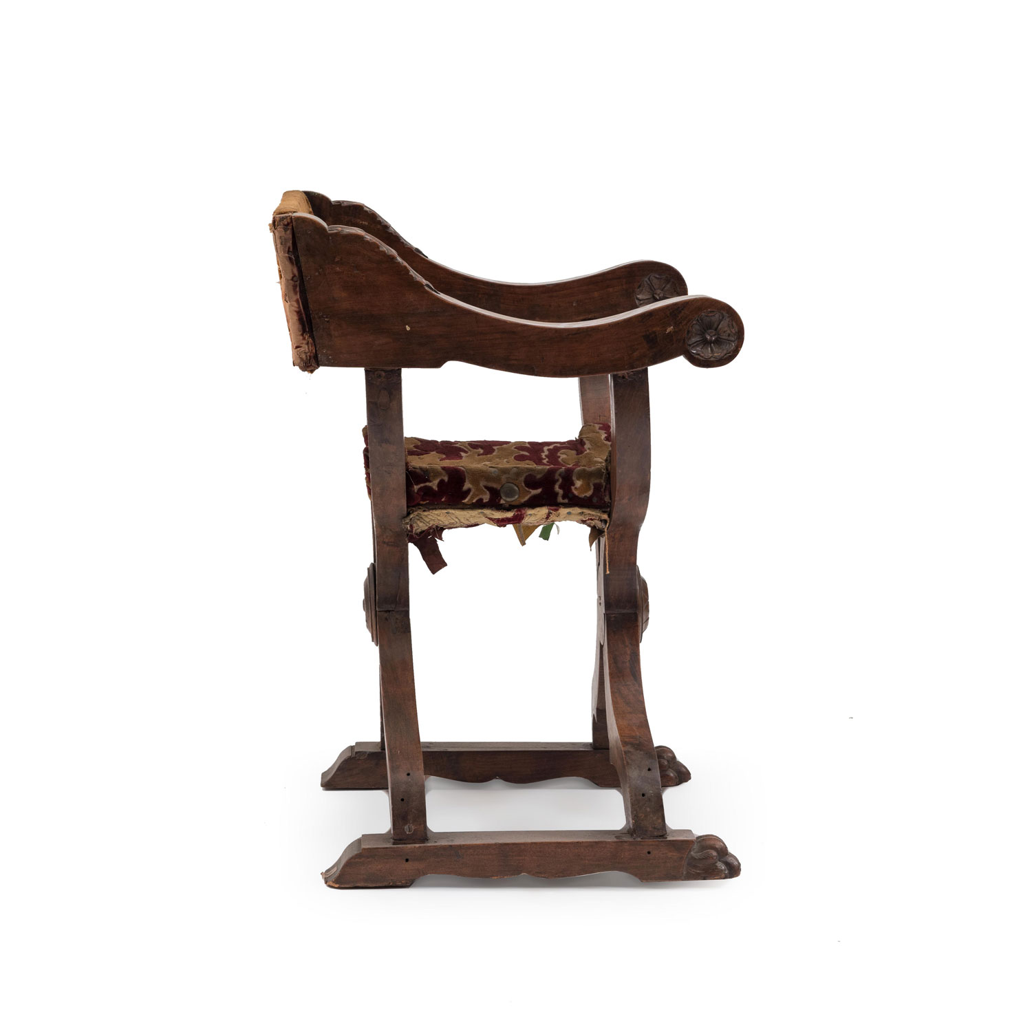 Italian Renaissance Savonarola style walnut arm chair with gold velvet back and red and gold cut velvet seat. (19th Cent).