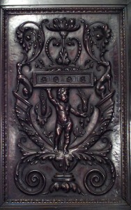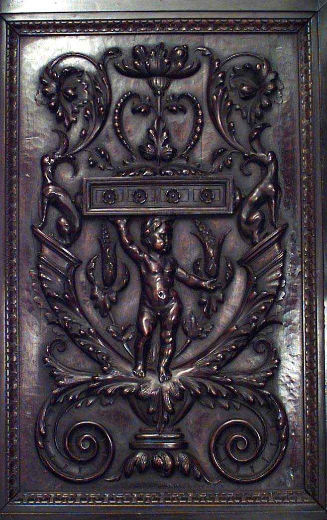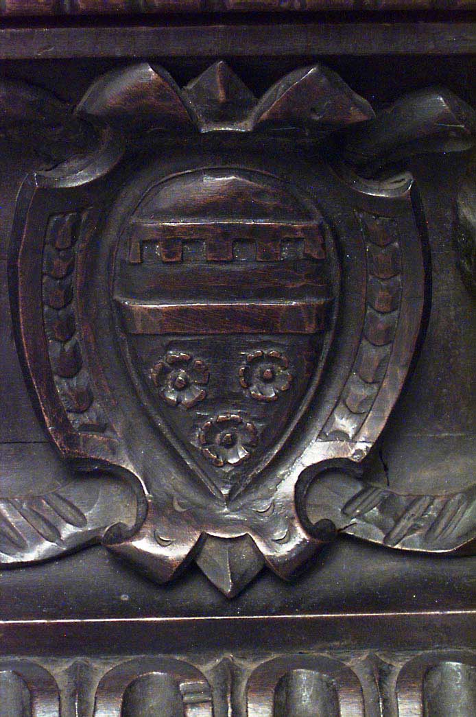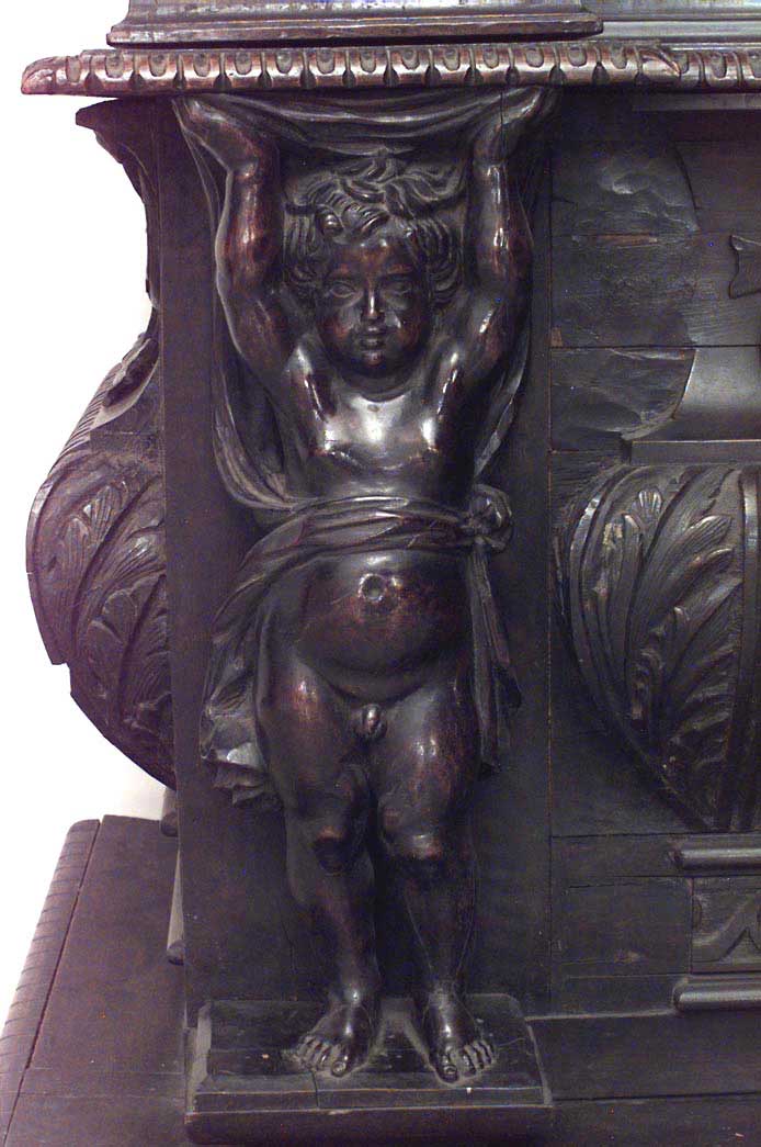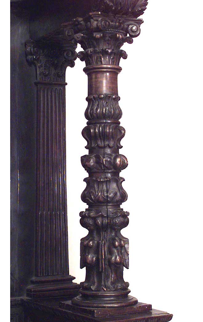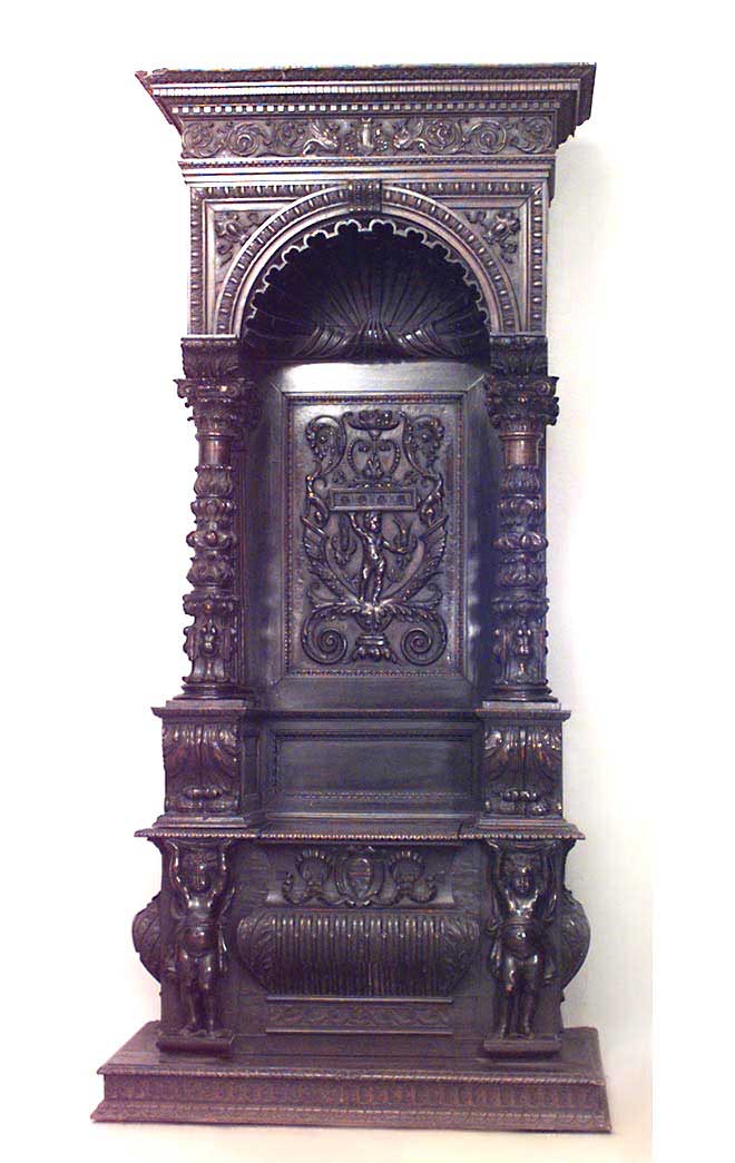 Italian Renaissance style walnut cardinals throne chair with shell design canopy and column supports. (19th Cent.).