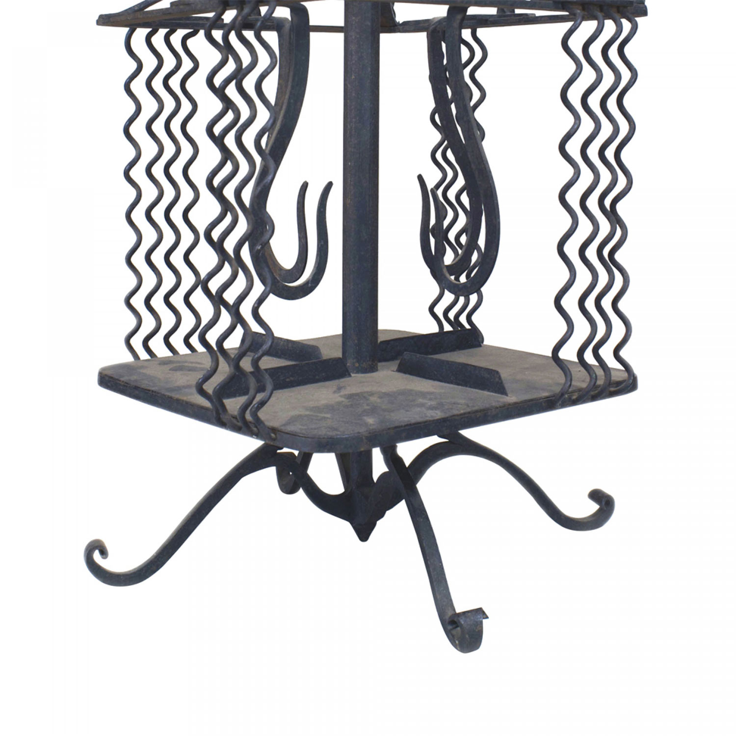 Italian Renaissance-style (19th/20th Century) wrought iron revolving table top book stand with finials on top and wavy design sides on a base with 4 scroll feet