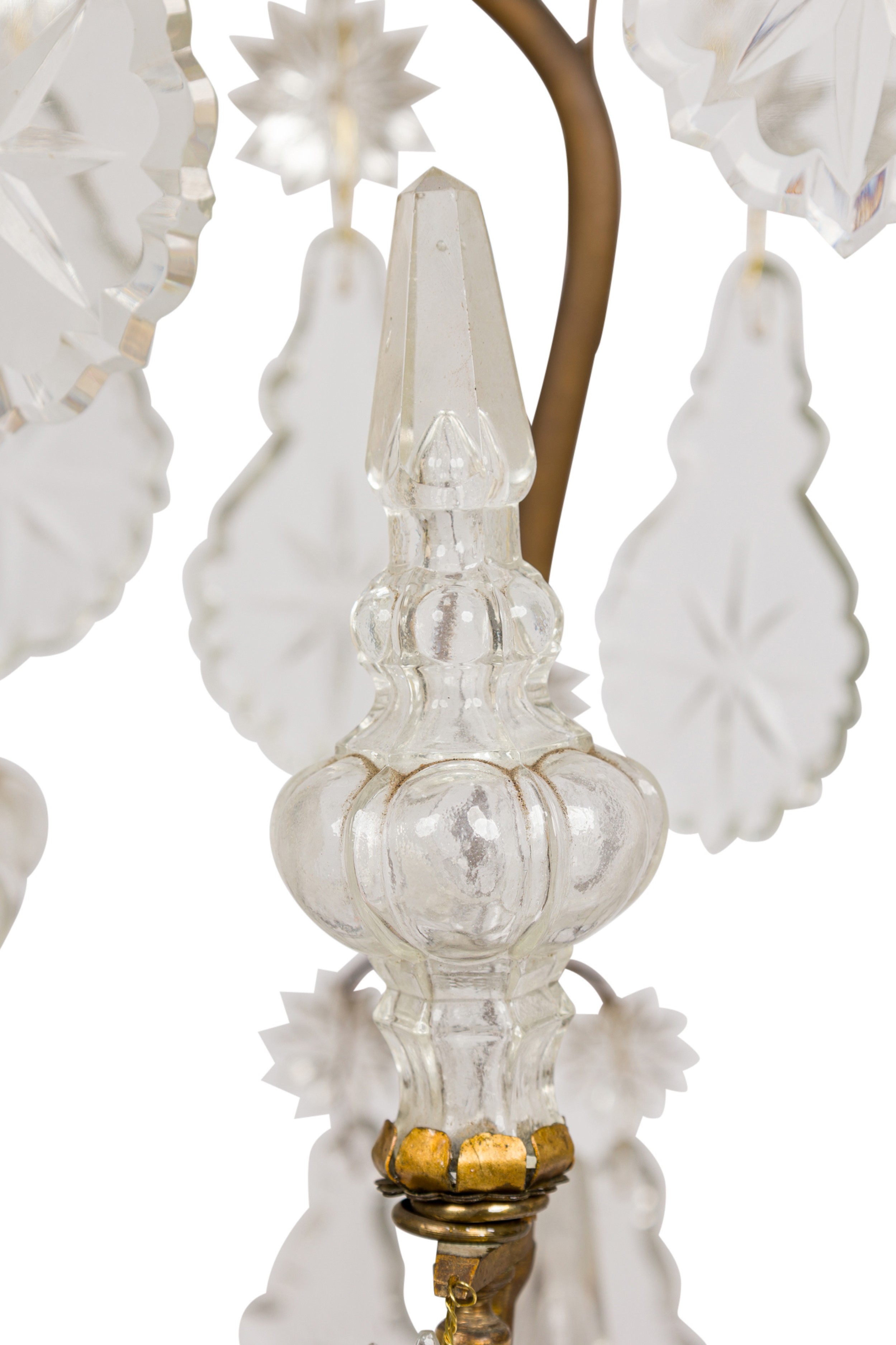 Italian Rococo-style (early 20th Century) monumental gilt metal six-light candelabra with finials and large etched shaped crystal drops