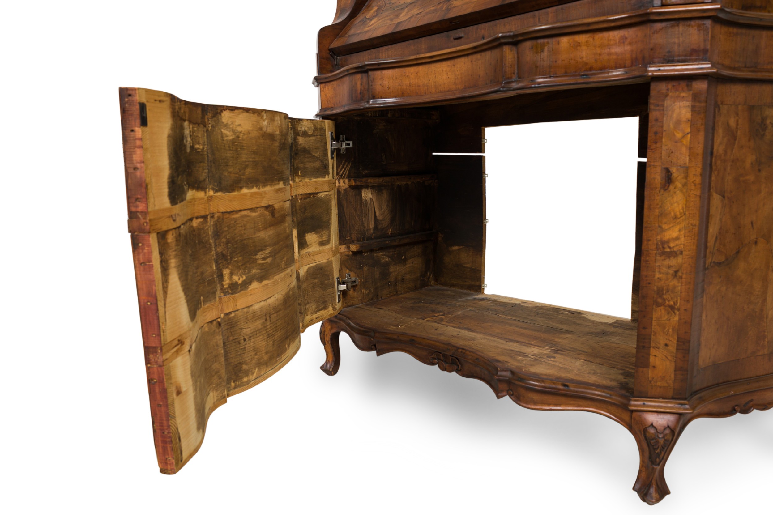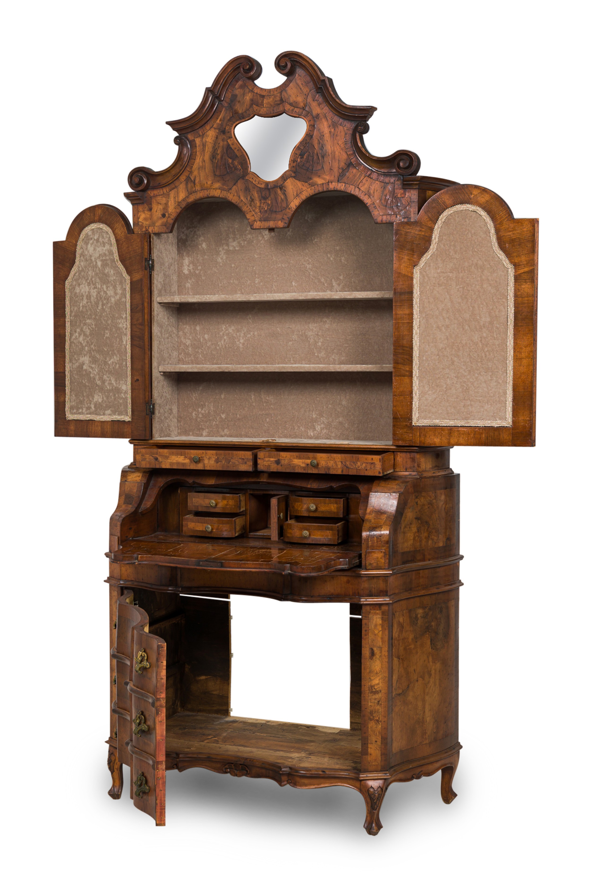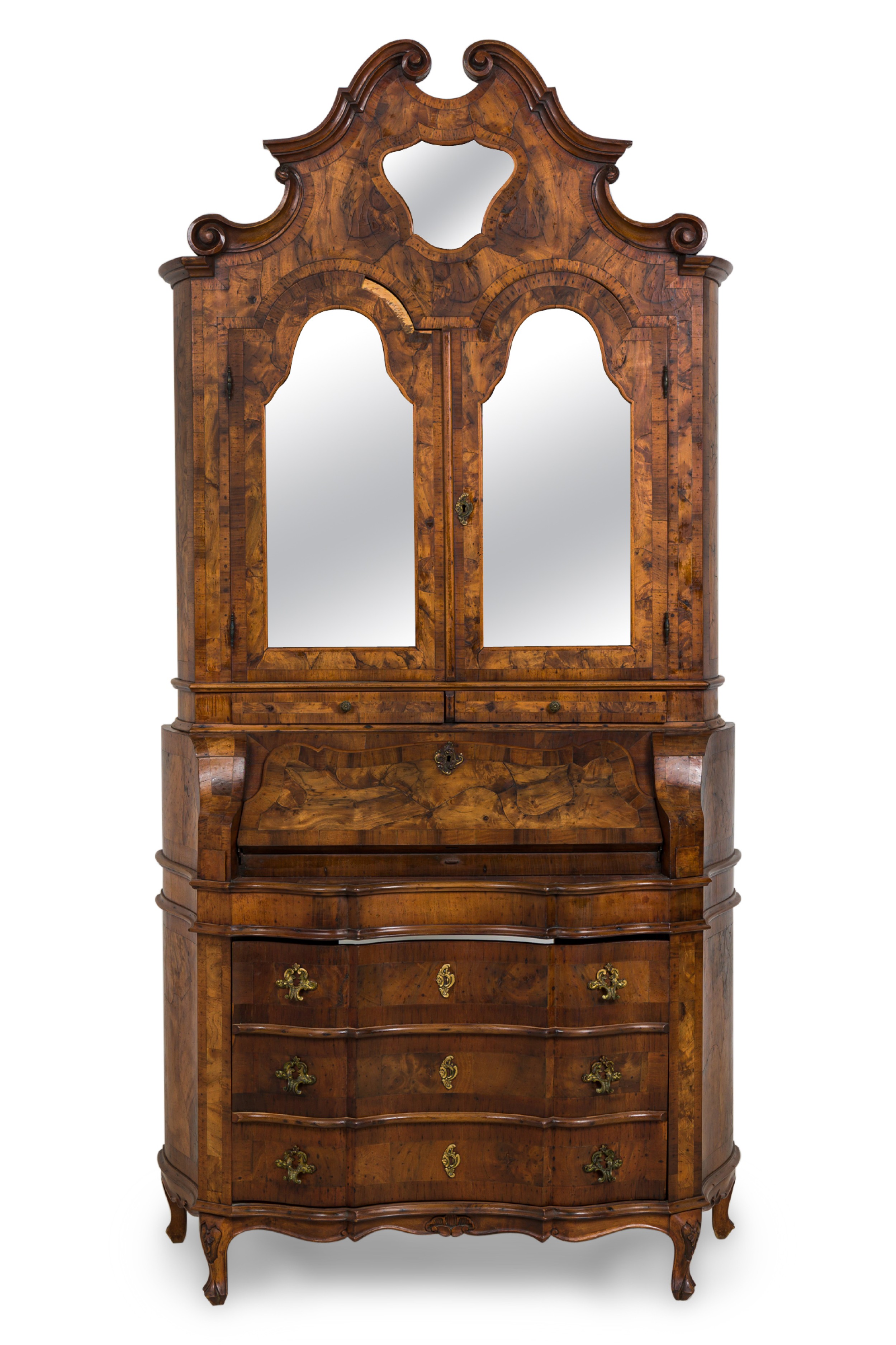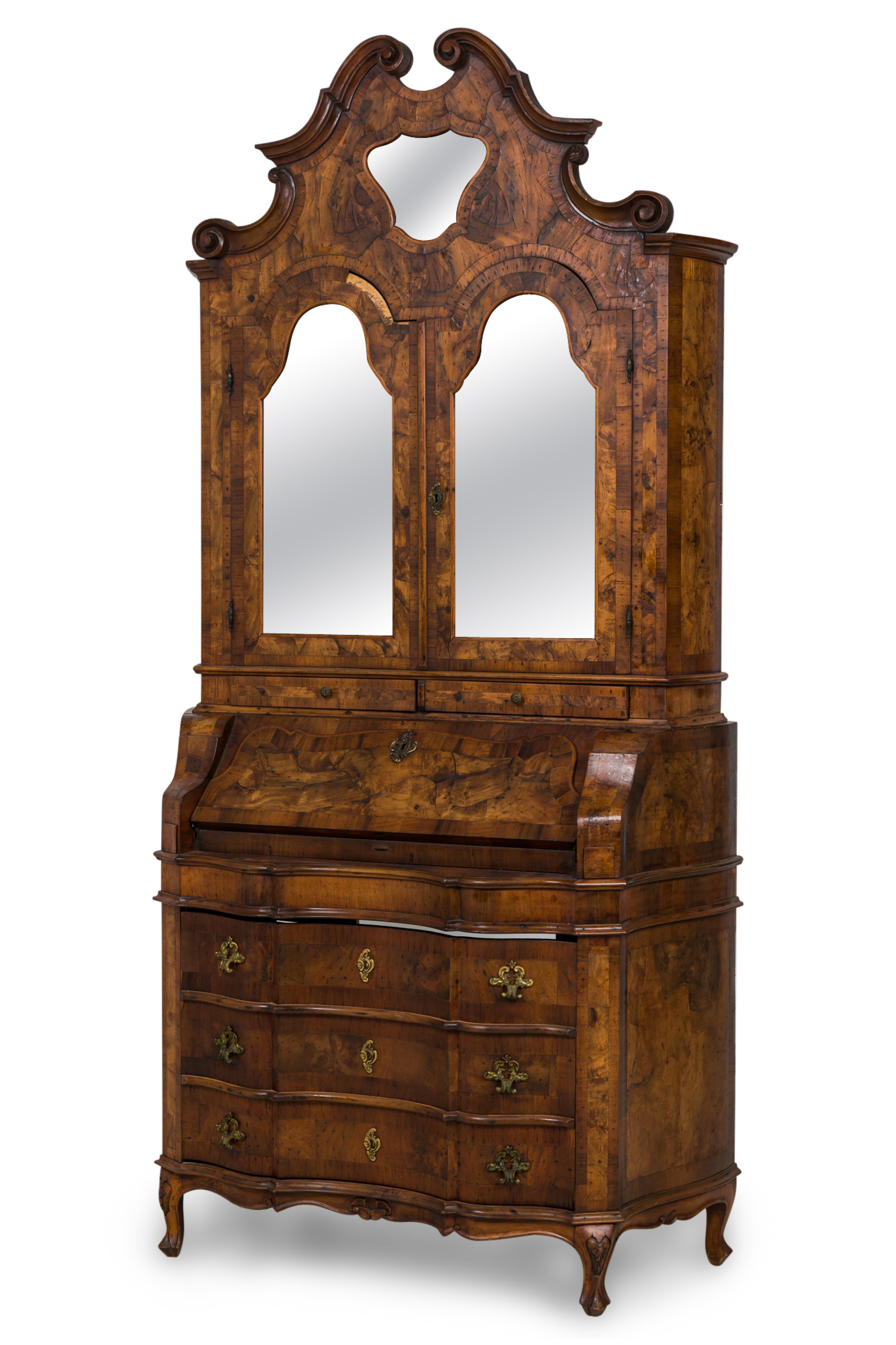 Italian Rococo secretary desk / cabinet with an upper door that folds down to reveal a writing surface and 5 small interior drawers, over three drawers with serpentine fronts and ornate brass drawer pulls, finished in an oyster burl veneer and resting on four carved legs with foliate carved decorations, supporting a separate upper cabinet section with breakfront mirrored doors that open to reveal a three shelf cabinet finished with a taupe velvet, topped with an ornately carved scroll pediment..
