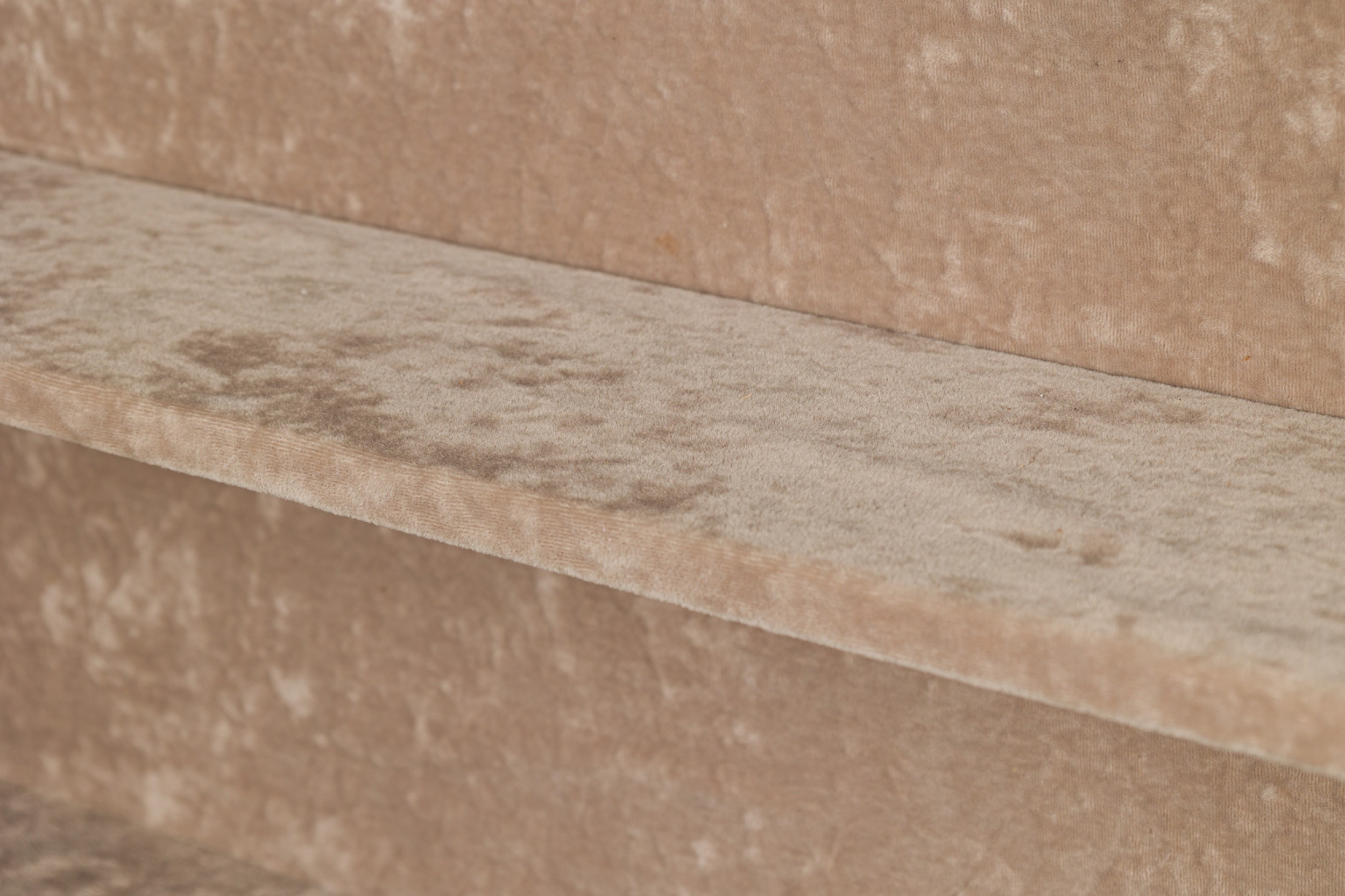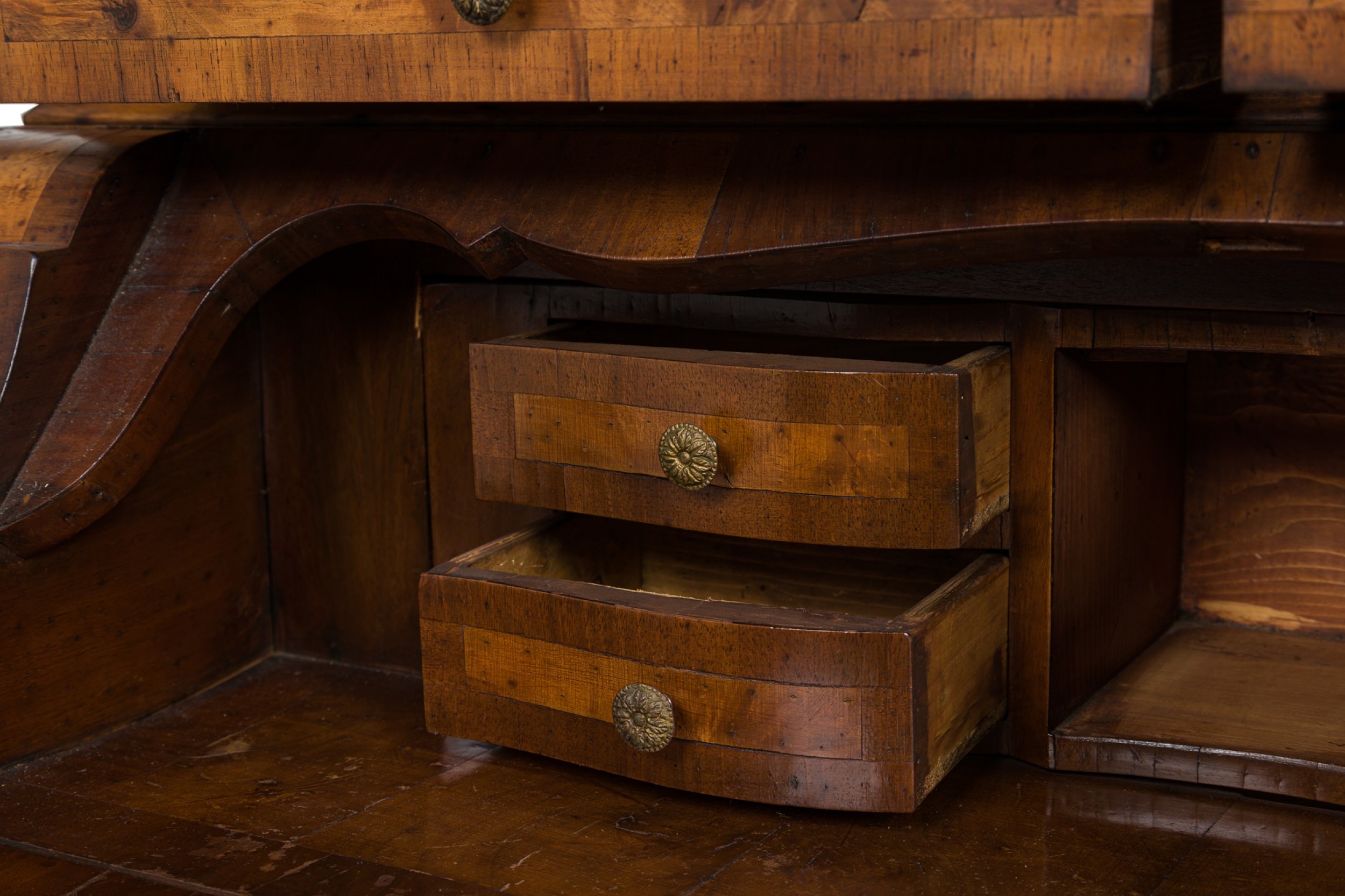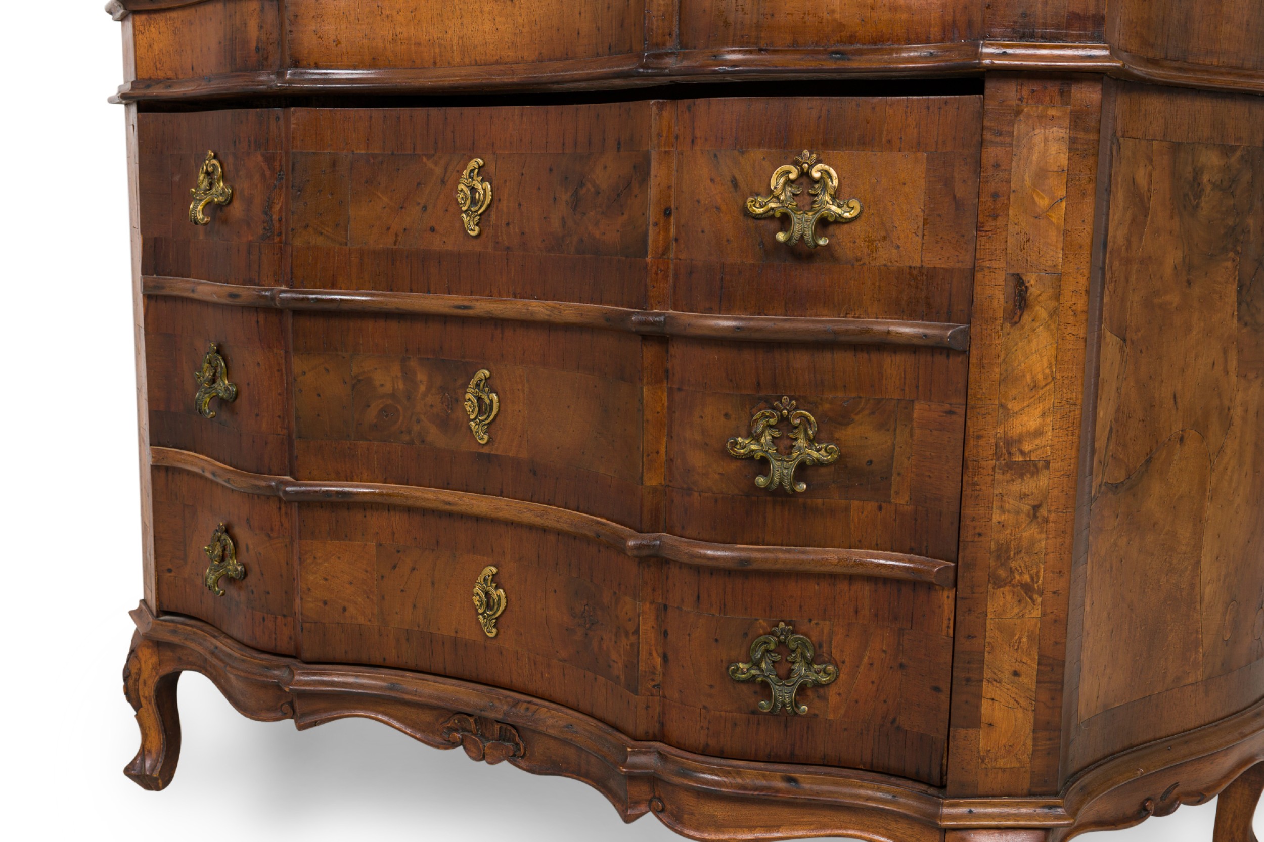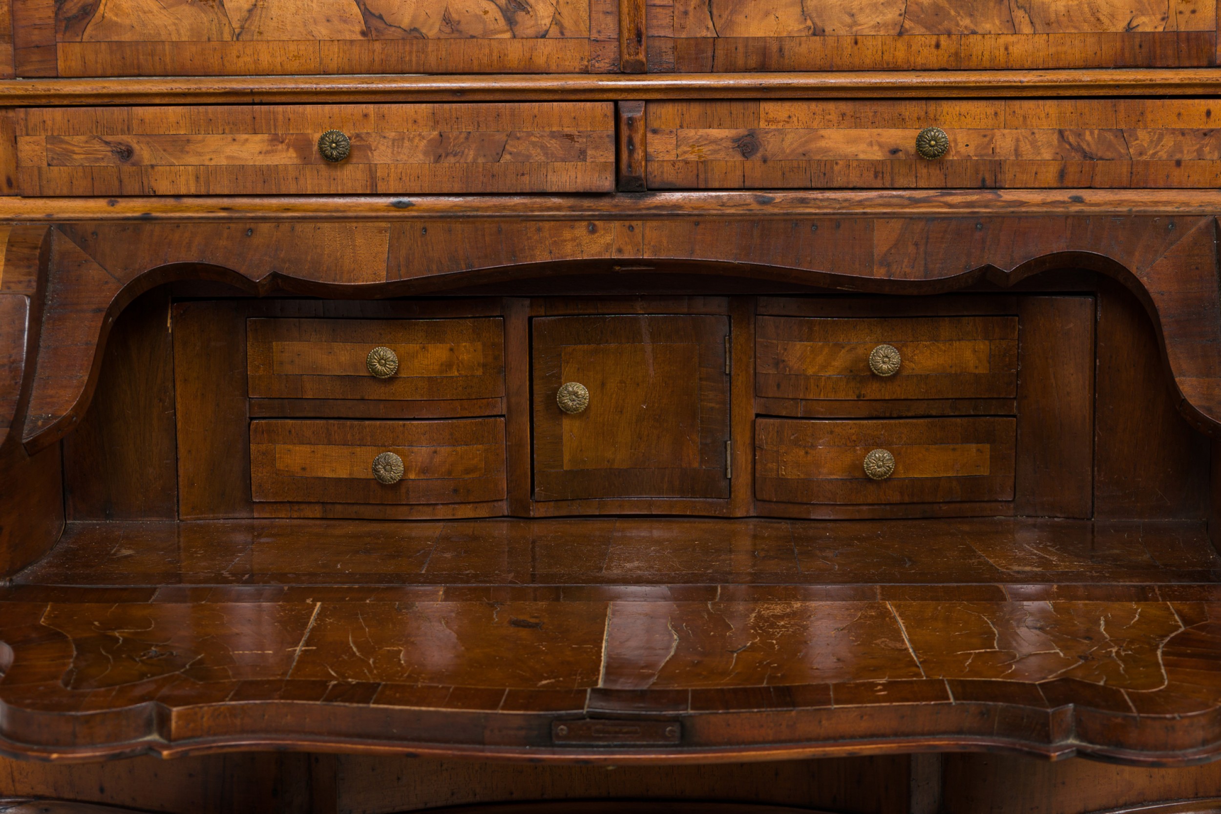 Italian Rococo secretary desk / cabinet with an upper door that folds down to reveal a writing surface and 5 small interior drawers, over three drawers with serpentine fronts and ornate brass drawer pulls, finished in an oyster burl veneer and resting on four carved legs with foliate carved decorations, supporting a separate upper cabinet section with breakfront mirrored doors that open to reveal a three shelf cabinet finished with a taupe velvet, topped with an ornately carved scroll pediment..