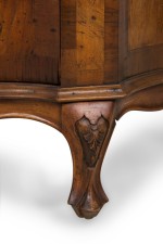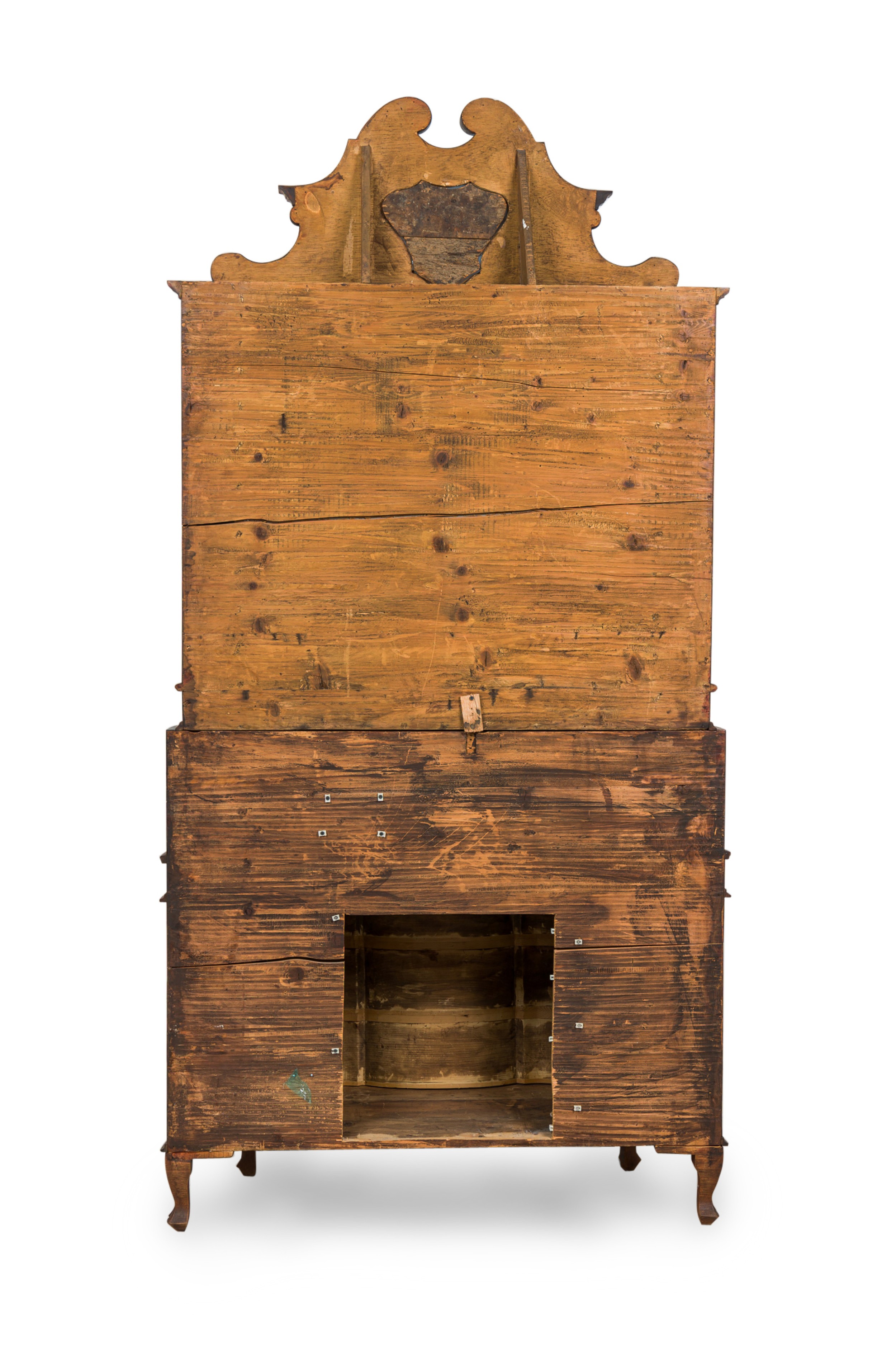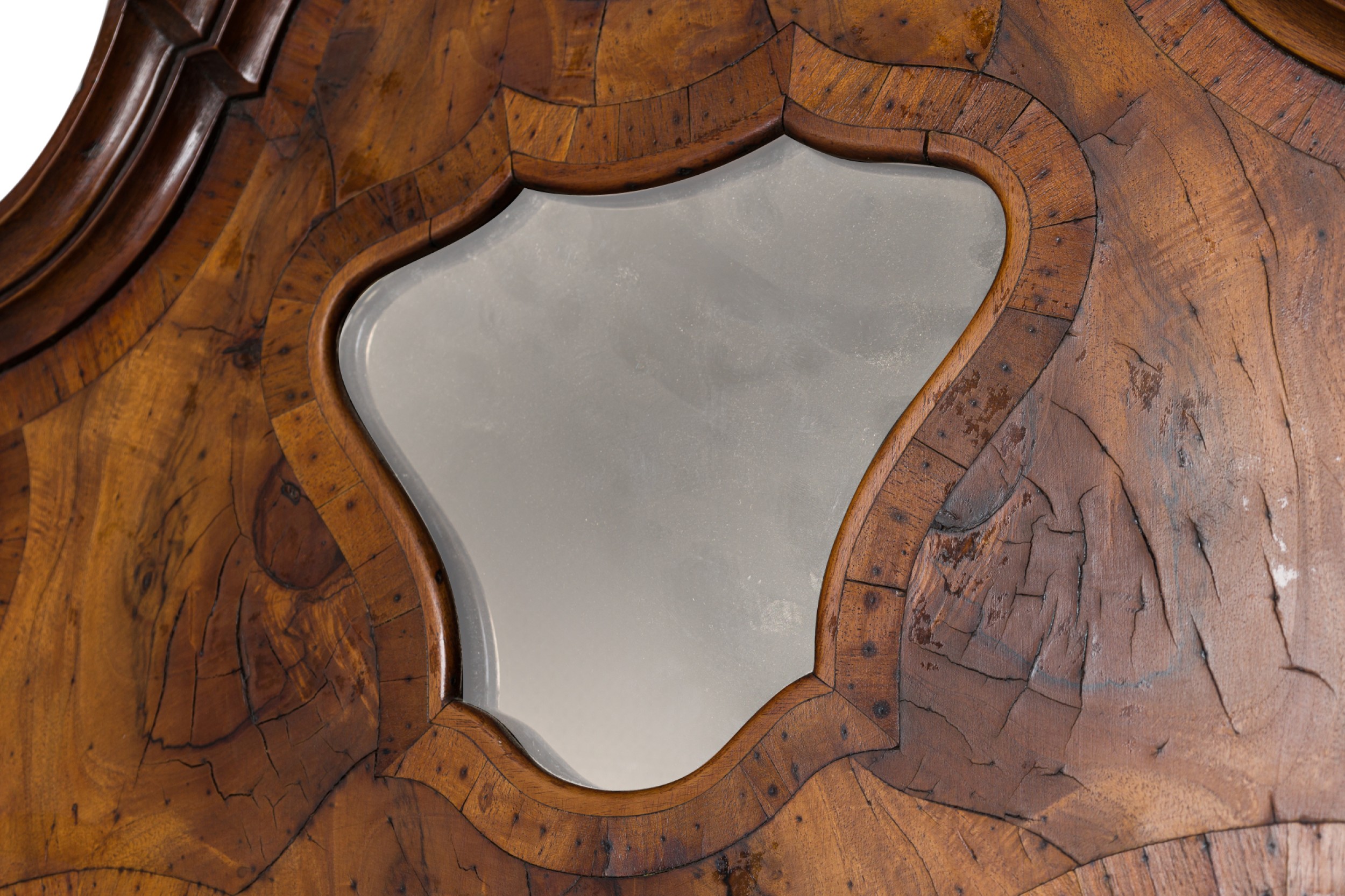 Italian Rococo secretary desk / cabinet with an upper door that folds down to reveal a writing surface and 5 small interior drawers, over three drawers with serpentine fronts and ornate brass drawer pulls, finished in an oyster burl veneer and resting on four carved legs with foliate carved decorations, supporting a separate upper cabinet section with breakfront mirrored doors that open to reveal a three shelf cabinet finished with a taupe velvet, topped with an ornately carved scroll pediment.