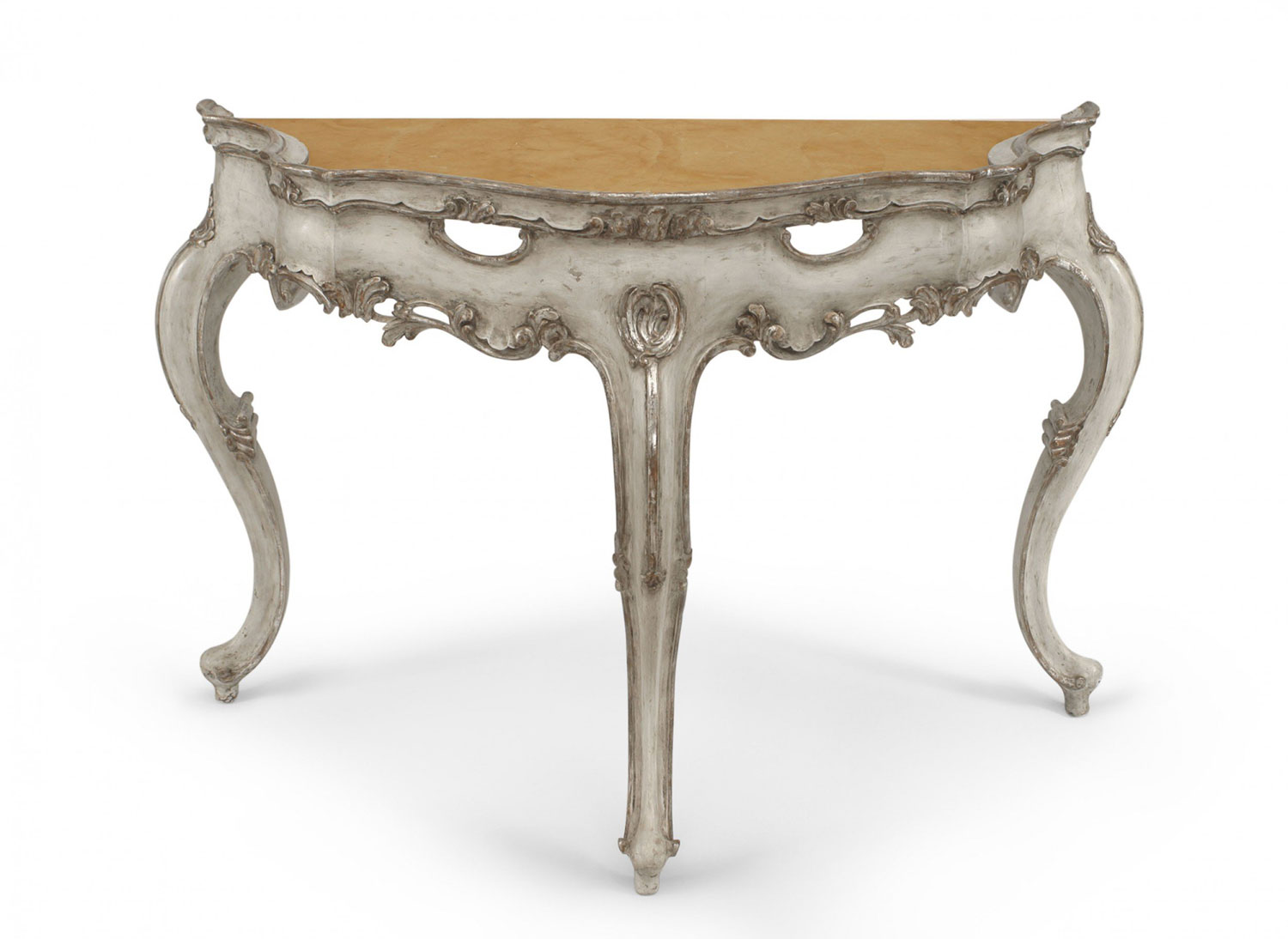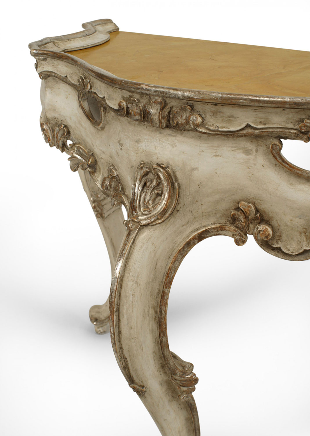 Italian Rococo-style (Venice, First Quarter 19th Century) silver gilt & white gesso painted console table with inset shaped Siena marble top & scroll design apron on 3 cabriole legs