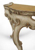Italian Rococo-style (Venice, First Quarter 19th Century) silver gilt & white gesso painted console table with inset shaped Siena marble top & scroll design apron on 3 cabriole legs.