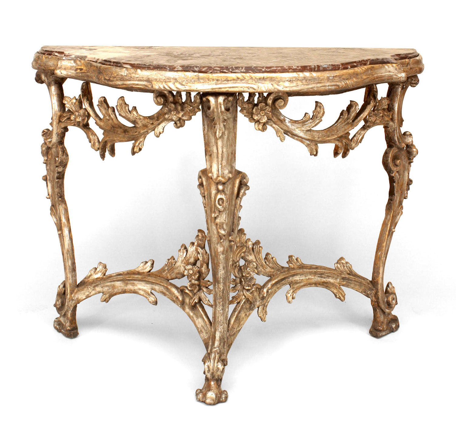 Italian Venetian (18th Century) gilt 3 leg console table with carved floral design stretcher & apron with shaped brown marble top.