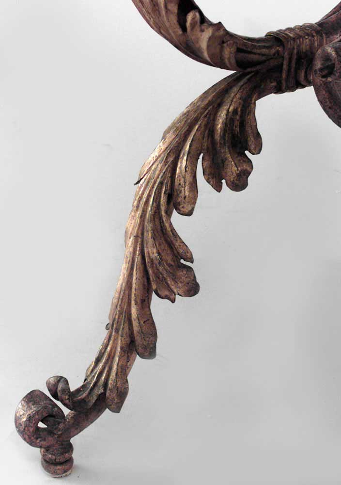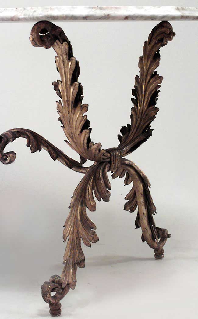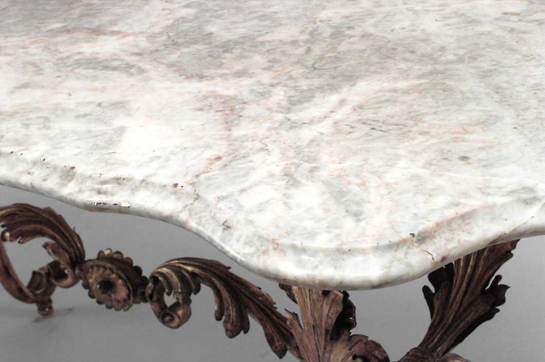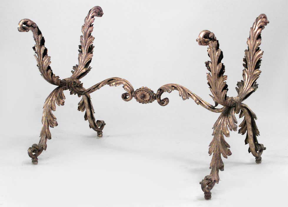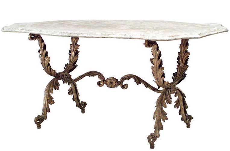 Italian Venetian style (19th Century) gilt metal rectangular center table with leaf design scroll base and beige serpentine shaped marble top..
