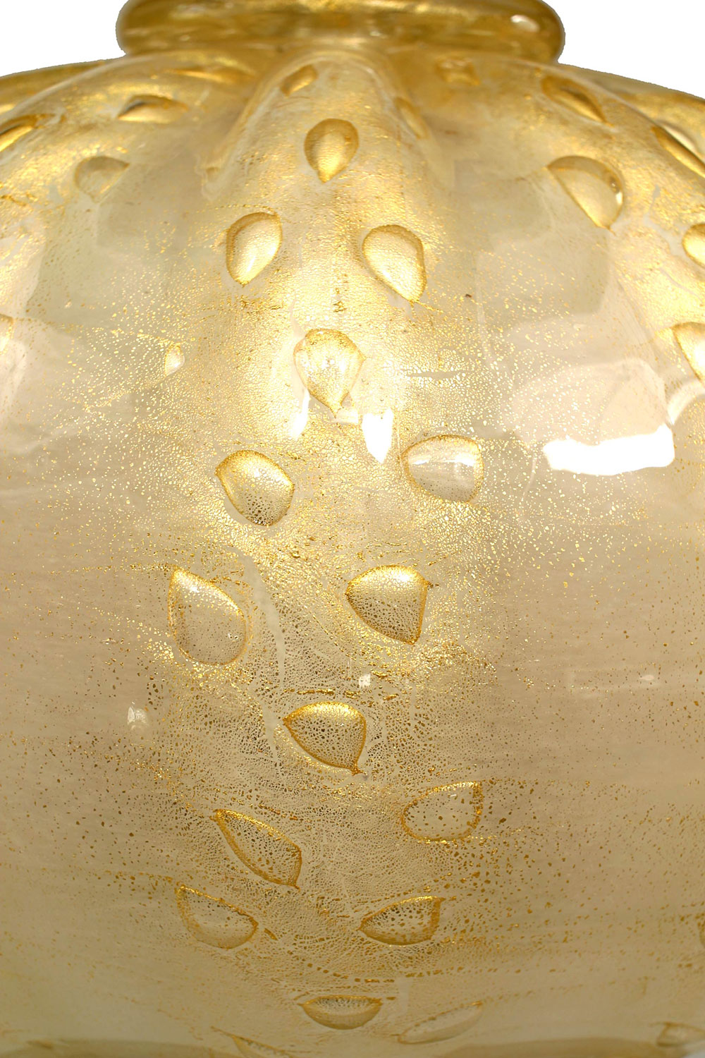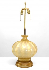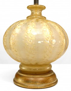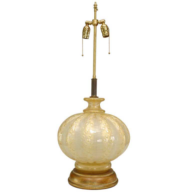 Italian 1940's Venetian large, bulbous table lamp composed of iridescent gold Murano glass formed with decorative tonal striations and air bubbles resting upon a round gilt wood base..