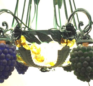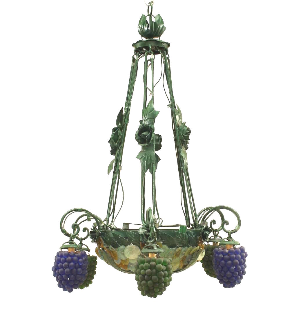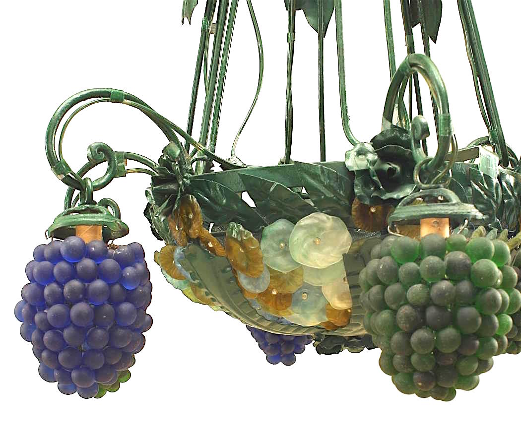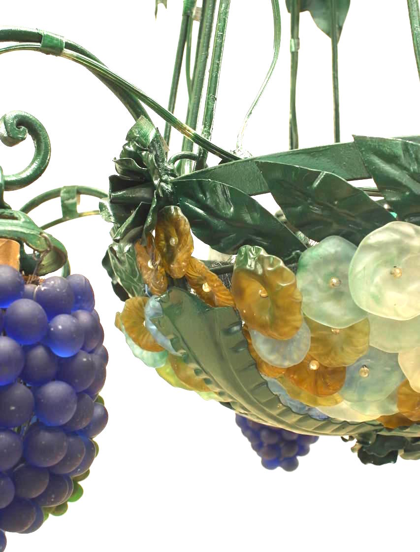 Italian Venetian 6 arm chandelier with green painted metal flowers and leaf design with a bowl base of blue/green flowers and 3 blue & 3 green Murano glass grape design shades..