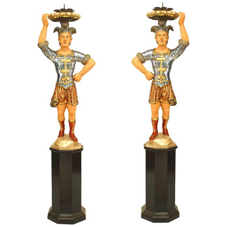 PAIR of Italian Venetian painted figures of young pages with polychromed blue shirts & red shorts and feathered headdress candle stand and supported on an 8 sided ebonized base..