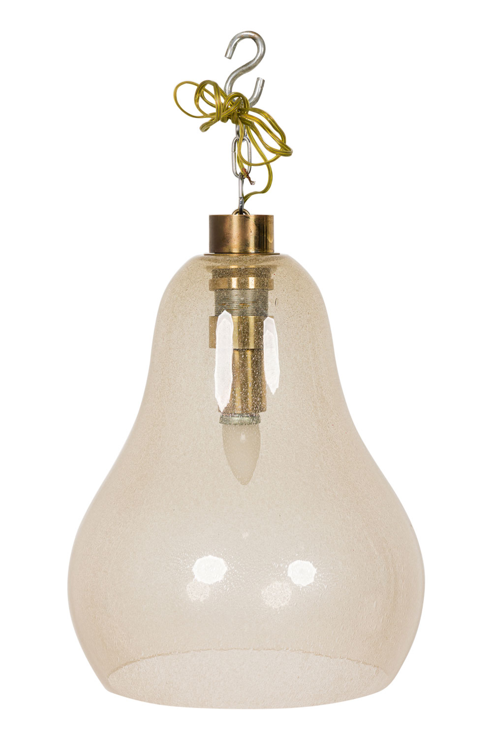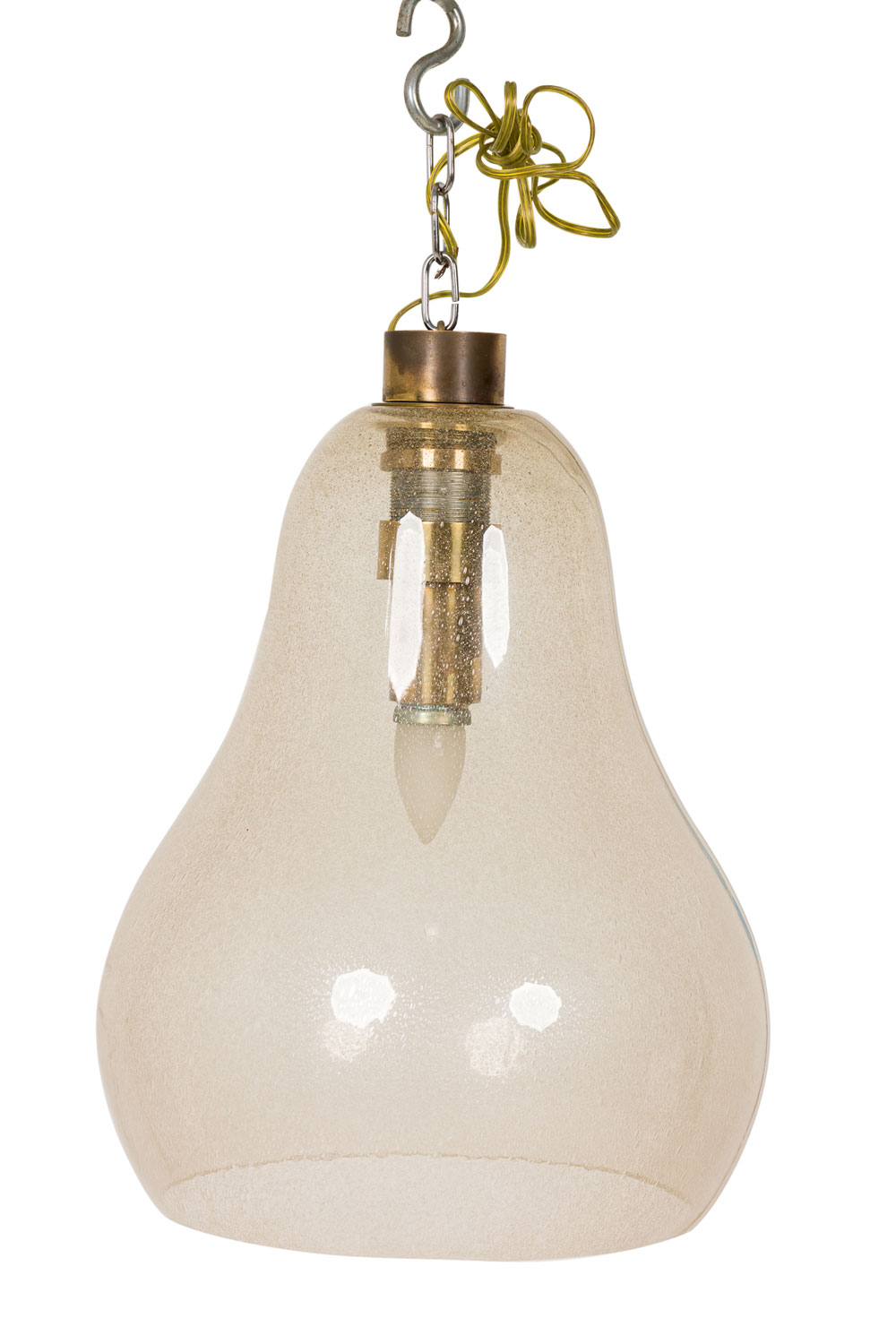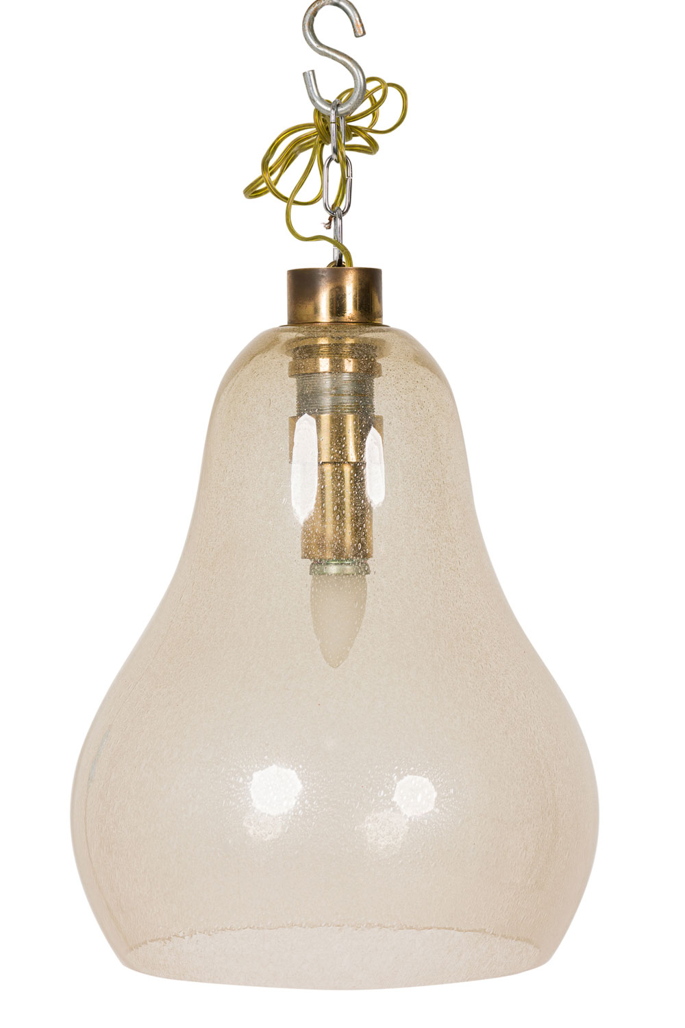 Italian 1940s Venetian Murano "Pulegoso" lantern with a gold dusted tear drop bell shaped glass shade with brass top and canopy..