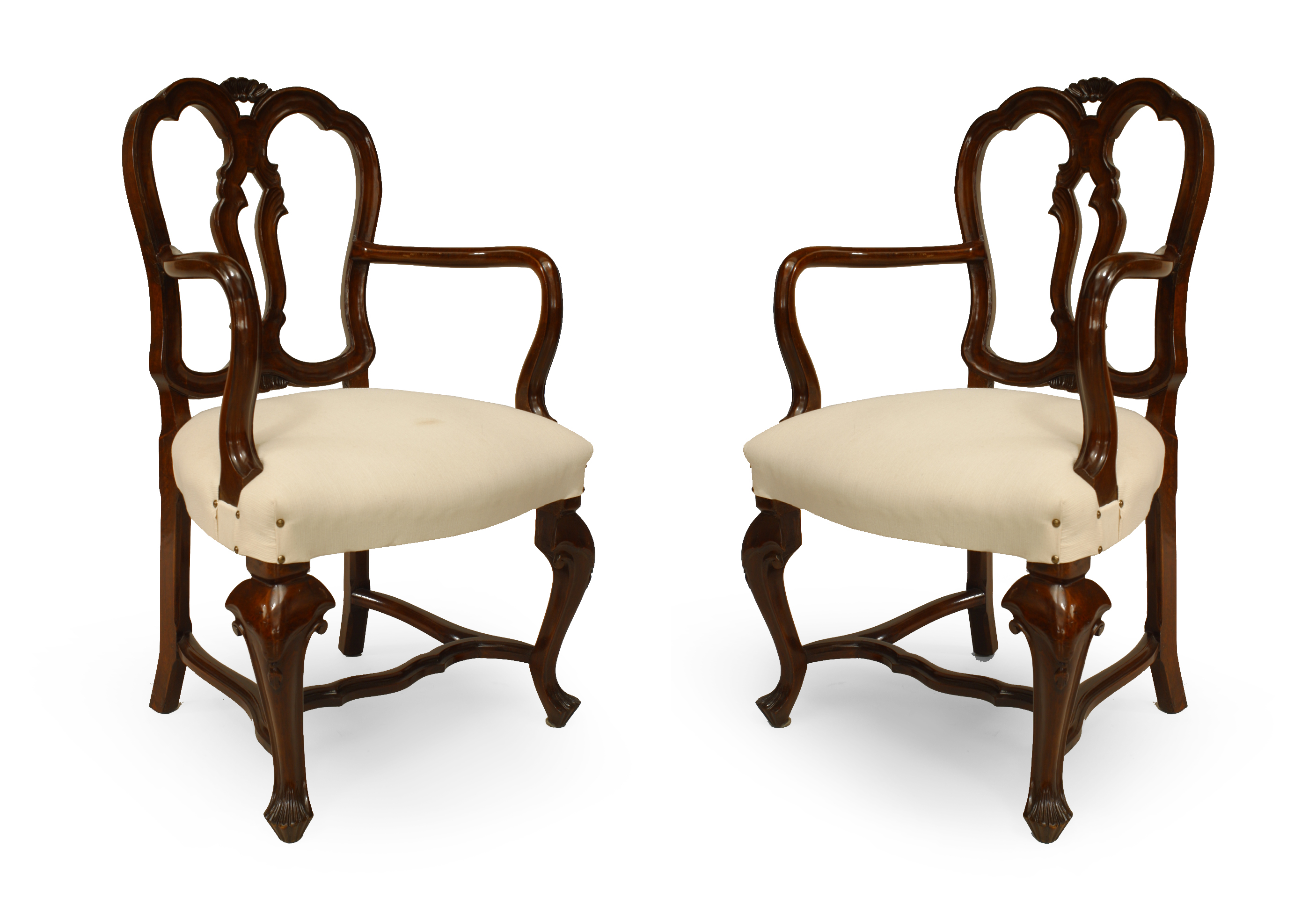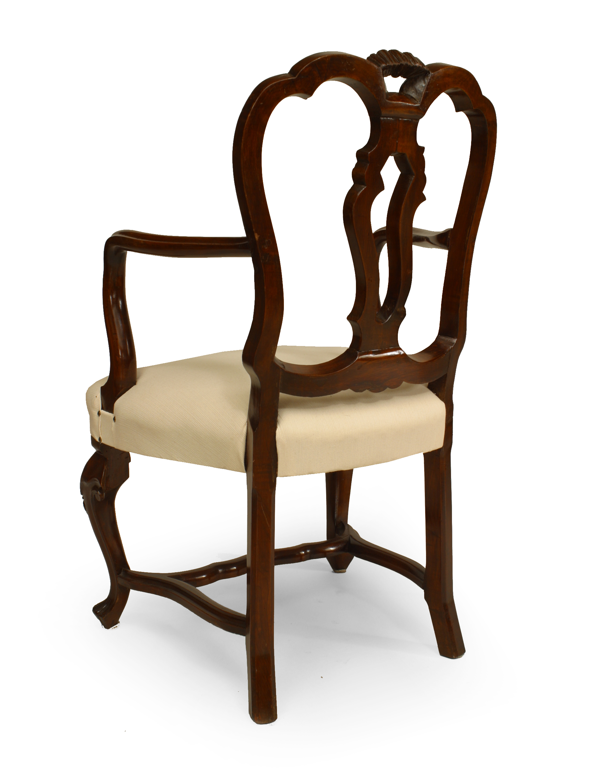 PAIR of Italian Venetian style (19th Cent) walnut open back Armchairs with stretcher and upholstered seat