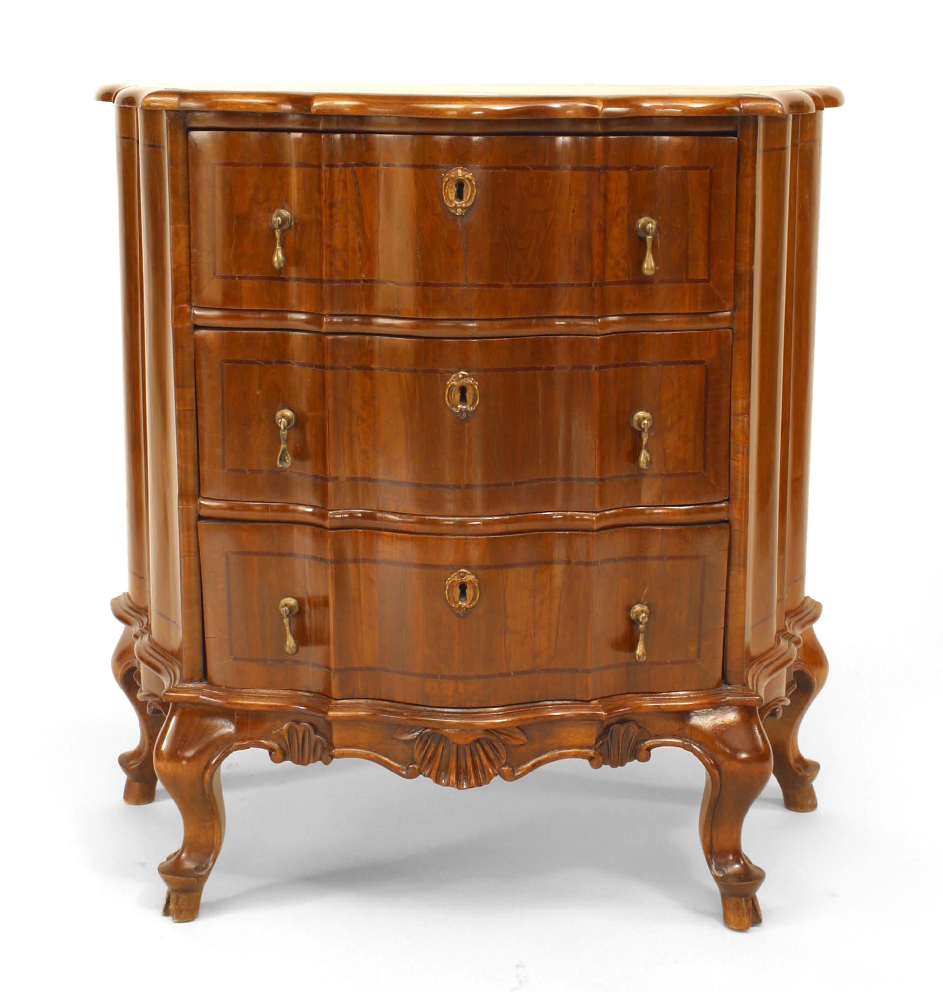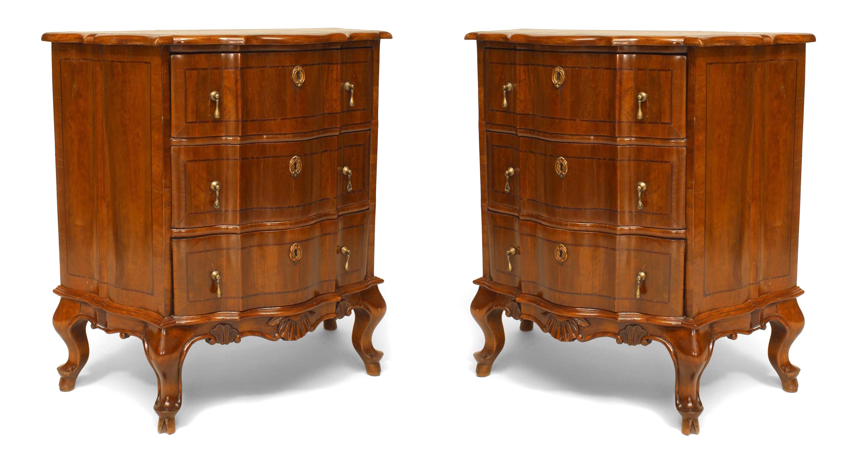 PAIR of Italian Venetian (19th Century) walnut bombe-shaped bedside commodes with banded inlay and three drawers. (PRICED AS PAIR)