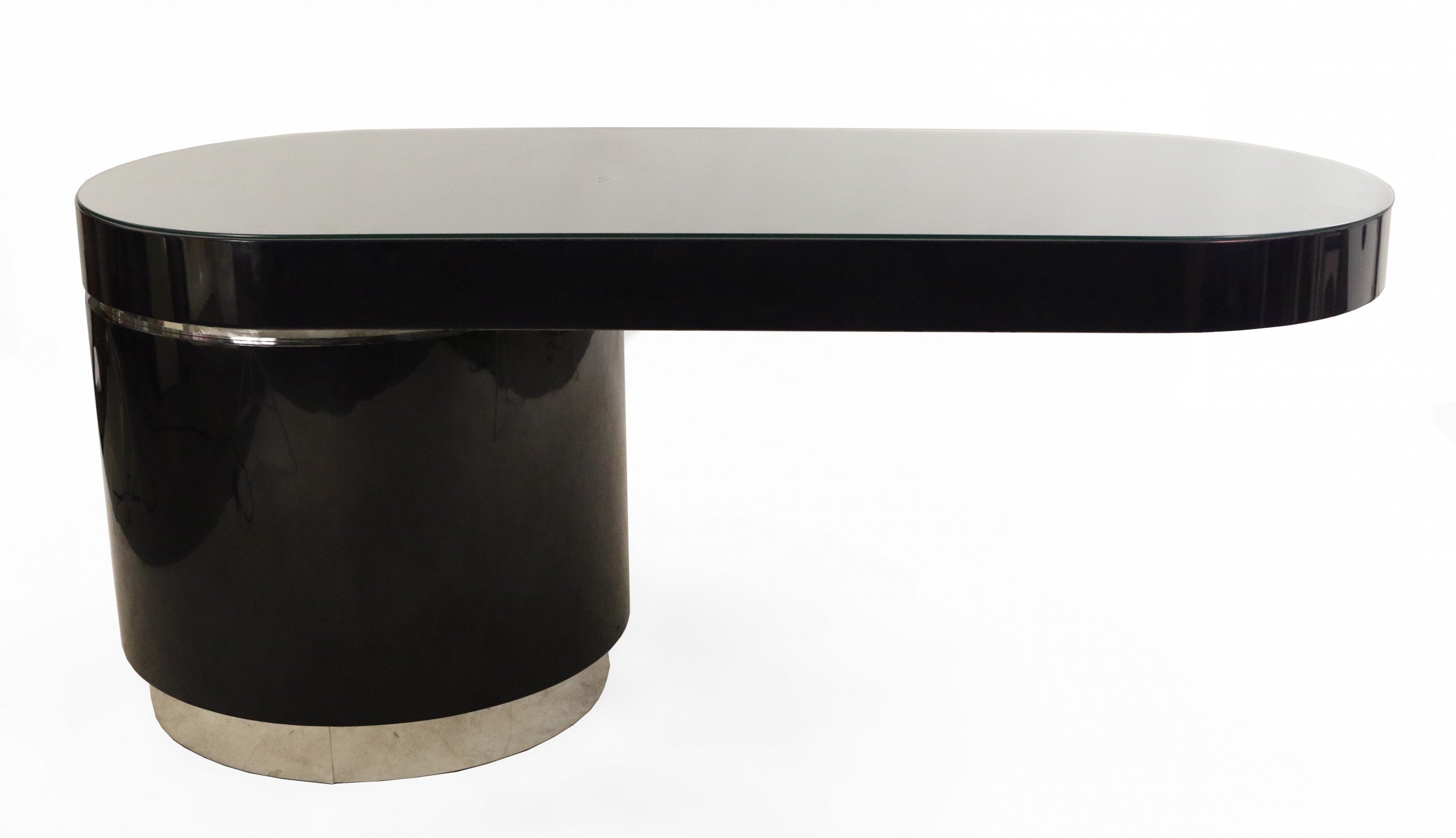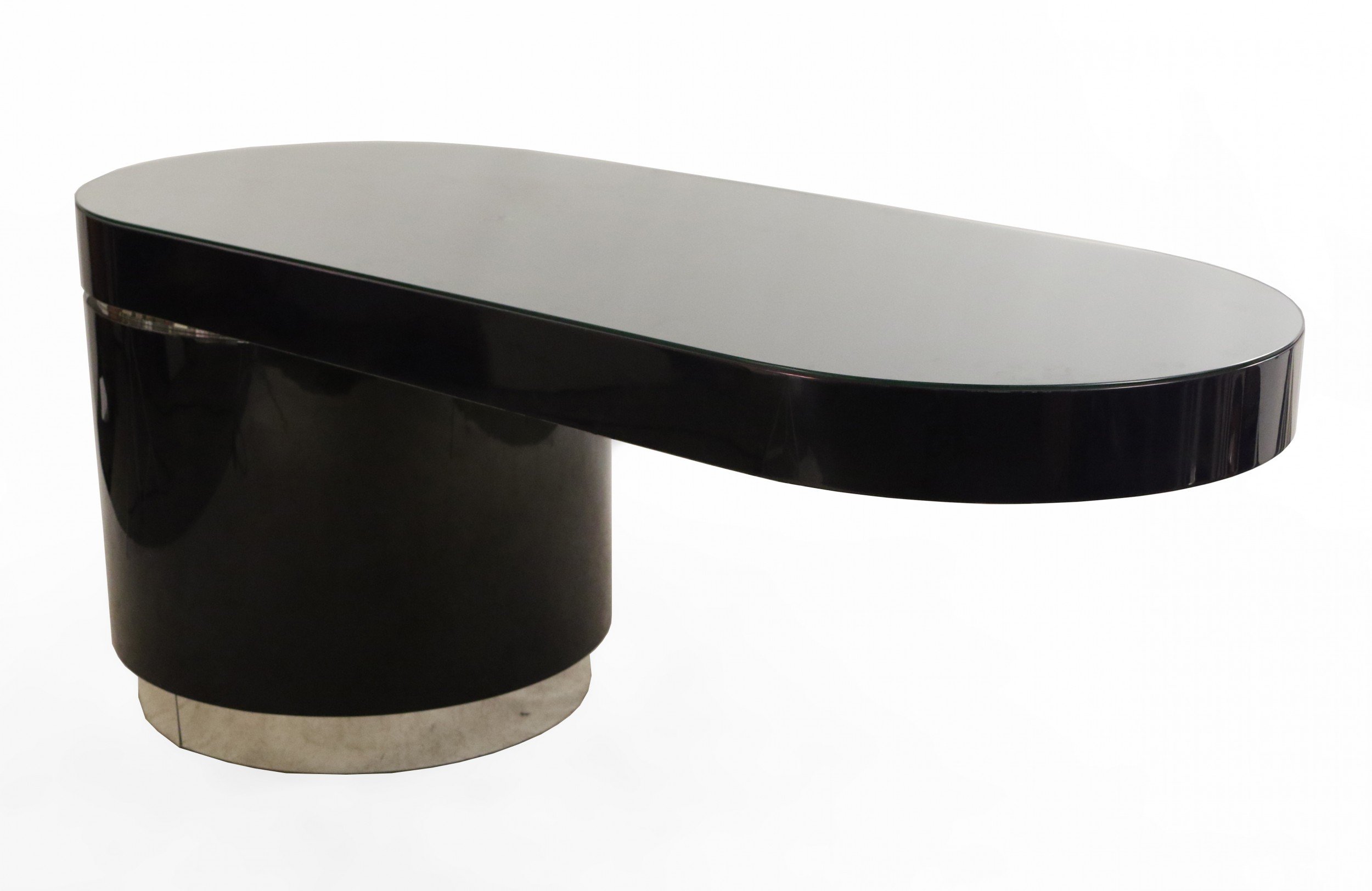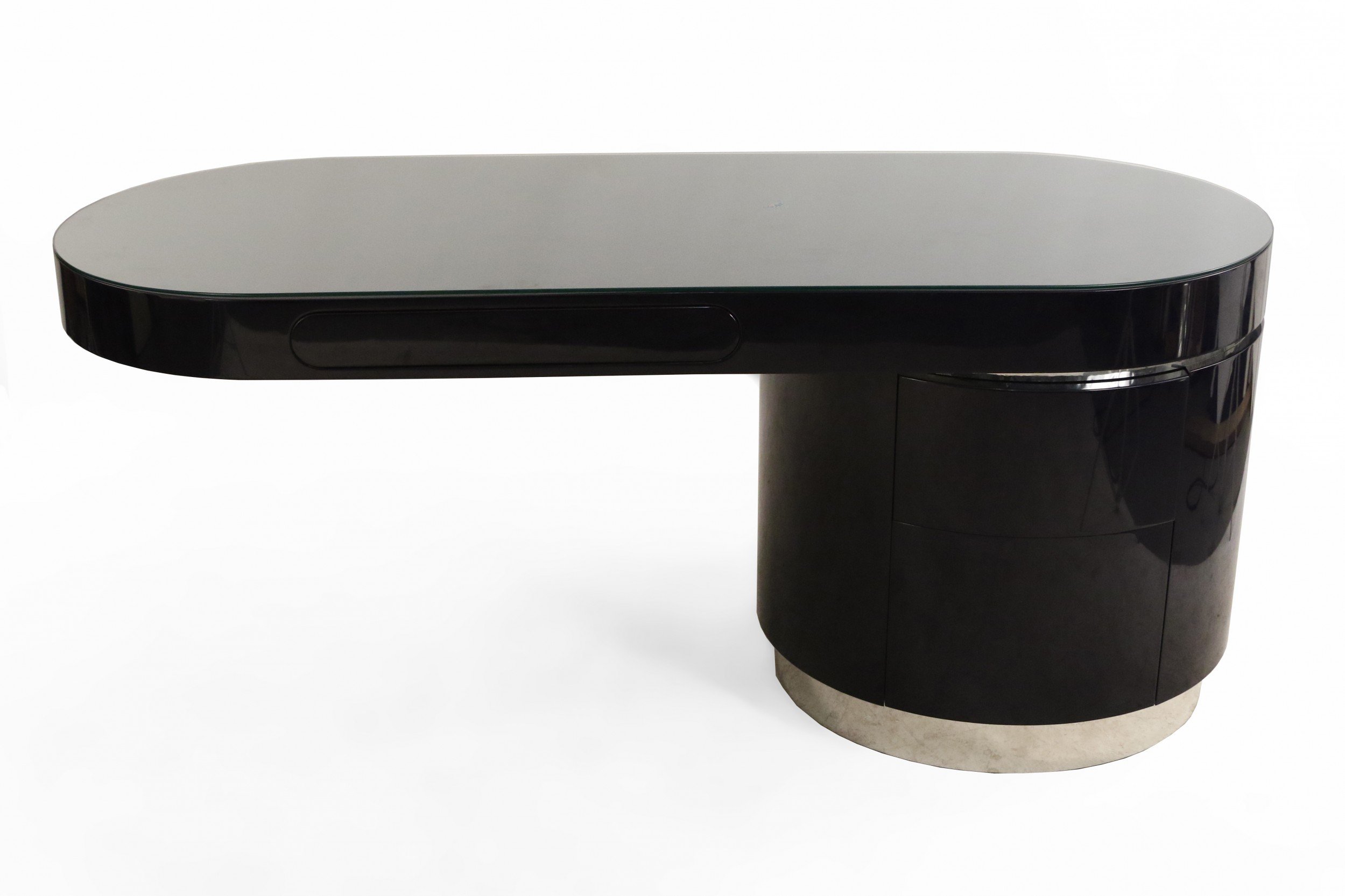 Mid-Century Modern American high gloss navy blue "Ponte" desk with an oval top having a glass top & a single drawer supported on a single side round pedestal base with two drawers. (J. WADE BEAM FOR BRUETON)