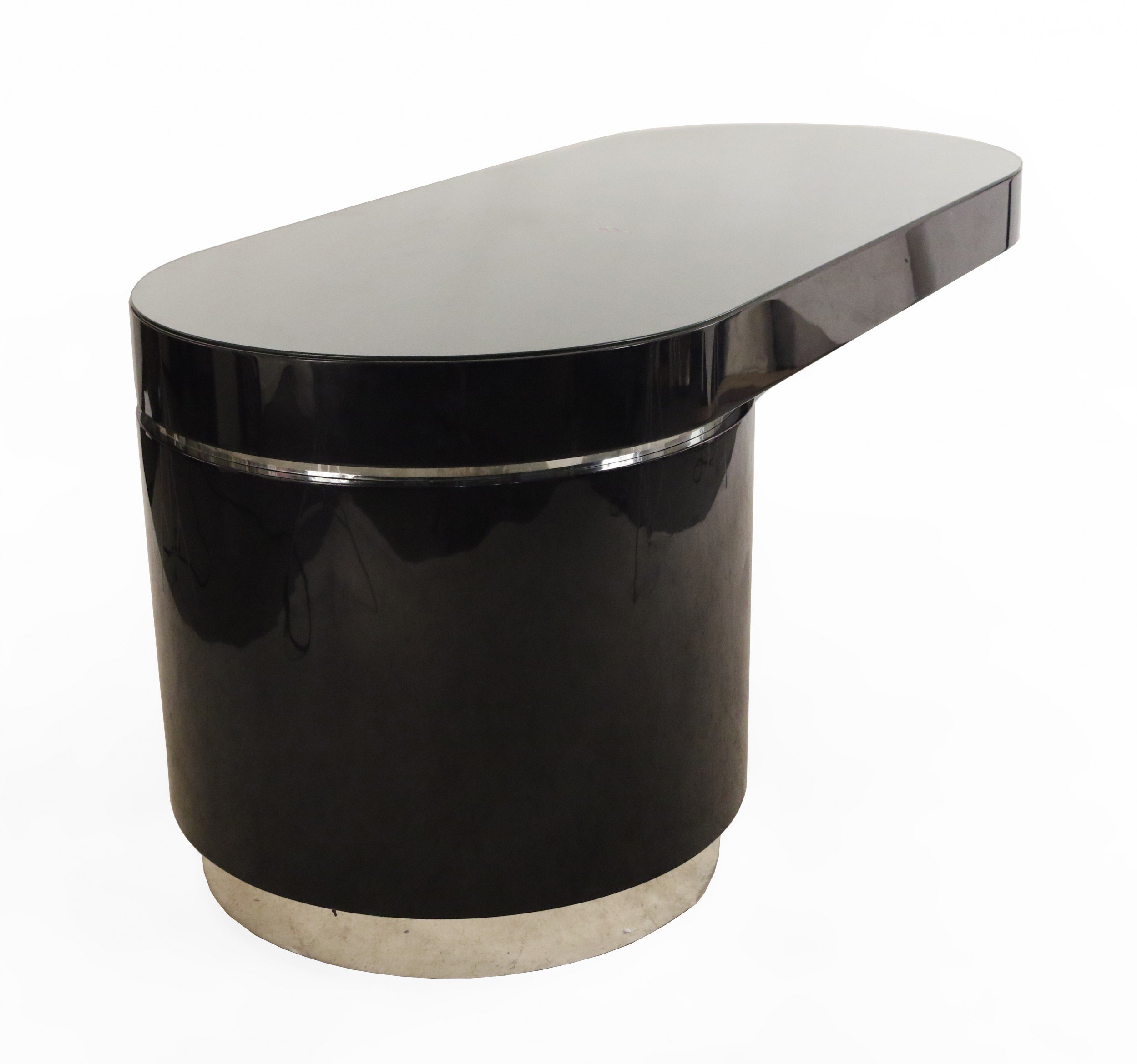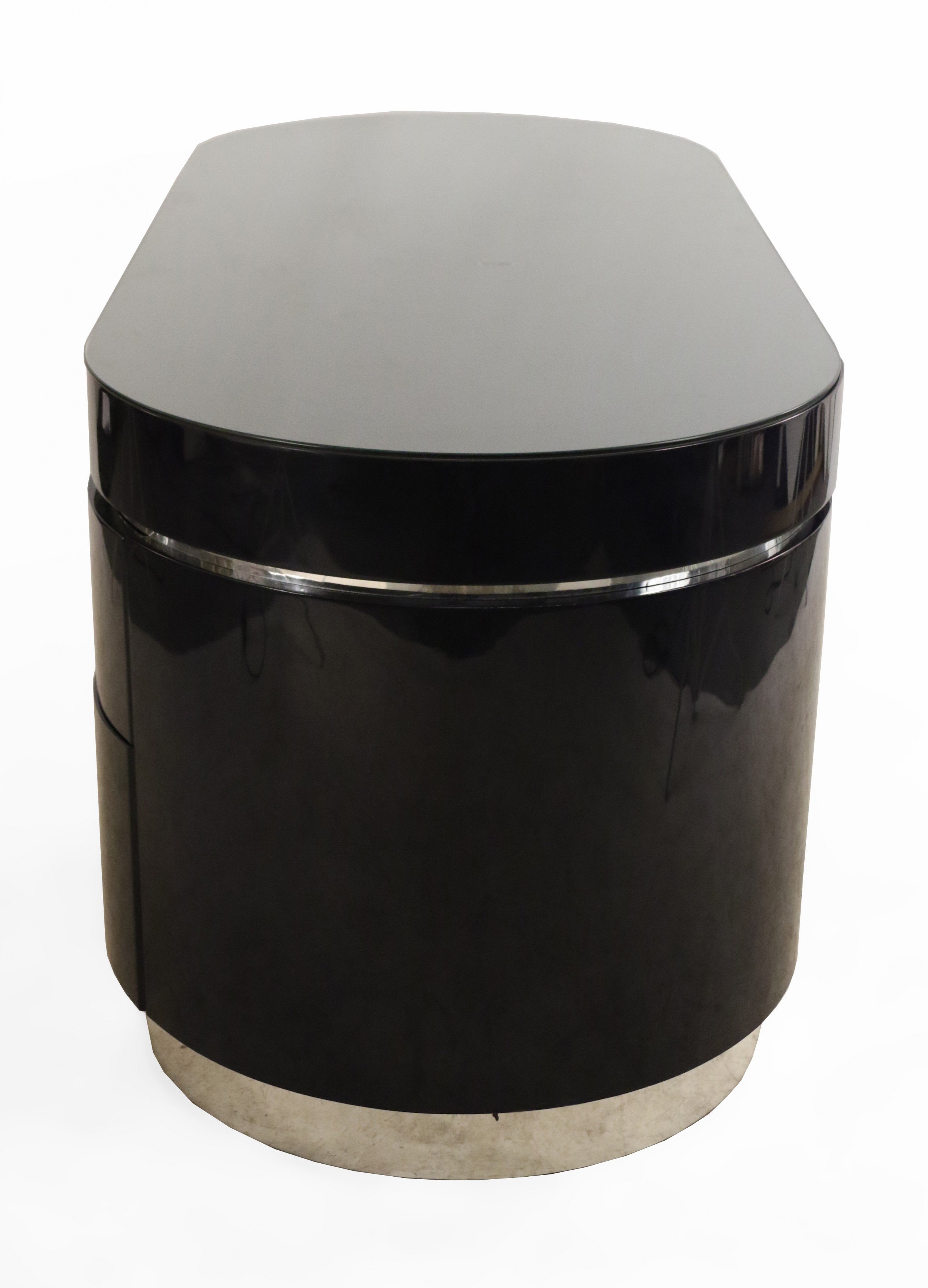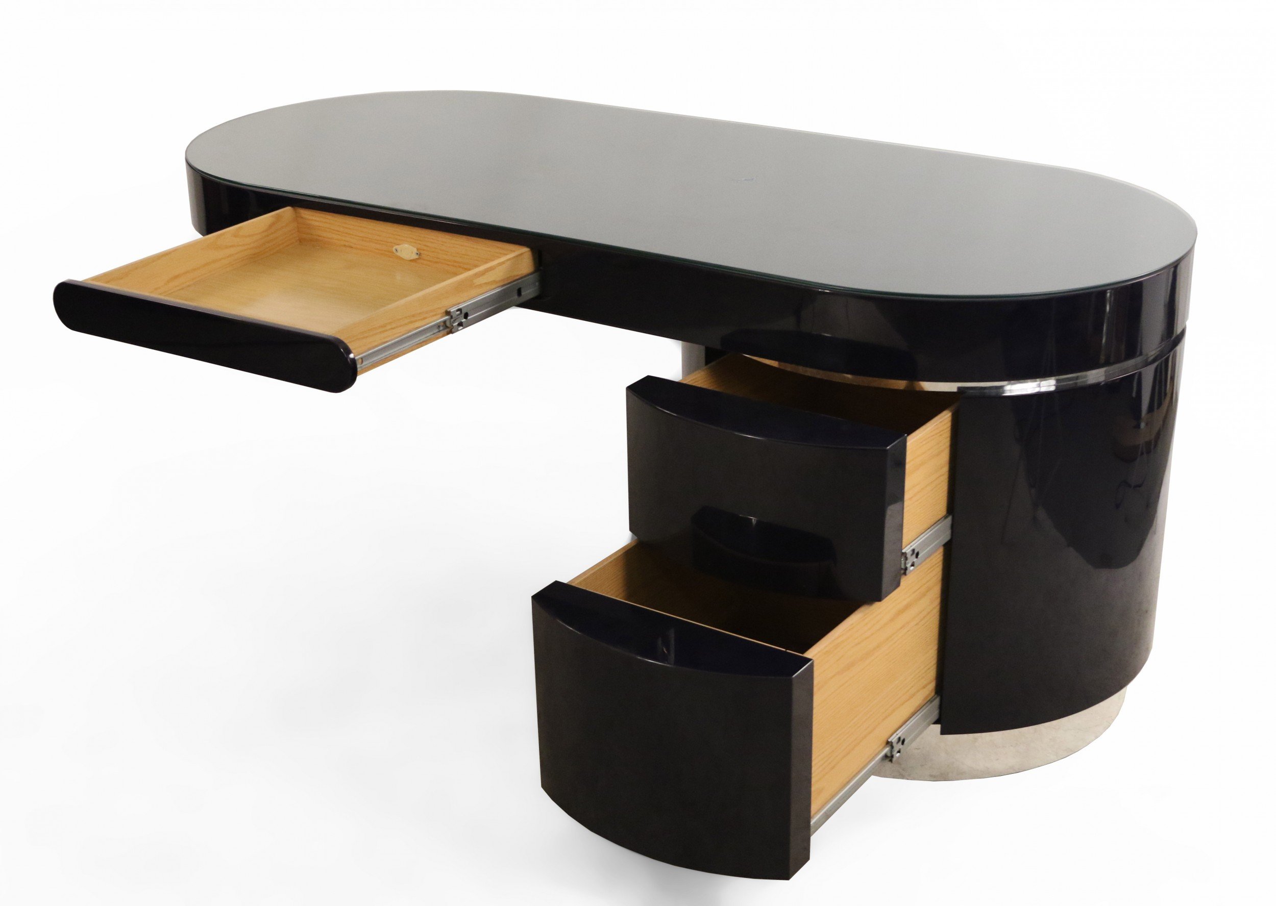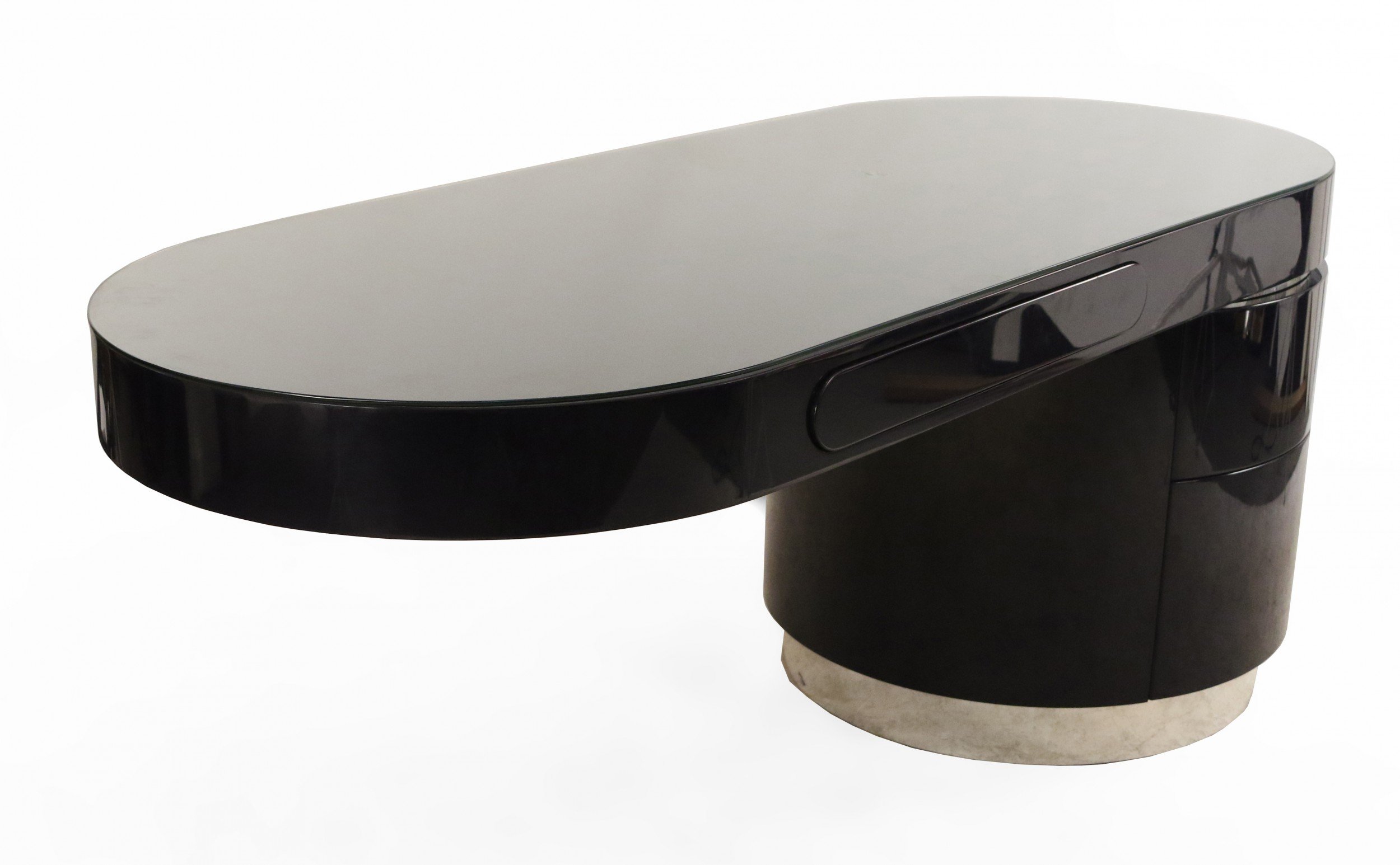 Mid-Century Modern American high gloss navy blue "Ponte" desk with an oval top having a glass top & a single drawer supported on a single side round pedestal base with two drawers. (J. WADE BEAM FOR BRUETON)