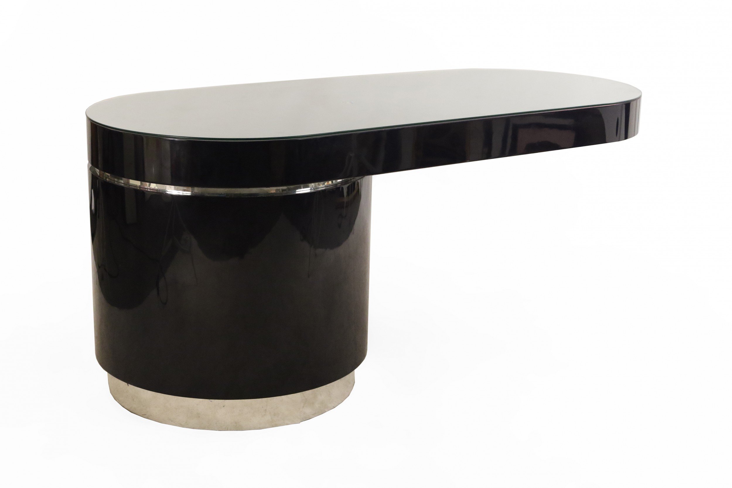 Mid-Century Modern American high gloss navy blue "Ponte" desk with an oval top having a glass top & a single drawer supported on a single side round pedestal base with two drawers. (J. WADE BEAM FOR BRUETON).