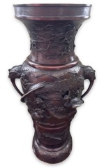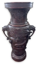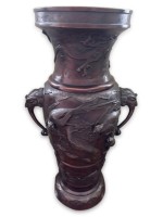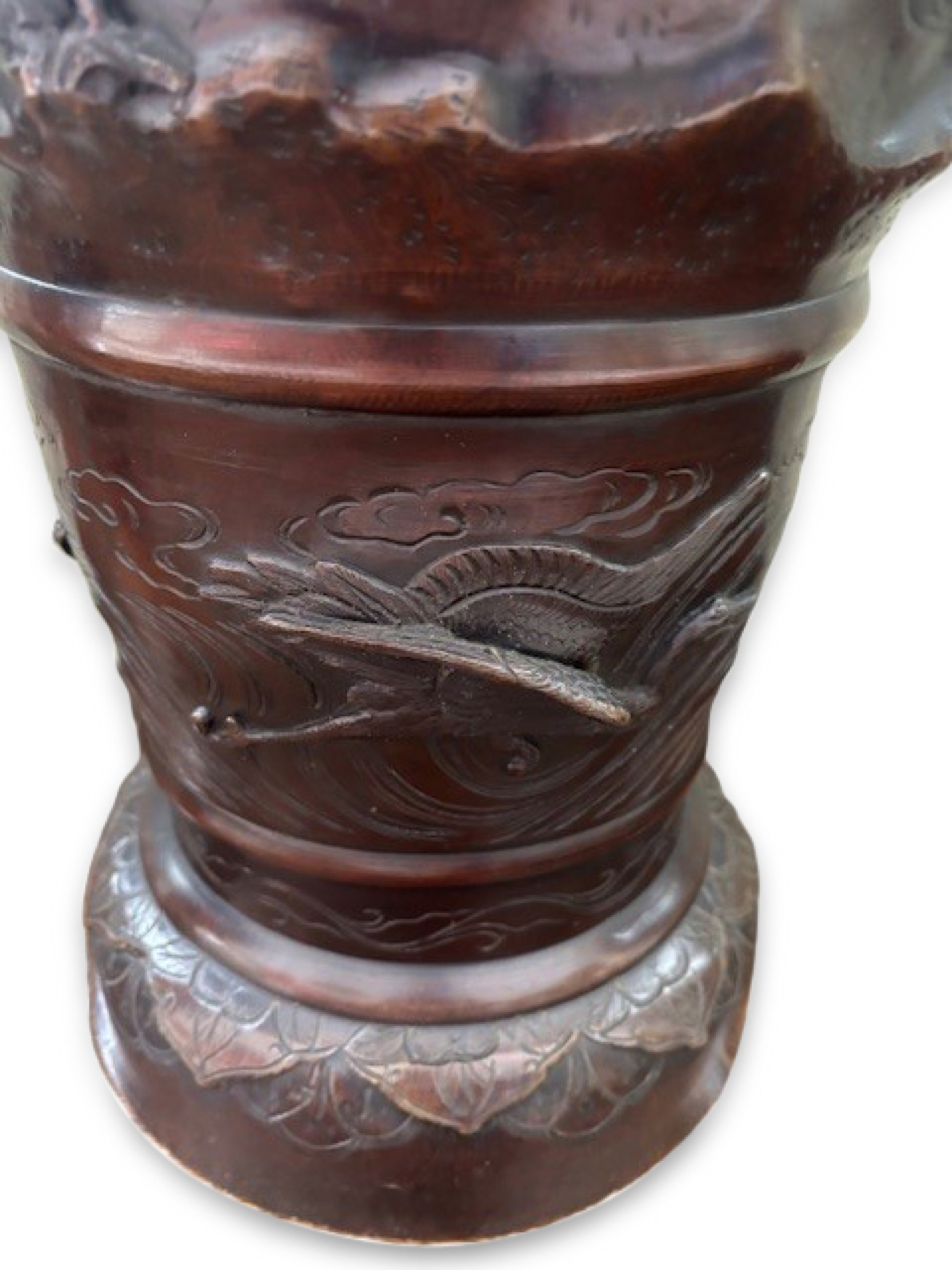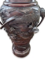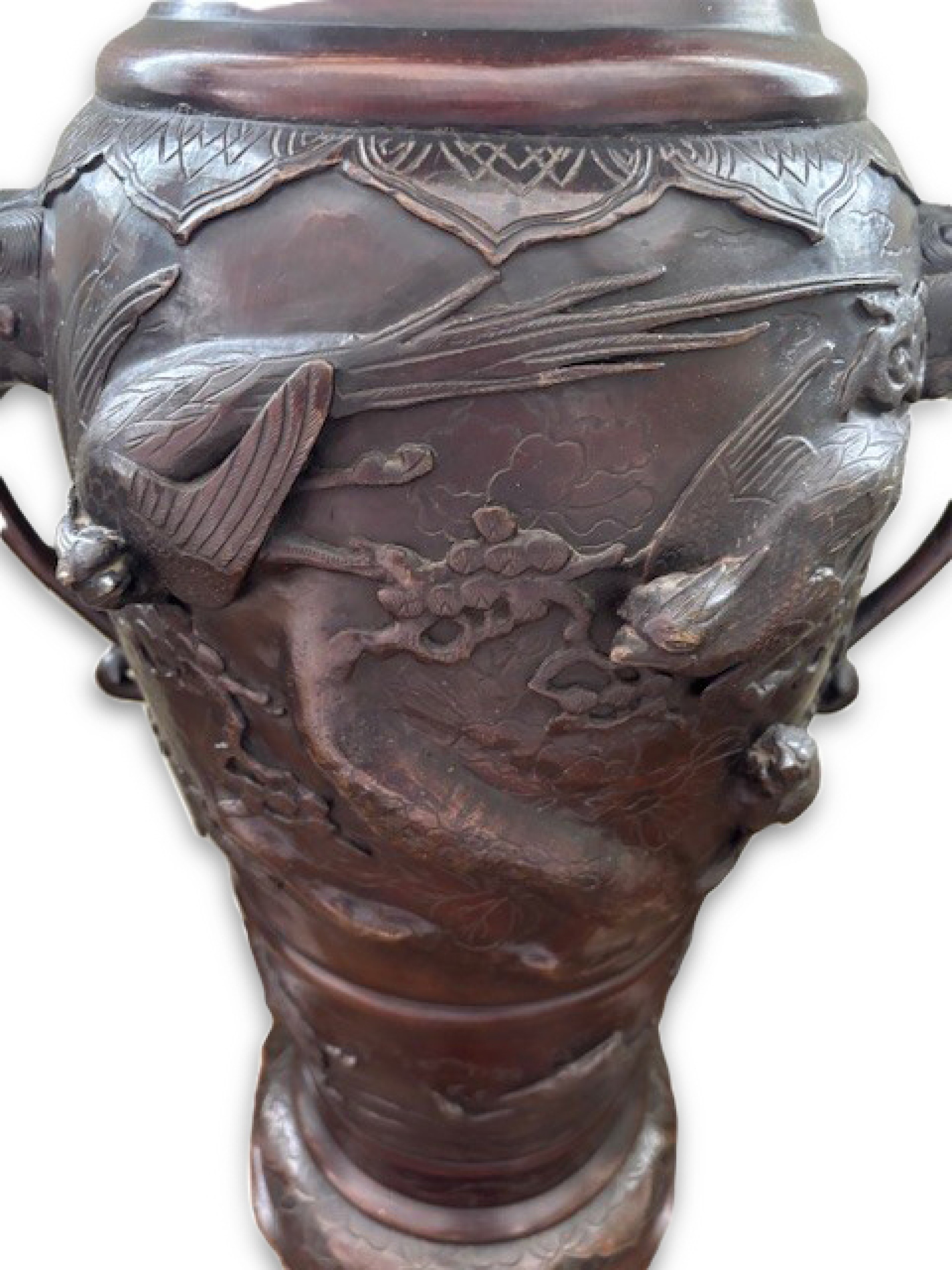 Pair of Japanese tall bronze floor vases with handles and bird relief