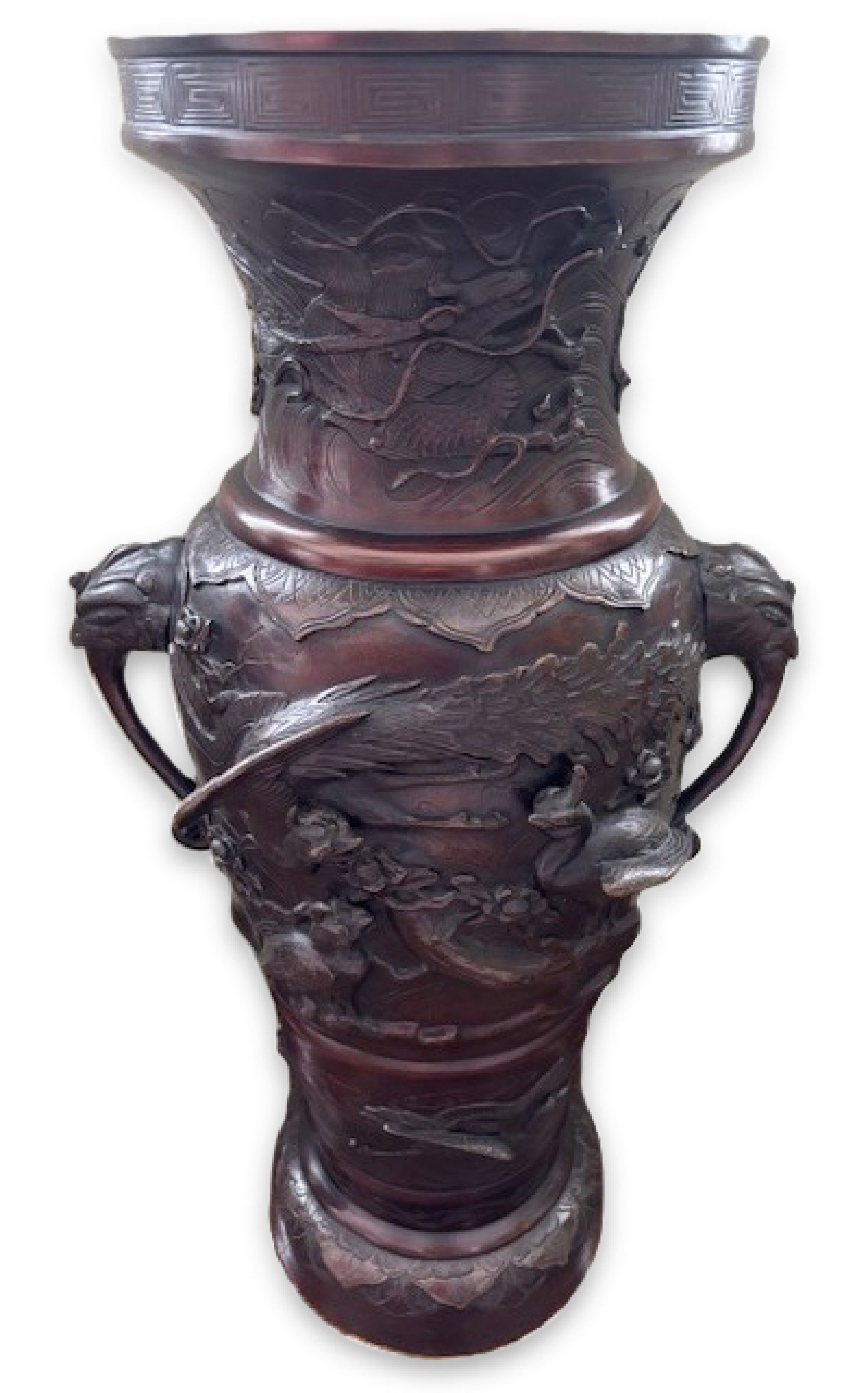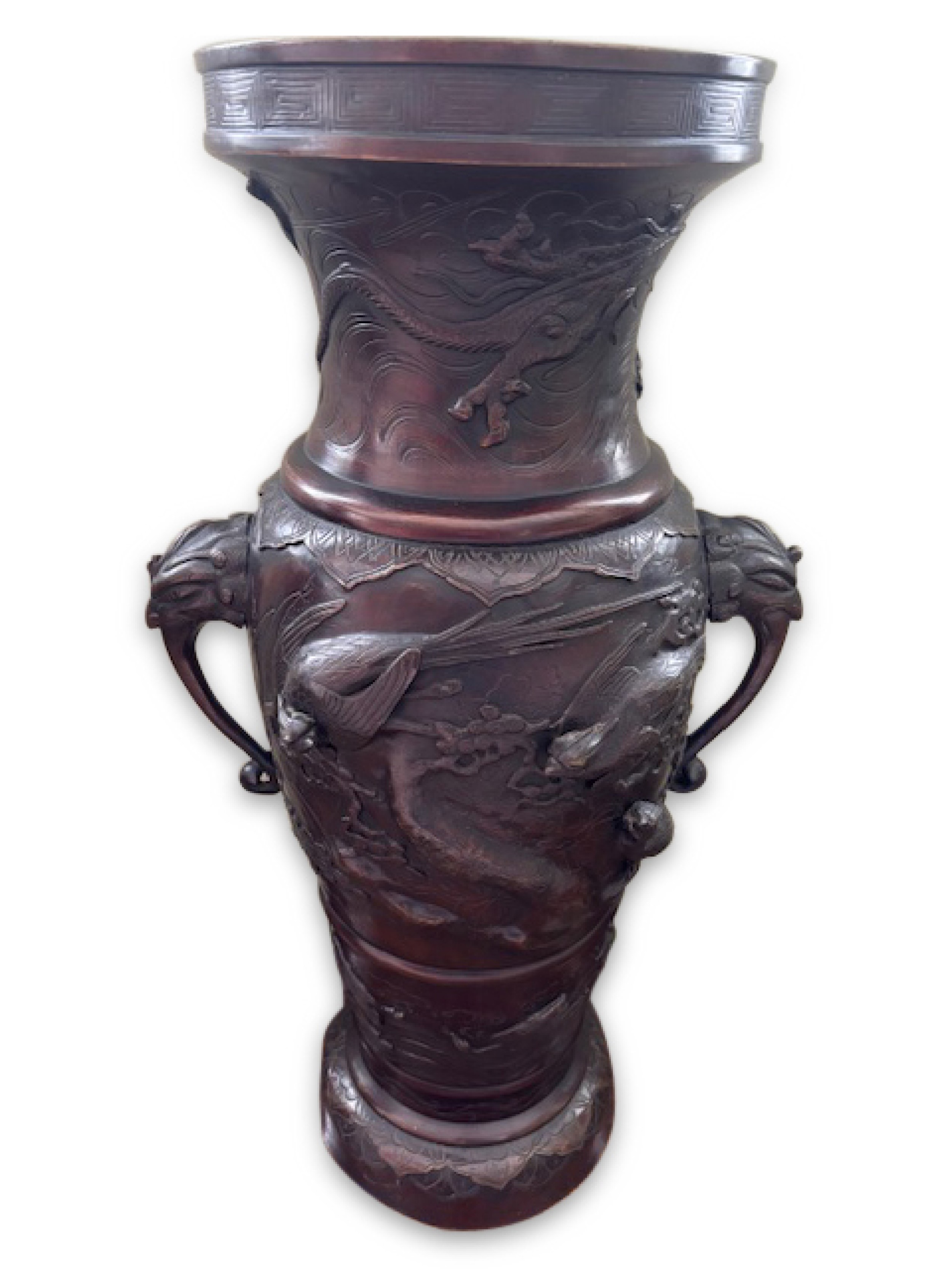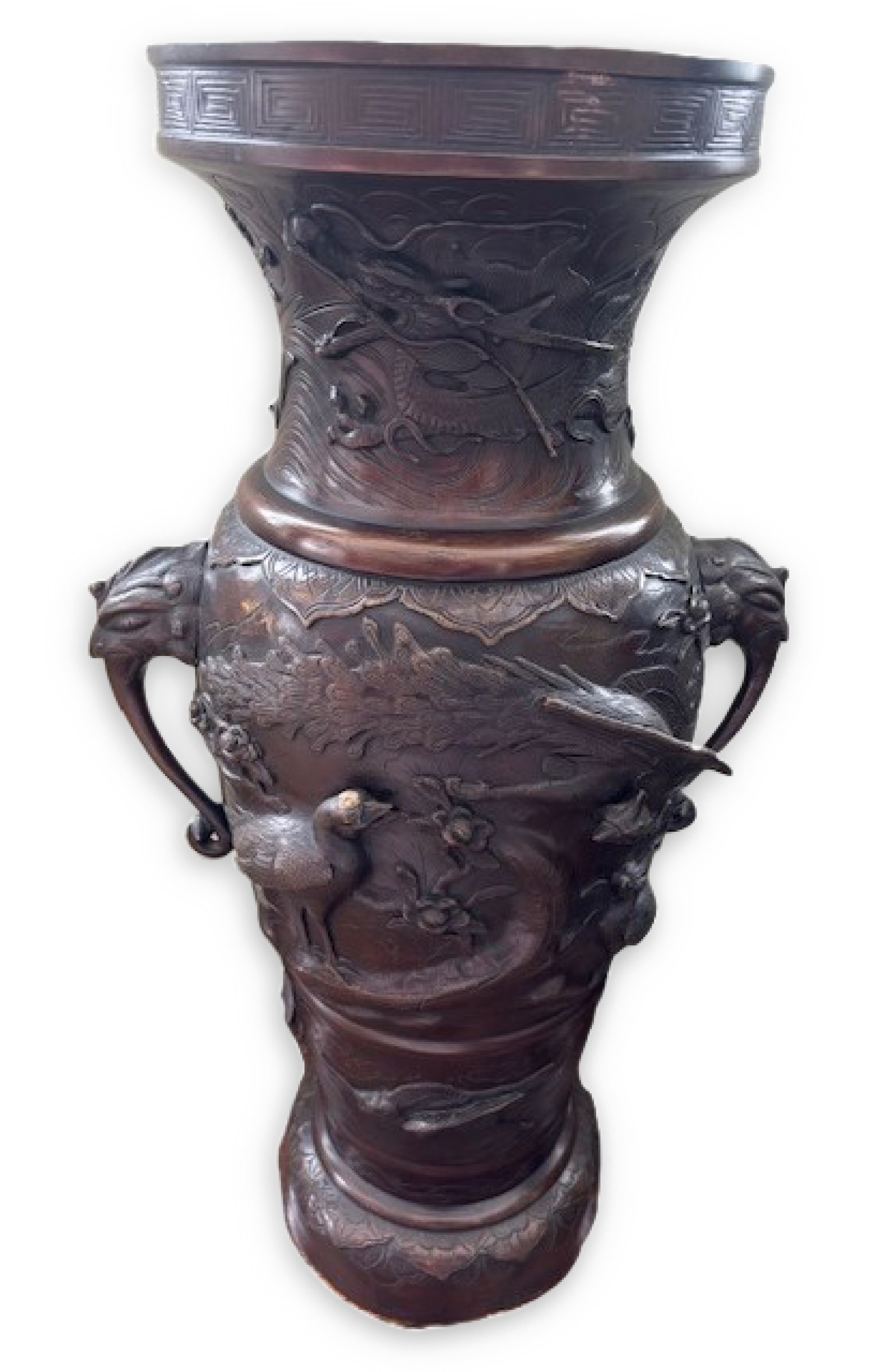 PAIR of Japanese (19th Century) tall bronze floor vases with handles having bird and floral relief (PRICED AS PAIR)