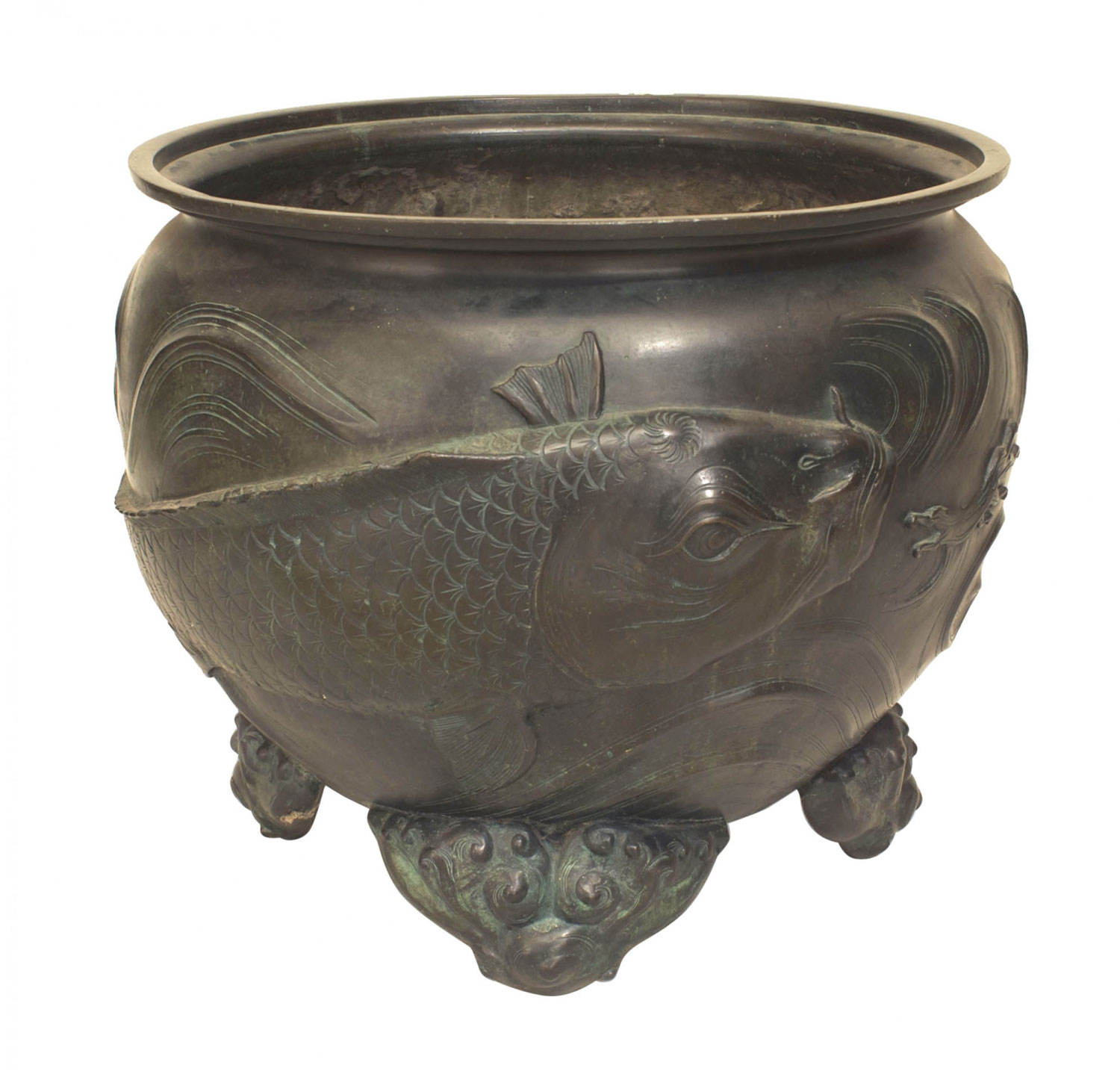 Oriental Japanese (19th Century) bronze large jardiniere with a green patina and carp in relief and raise on 4 cloud form feet (Koyoto School; Meiji Period).