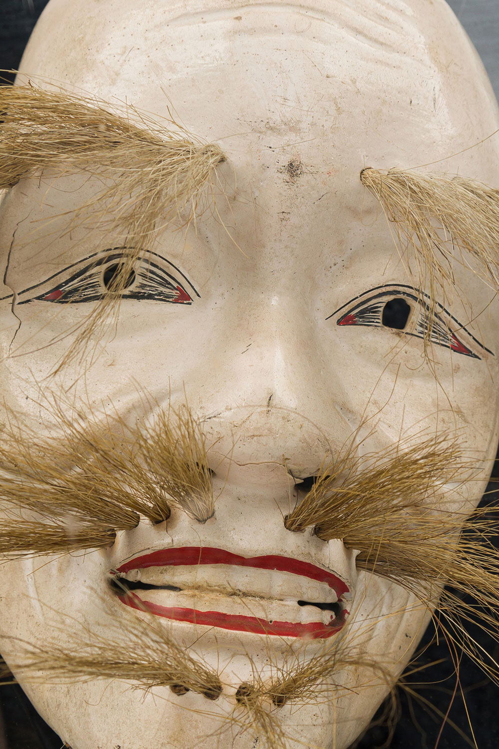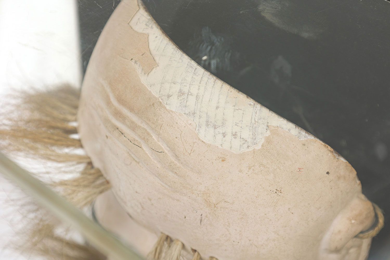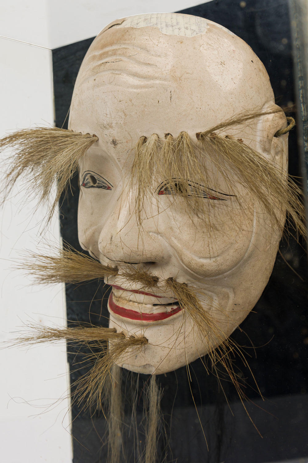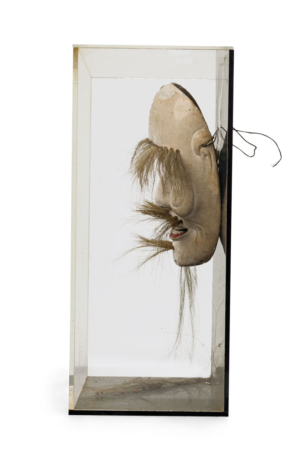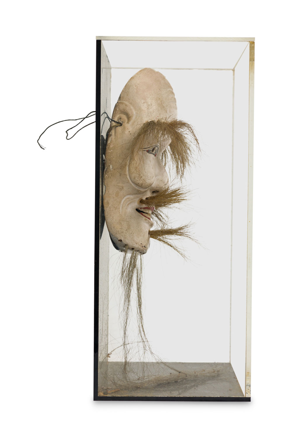 Style: Asian Materials & Techniques: Ceramic, lucite, painted, plastic Category: Cleared Art, Rugs/Textile Condition: Some wear on shadow box, some mask losses & hair accumulation on bottom Good; Minor losses