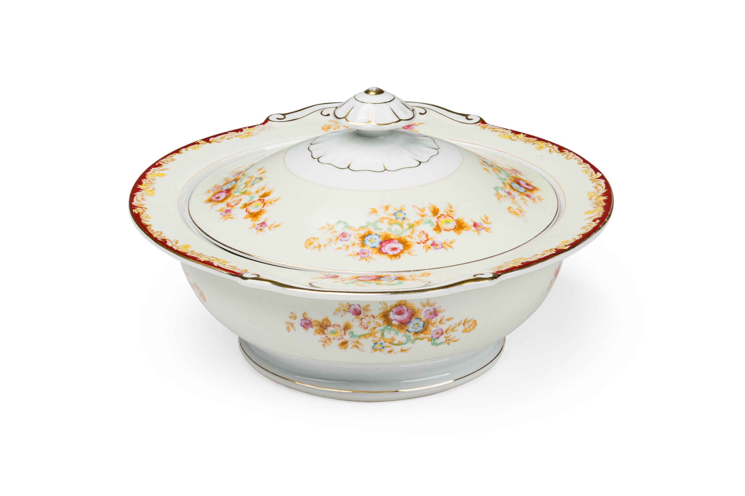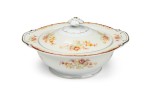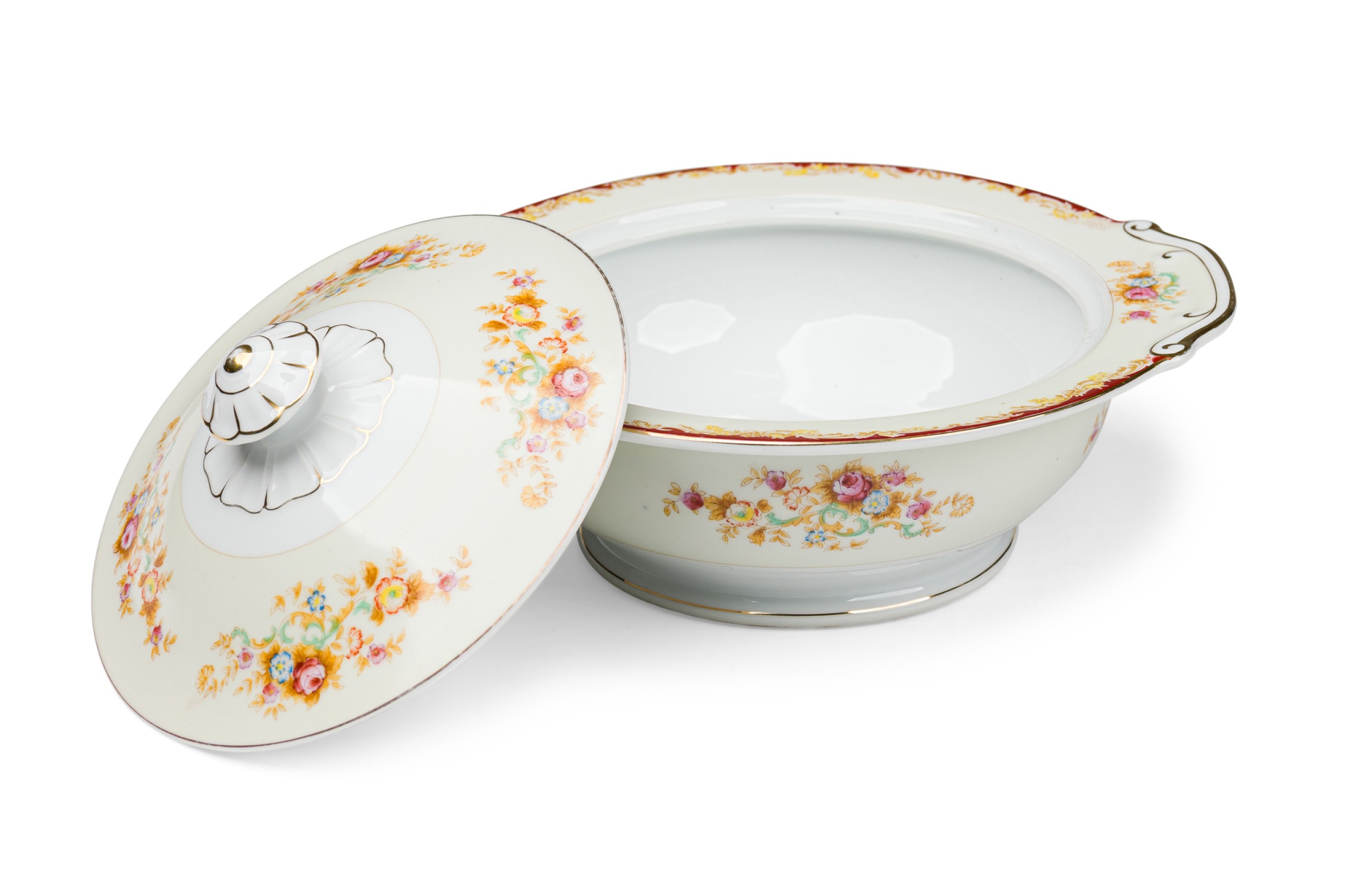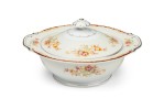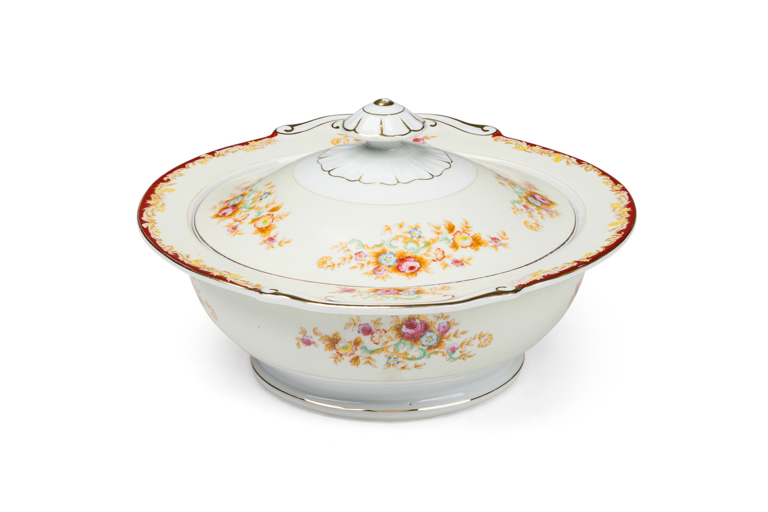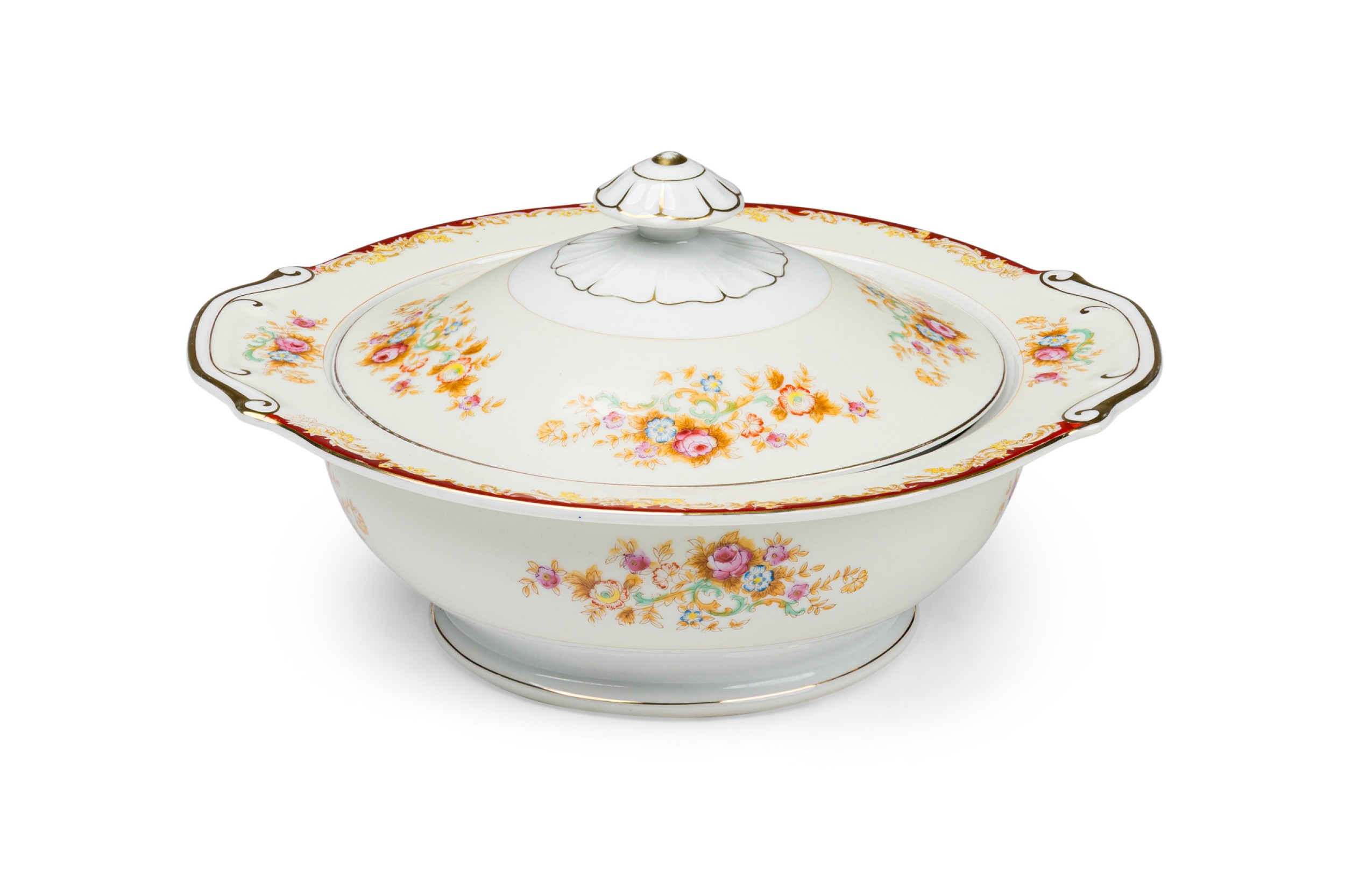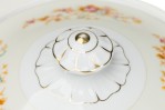Vintage Japanese hand painted floral vegetable dish with gilt trimmed handle, base and floral finial