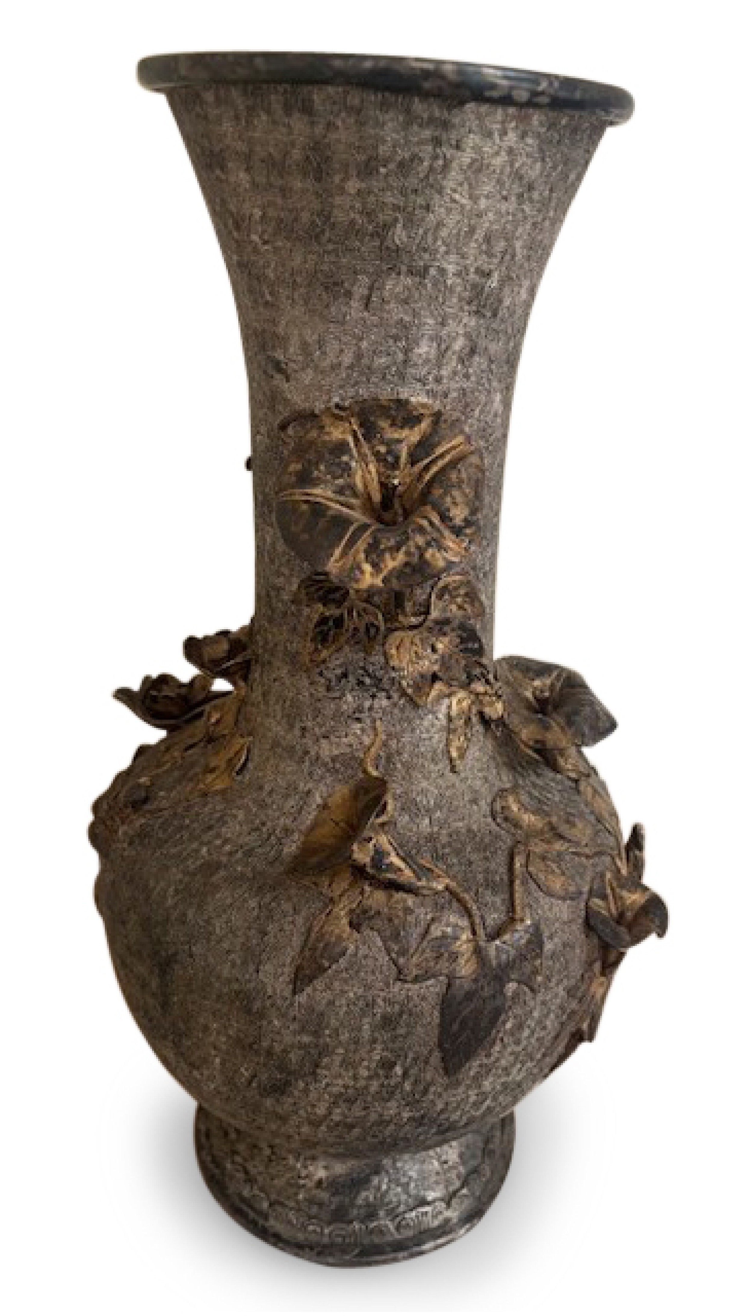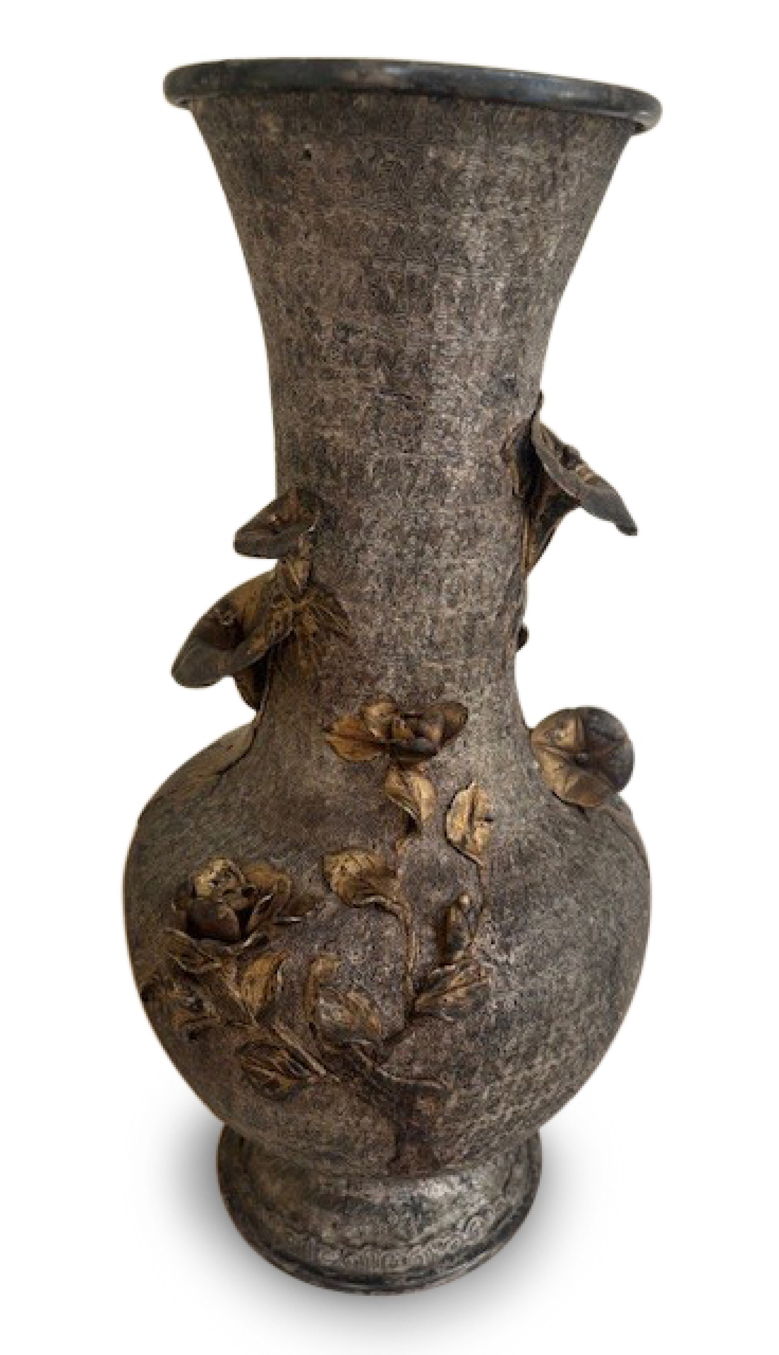 Japanese Meiji bronze vase with a silver and gilt trim finish having a relief of flowers with a boulbous base over a tapered neck