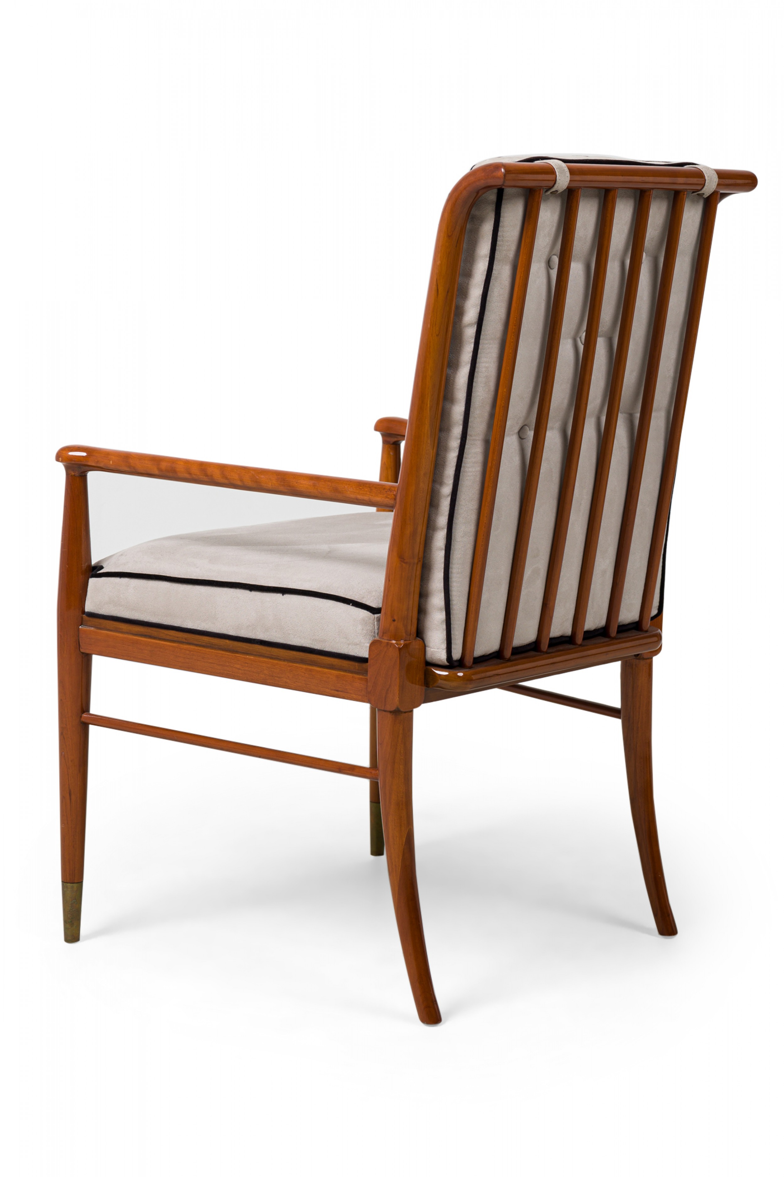 Mid-Century American (1950s) walnut armchair featuring a curved back with 5 pierced slats on sabre back legs, gray suede upholstered back and seat, button tufted with black piping, plus 2 horizontal stretchers and brass sabots on the front legs. (JOHN STUART).