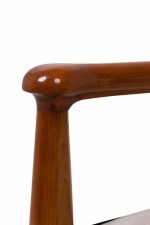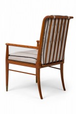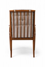 Mid-Century American (1950s) walnut armchair featuring a curved back with 5 pierced slats on sabre back legs, gray suede upholstered back and seat, button tufted with black piping, plus 2 horizontal stretchers and brass sabots on the front legs. (JOHN STUART)